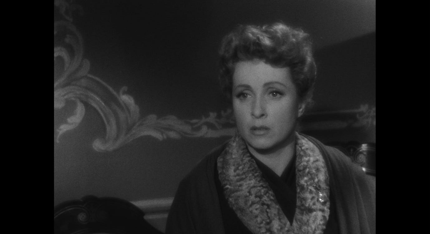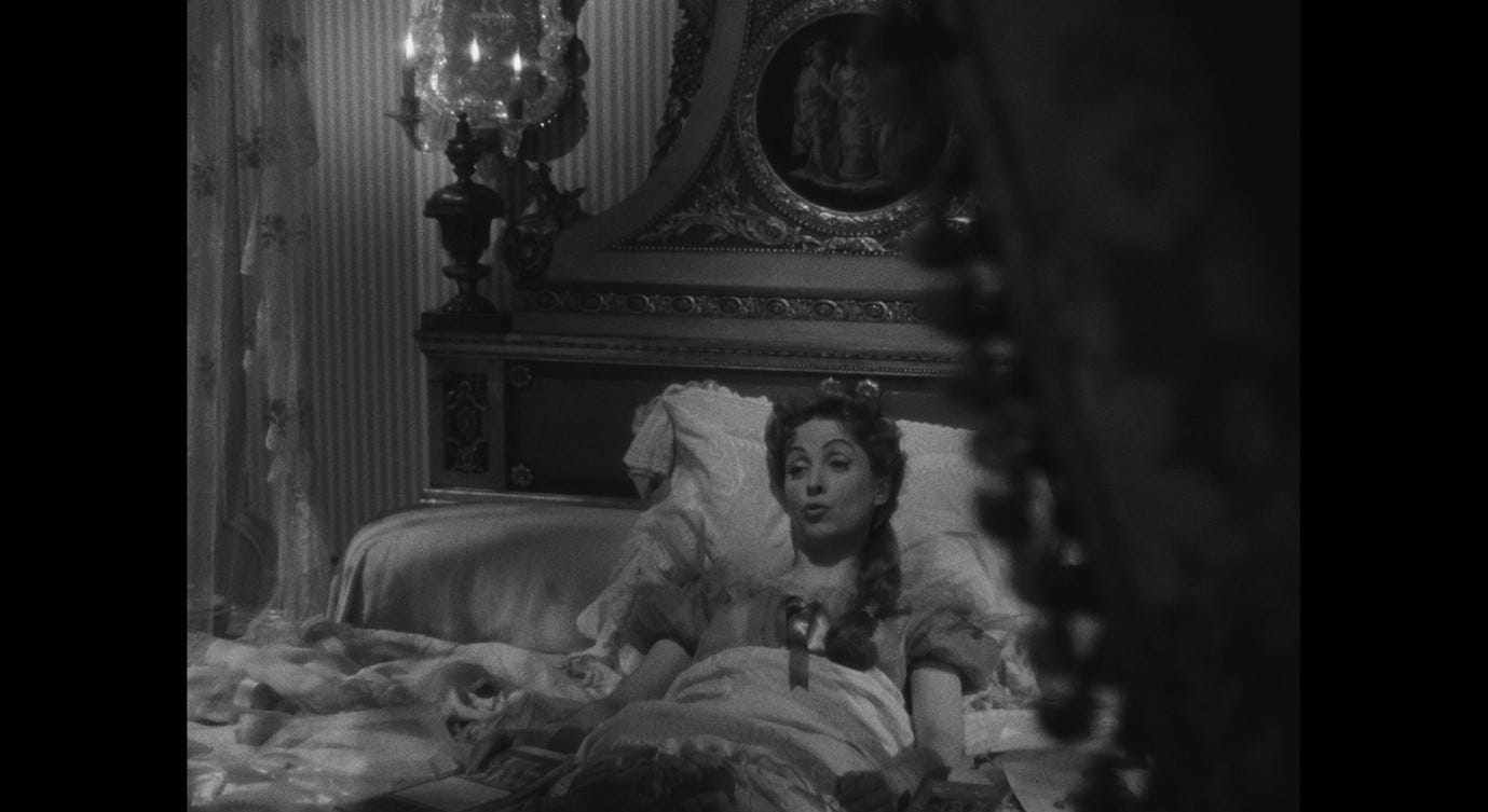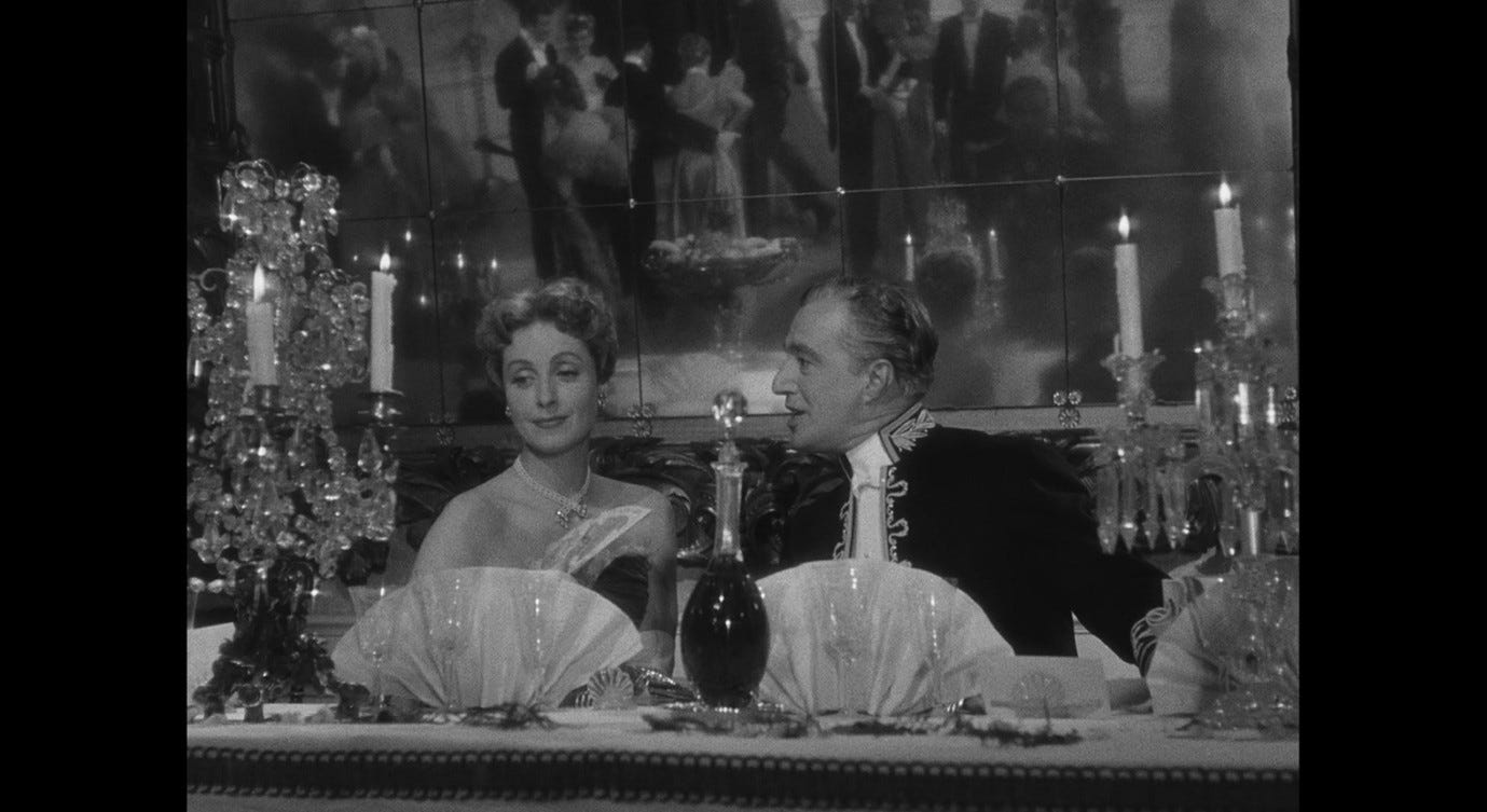 Ophüls, like Antonioni, is often drawn to characters who become self-aware about the larger structures they find themselves operating in, and who struggle with the conflict between those structures and their own needs and desires. At the start of Madame de…, Louise needs money and pawns her earrings; at the end, she needs Donati to live and gives her earrings away in an attempt to save him. The point is not so much that she becomes less materialistic or more pious, but rather that her need for human connection overrides all other concerns, to the extent that it ultimately kills both Donati and (when she learns of his death) Louise herself. ‘I detest the world,’ she tells her lover. ‘I only want to be seen by you.’