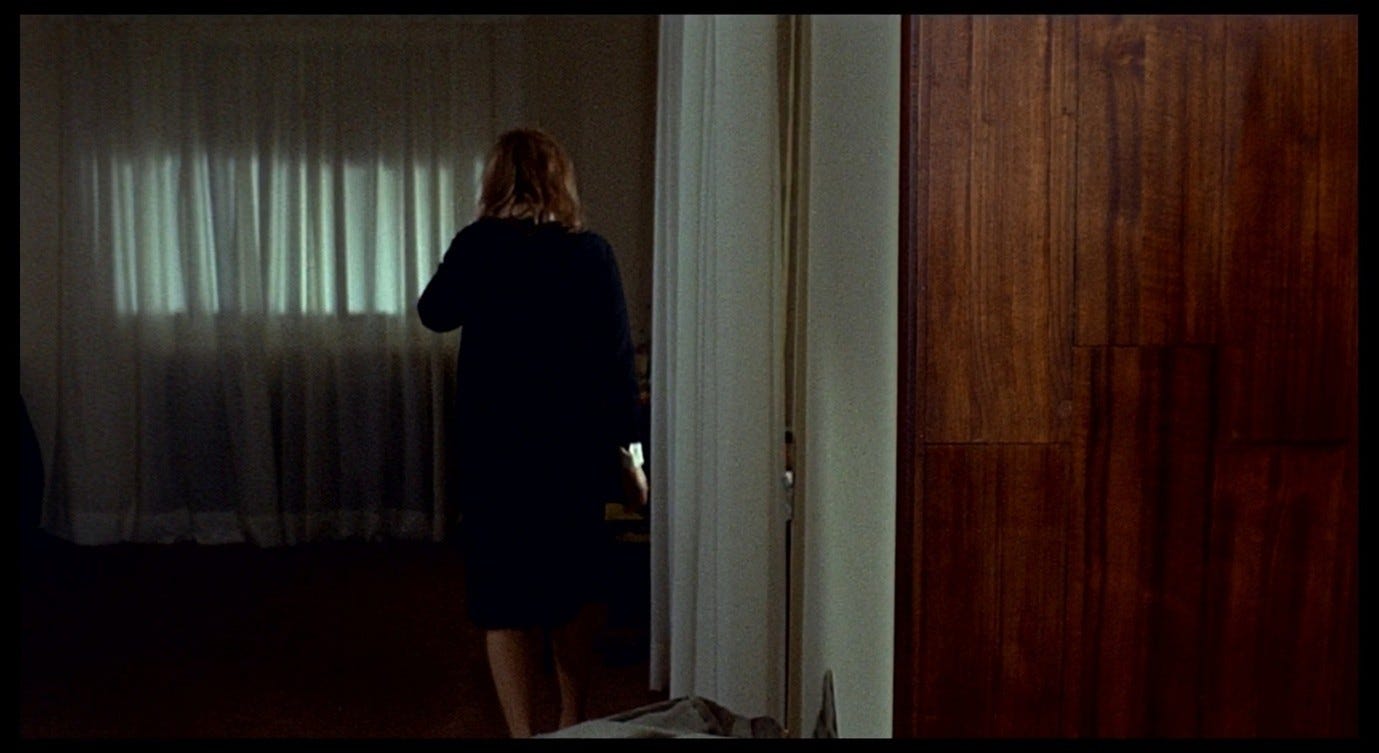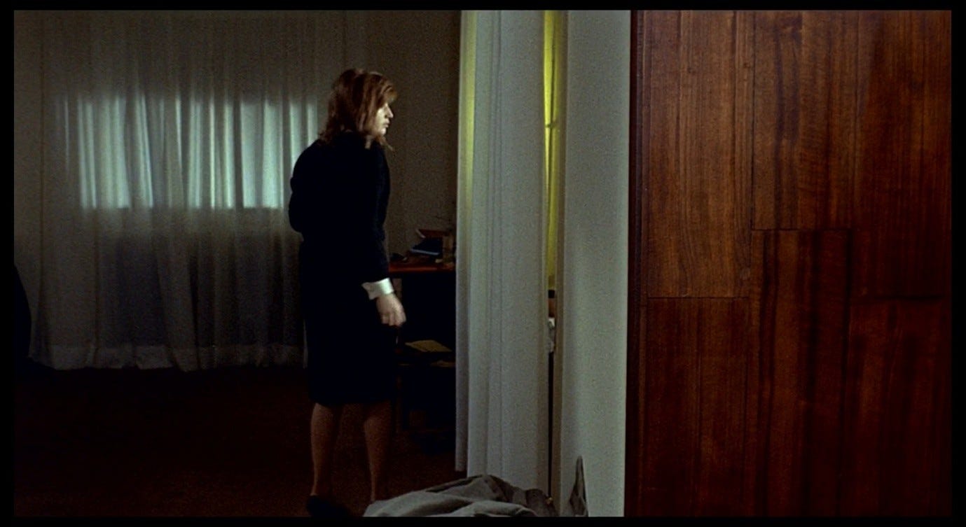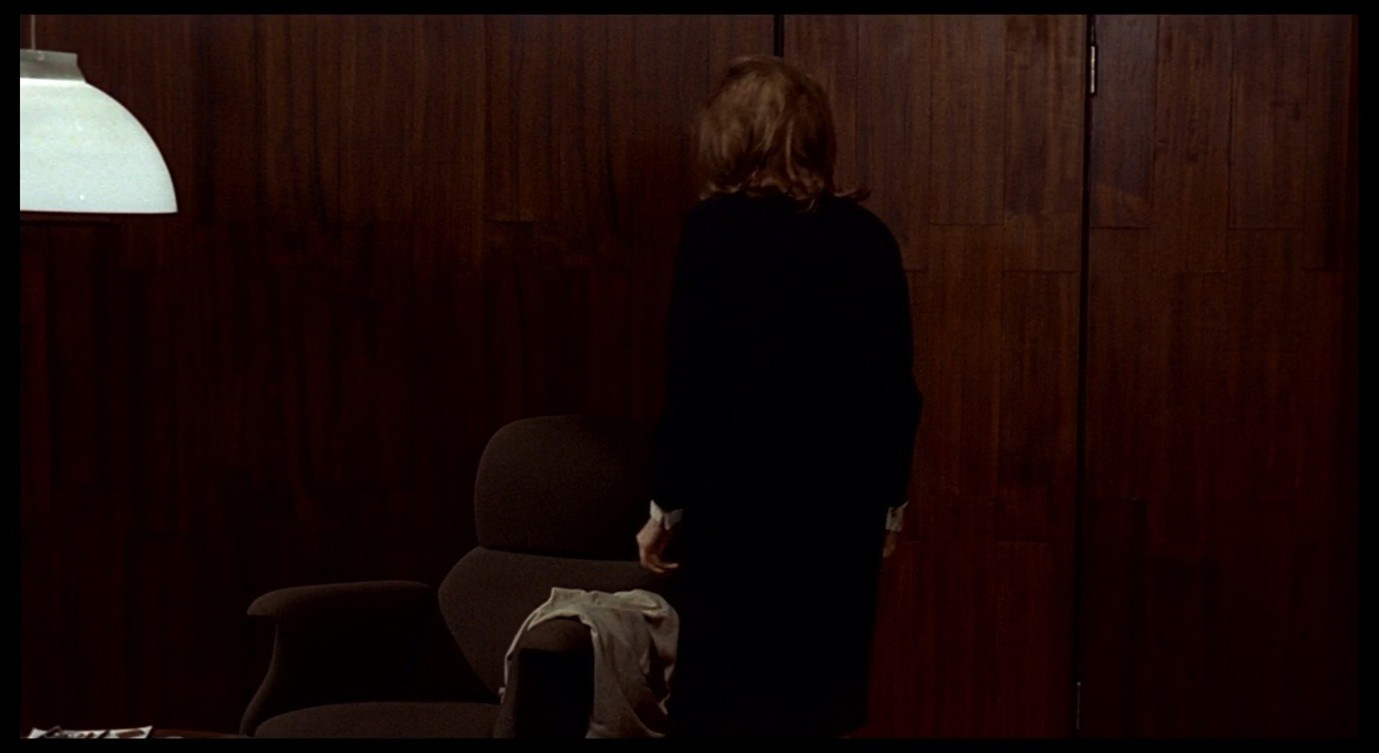 In several earlier scenes, we have heard a sinister electronic whine accompanying Giuliana’s moments of crisis: her night terrors at home, her encounter with the grey fruit-seller, and most recently the exposure of Valerio’s deception. Similar noises occur intermittently throughout the hotel room sequence, building in intensity in tandem with Giuliana’s panic. Near the start of the scene, when she walks past a window and a yellow light suddenly comes on outside, a disturbing hum occurs at the same time.