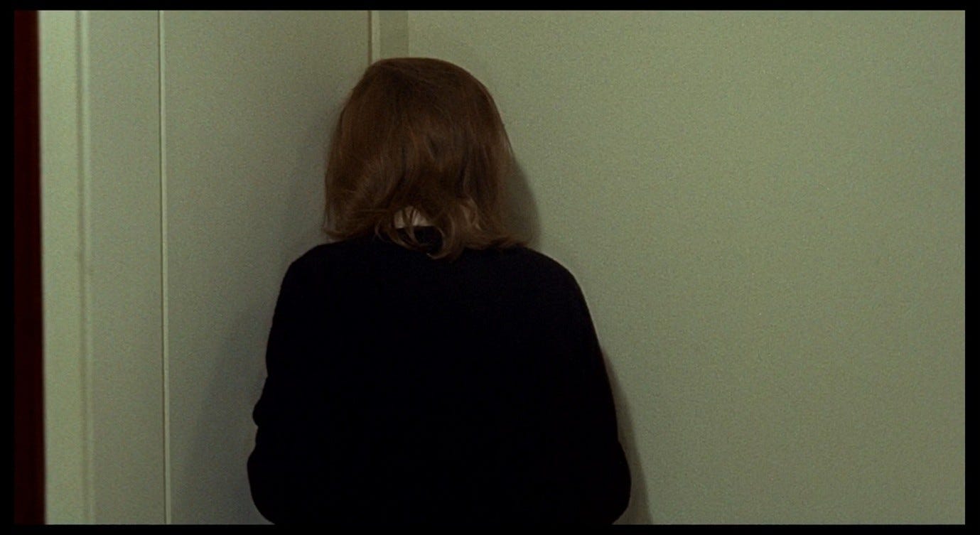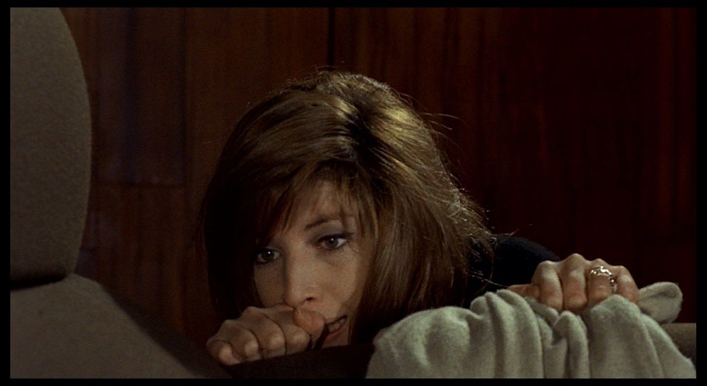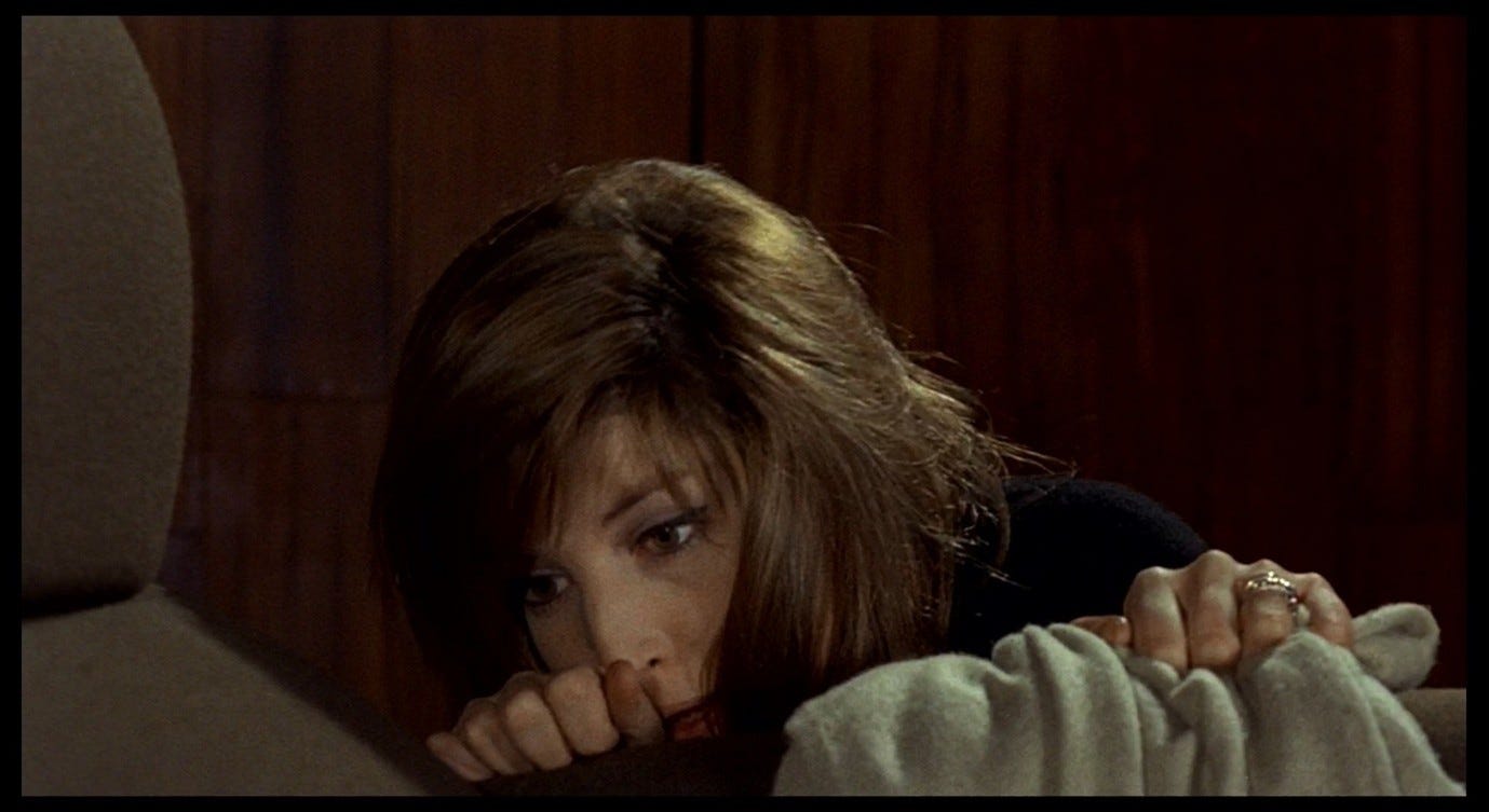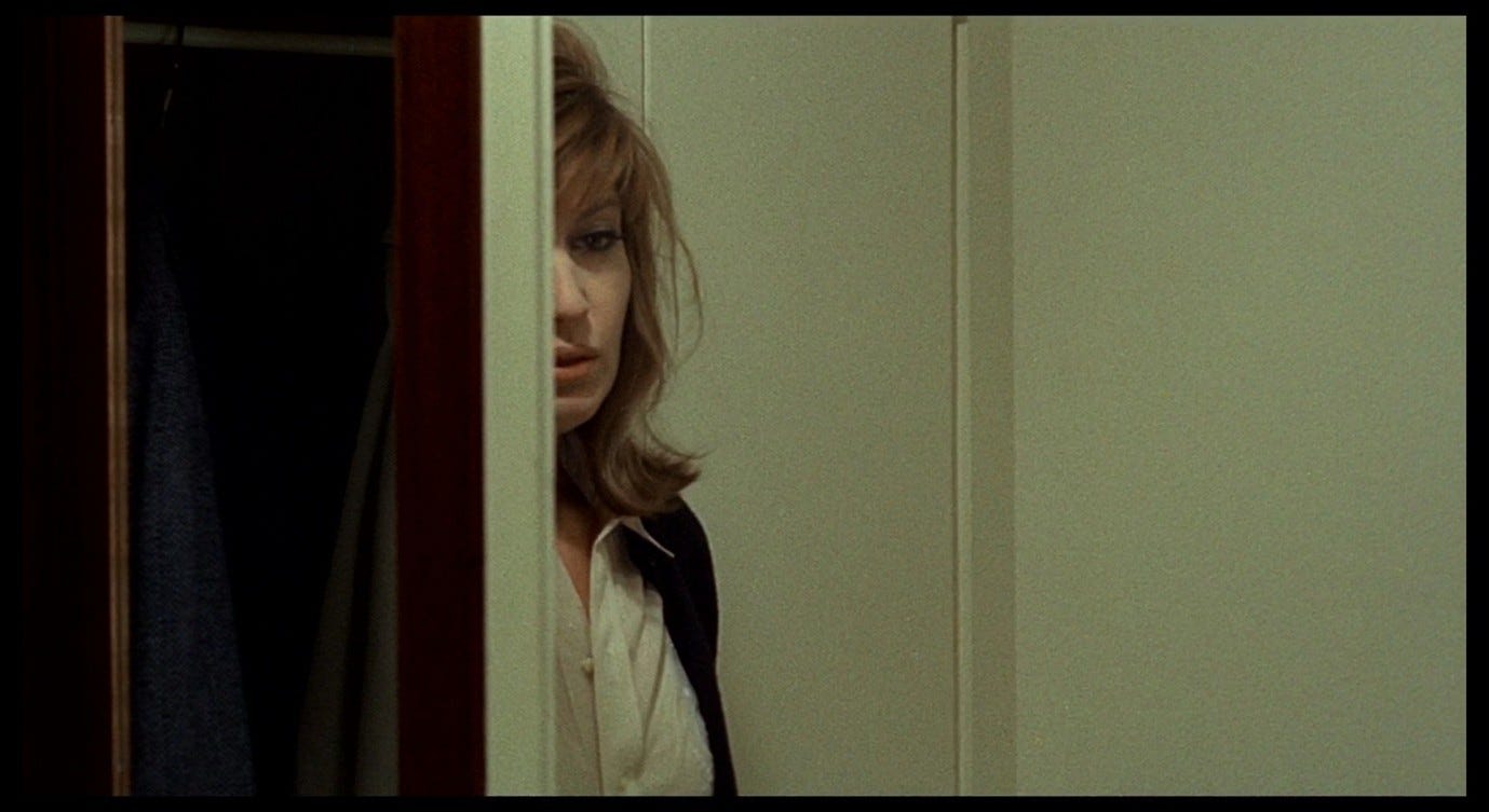 In several earlier scenes, we have heard a sinister electronic whine accompanying Giuliana’s moments of crisis: her night terrors at home, her encounter with the grey fruit-seller, and most recently the exposure of Valerio’s deception. Similar noises occur intermittently throughout the hotel room sequence, building in intensity in tandem with Giuliana’s panic. Near the start of the scene, when she walks past a window and a yellow light suddenly comes on outside, a disturbing hum occurs at the same time.