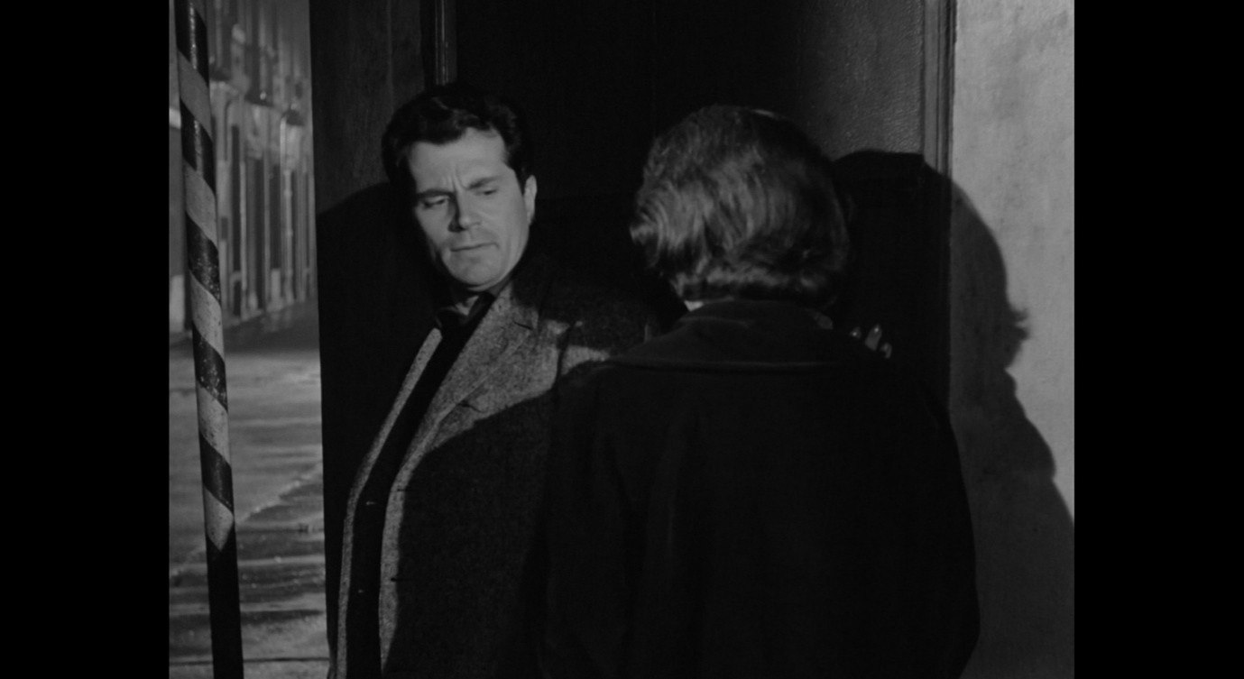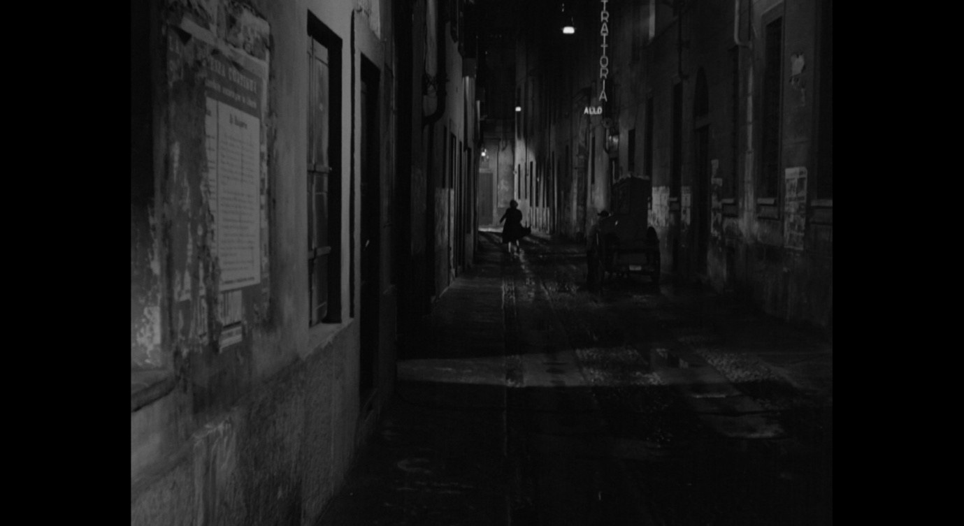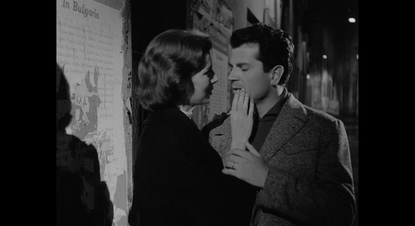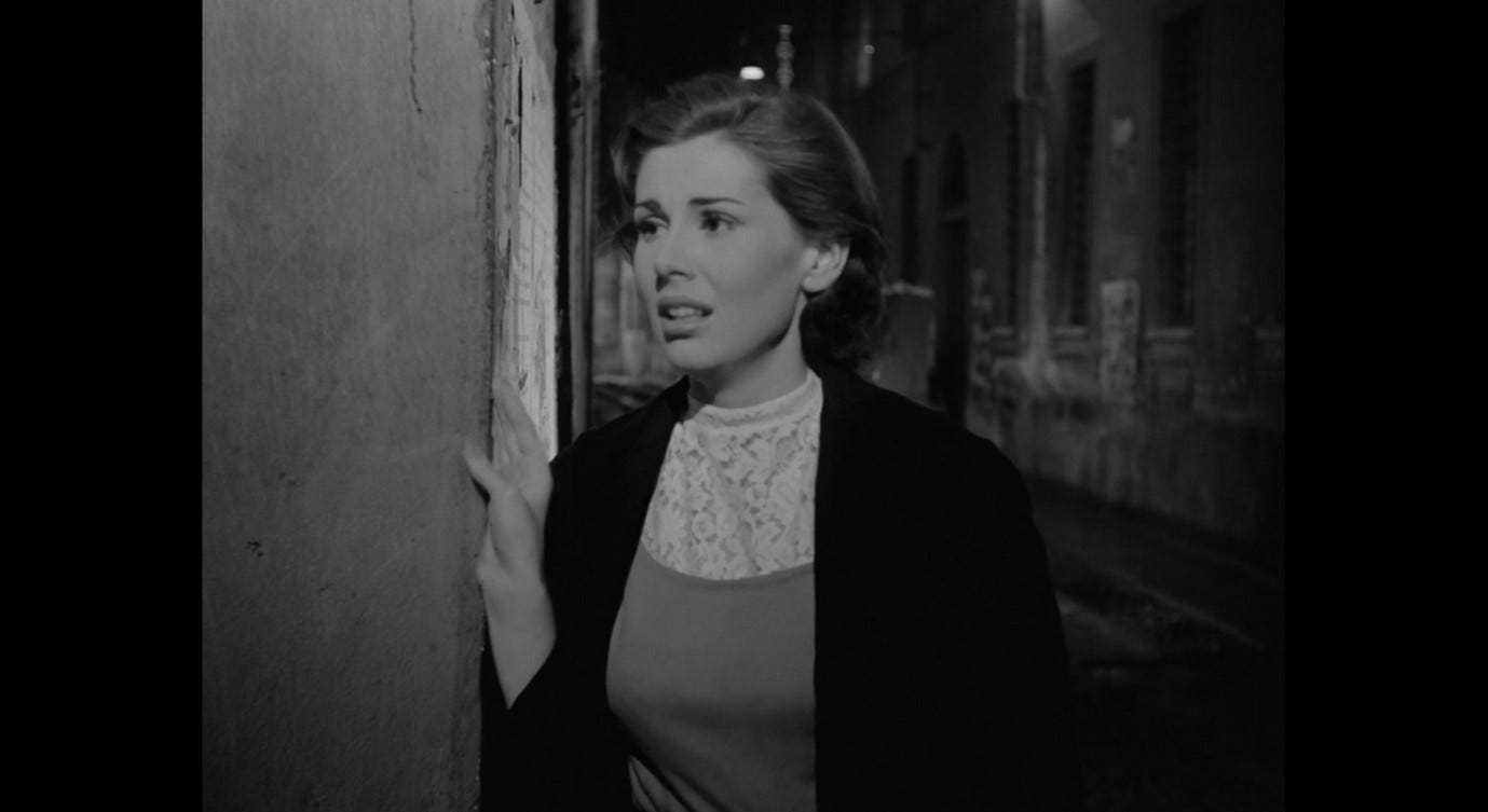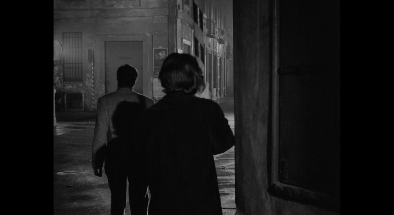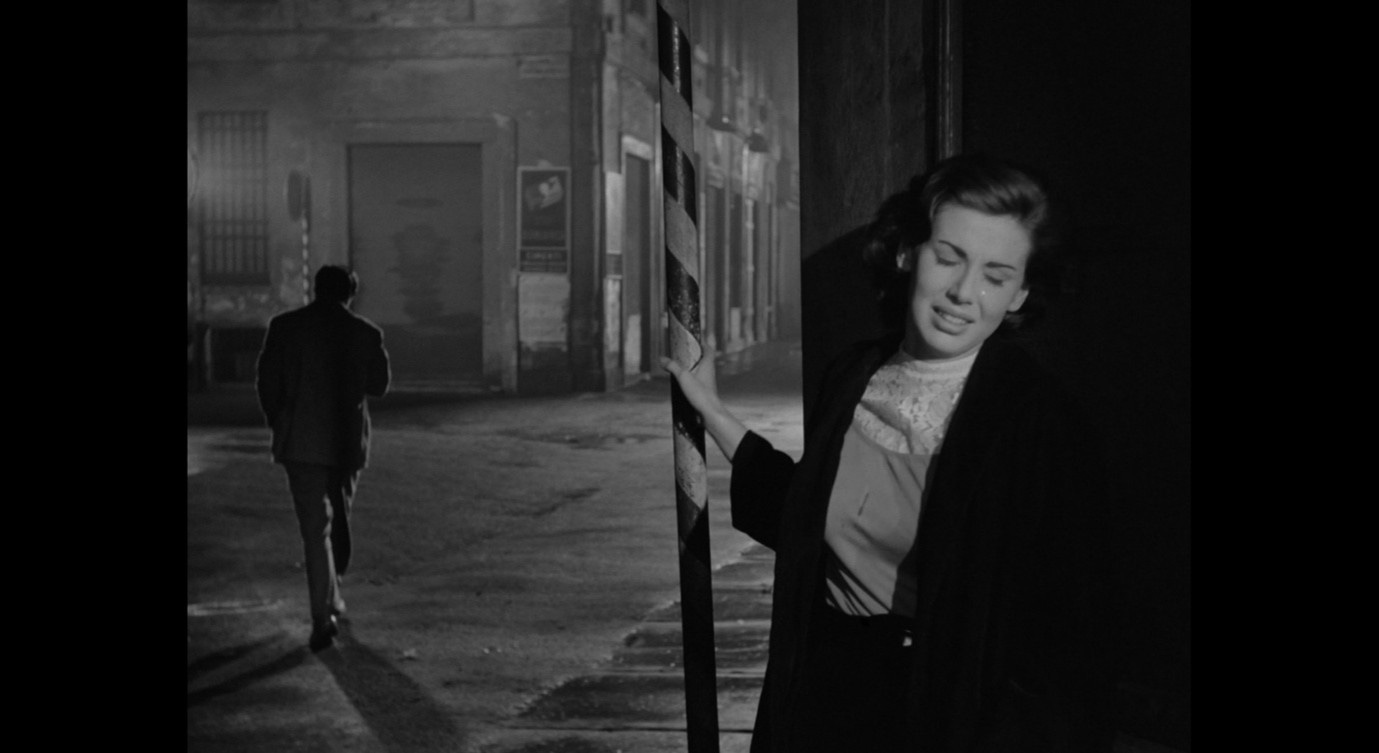 In Le amiche, Lorenzo is cheating on his wife (Nene) with the vulnerable Rosetta, who has recently attempted suicide. Near the end of the film, Nene ‘releases’ Lorenzo so that he can commit to Rosetta, and the two lovers find themselves alone in a dark, empty street in a depressed part of town. Rosetta is passionate and excited about committing to this relationship in earnest. ‘I know you need me,’ she tells Lorenzo.