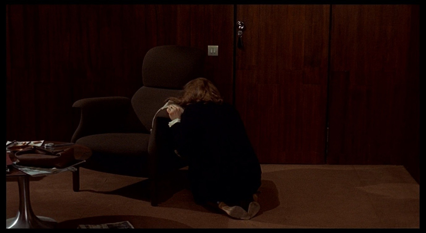 Her casual dismissal of her own sickness with the repeated word niente is undercut by the menacing hum on the soundtrack. When she hears this noise, her casual stroll across the room turns into something else. After looking at Corrado when she says niente, she suddenly turns away from him and walks over to an armchair. Rather than sitting down and continuing to speak calmly, Giuliana falls to her knees and clutches the arm of the chair.