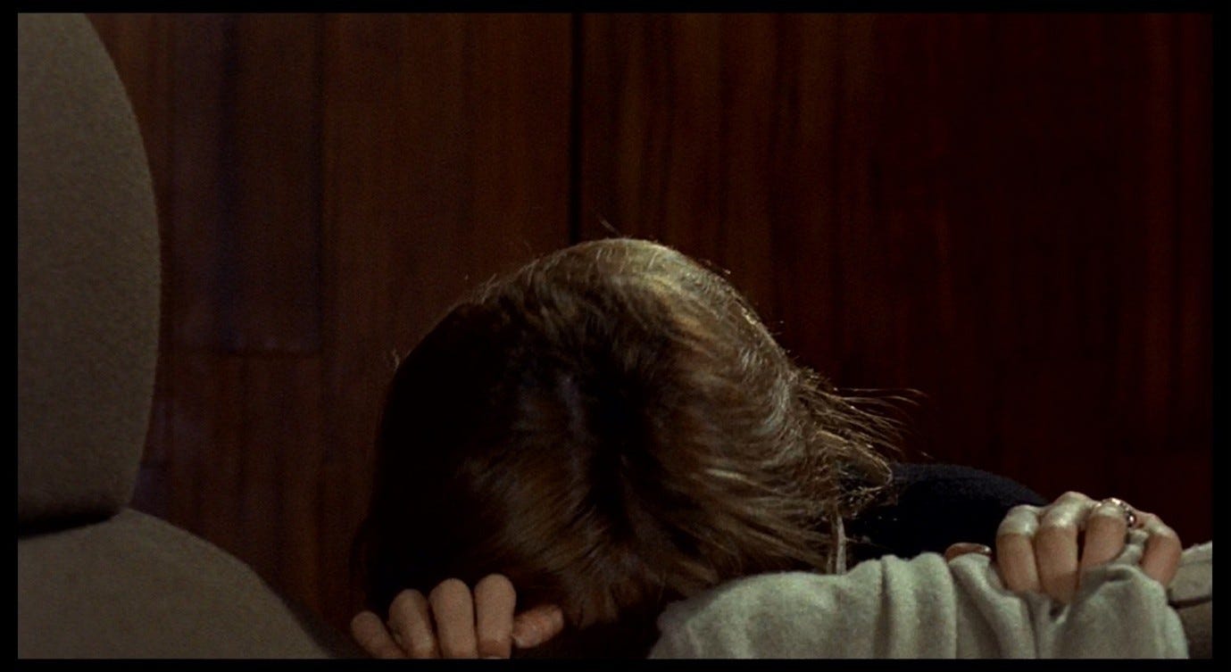 Her voice no longer sounds like a sob, but like a whisper. She is compelled to repeat the word as the realisation sinks in deeper and deeper, but scared to say it out loud because of what it means. The sinister noise on the soundtrack dies down but then rises up to a higher pitch, like a migraine subsiding only to return with greater intensity, or like a frightening idea being buried in layers of denial and then boiling up through the cracks. Giuliana’s gaze begins to dart around as she continues to grip the chair and say mai, only now this word (like il nome in the hotel reception) disintegrates into its component parts until it sounds like she is saying ma and io.