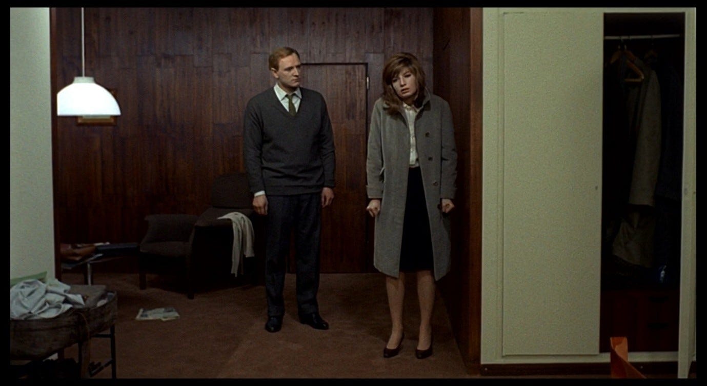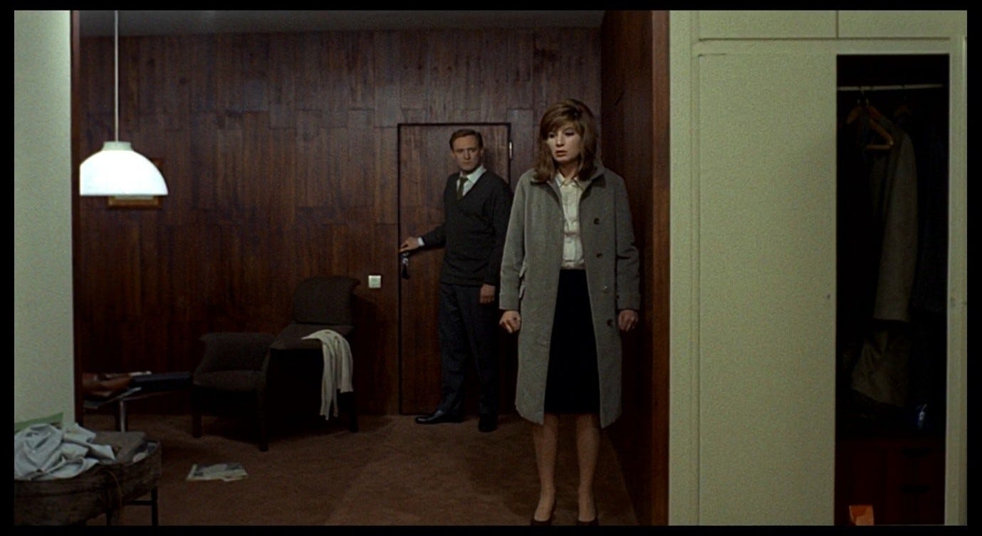 The painful vibrations on the soundtrack help us to understand what she means. Because we did not hear them for a while – between the Via Alighieri and Valerio’s ruse – they also spell returning danger, as if that monster she saw in the darkness during the night-terrors sequence had come back to menace her again. The monster appears in the form of Valerio, the yellow light outside, the atmosphere of the hotel room, and other manifestations that are harder to pin down. All this contributes to the climactic tone of the hotel room sequence, in which Giuliana confronts the monster more directly than in any other scene, and after which the film’s emotional intensity will subside.