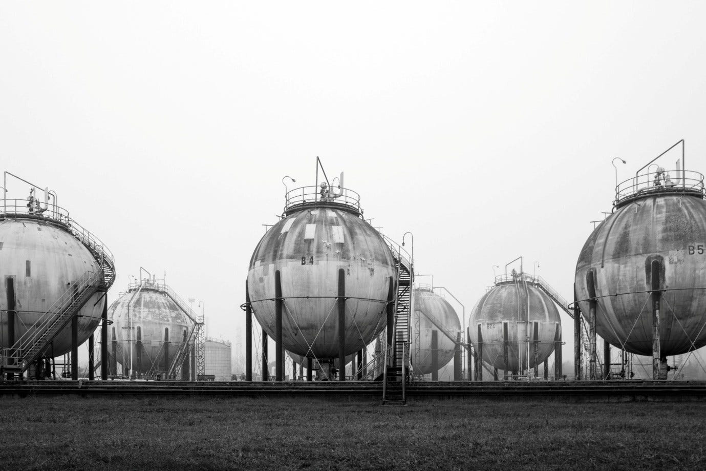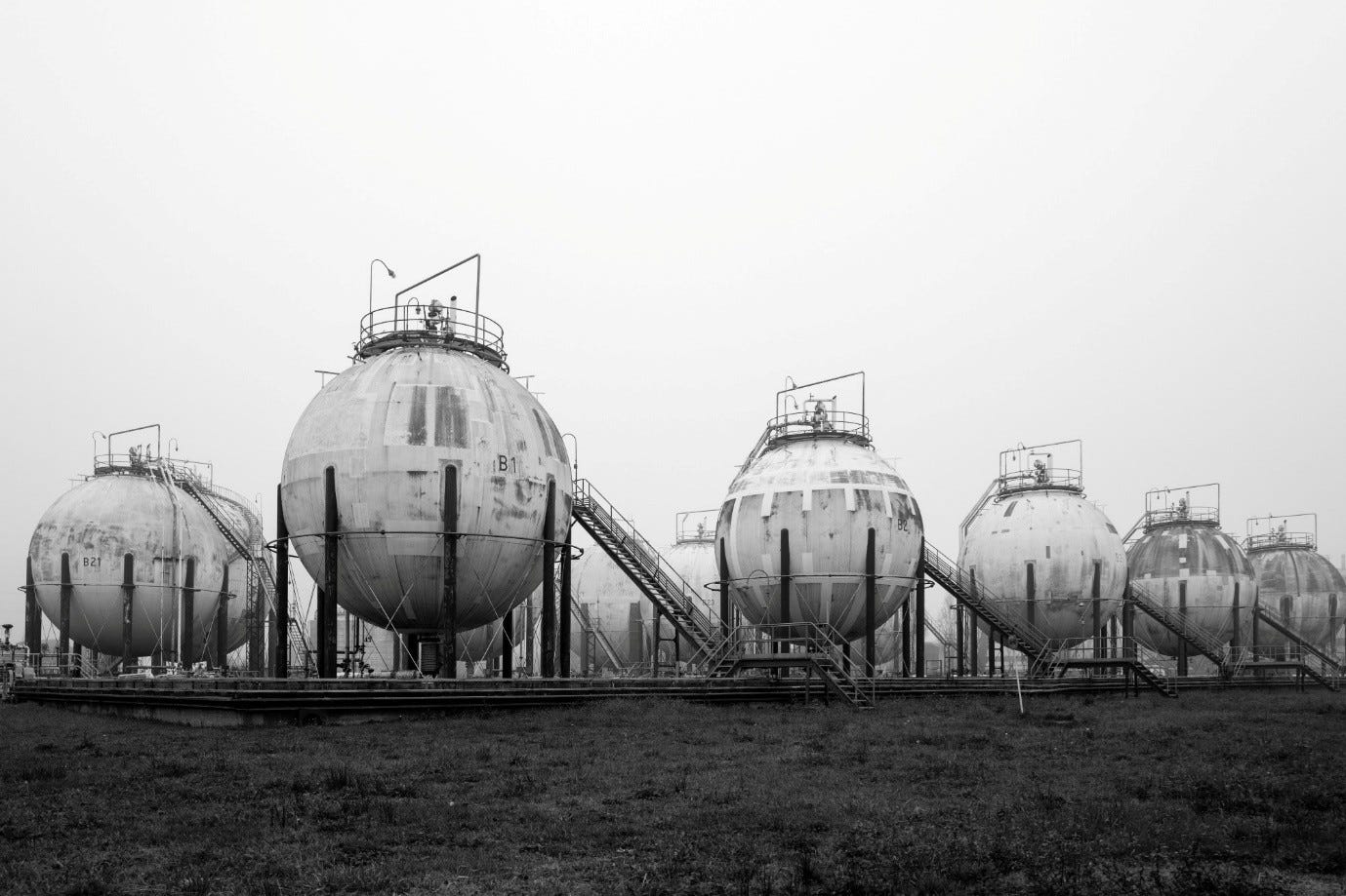 Sequenze di fabbrica is a multimedia artwork composed by Adriano Zanni, consisting of a book of photographs – taken among the Ravenna factories where Red Desert was filmed – and five musical tracks incorporating dialogue from the film.6 In the second track, ‘Mi fanno male i capelli’, we hear Giuliana’s words in the hotel room scene, culminating in ‘I will never be cured.’ Leading into this moment, we hear a multi-layered drone, sinister but quiet, behind the dialogue. But after Giuliana utters the second mai, a loud, dramatic, low-pitched electronic chord breaks in, preceded (a split-second earlier) by a slightly quieter version of itself, as though we ‘saw’ the chord being struck some distance away but the sound took an instant longer to reach us. We are inhabiting the mind and body of a spectator – another spectator, not us – who is watching the film, sharing their senses as it resonates with them, though at a slight remove. Likewise, Zanni’s photographs are familiar from Red Desert but also new and different, in black-and-white, taken from different angles. ‘None of that profound vitality that Antonioni saw in the factories […] shines through the artist’s images,’ says Alberto Giorgio Cassani, not as a criticism but to acknowledge the deliberate difference between Sequenze di fabbrica and Red Desert.7 Those overwhelming orbs that Giuliana walked beneath as she made her way to the hotel are shown, by Zanni, from a lower and more human angle, revealing the orbs more completely and depriving them of some of their mystery. We can see the poles anchoring them to the earth and the bases of the ladders we could climb if we wanted to ascend these structures.8