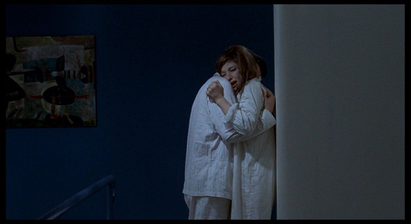 For a moment, she is caught in a very typical Antonioni composition, with the solid blue background dominating the left two thirds of the screen and the white wall dominating the right third. She presses her head and body against the whiteness as though wanting to disappear into it, but the composition emphasises her sense of entrapment, all the more so as the camera cuts to a wider shot and we see Ugo closing in from the left, following the direction of those attacking horizontal limbs in the painting.