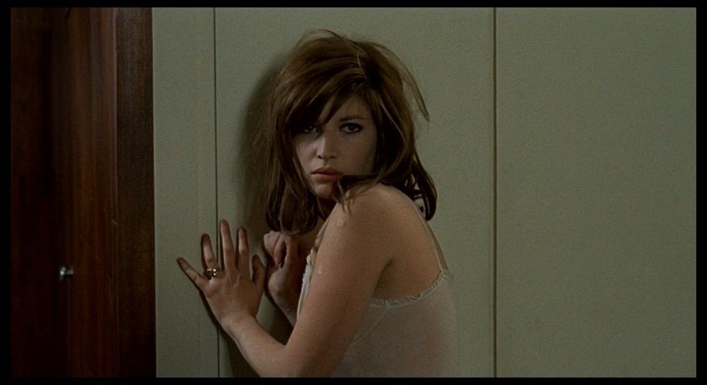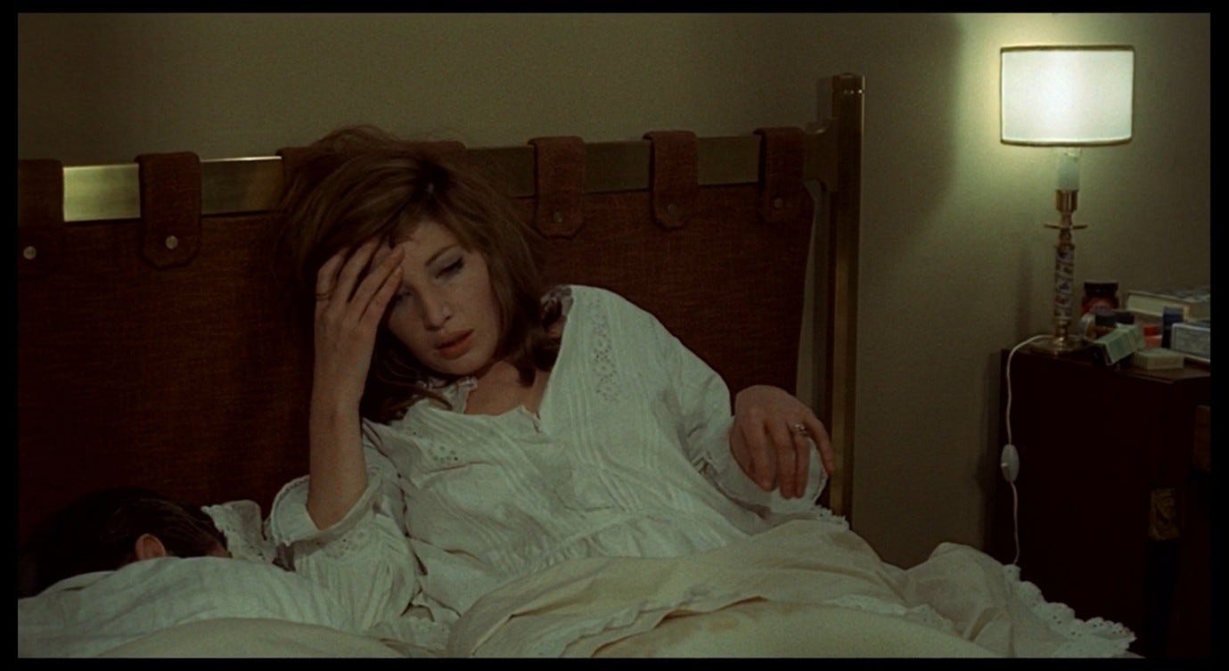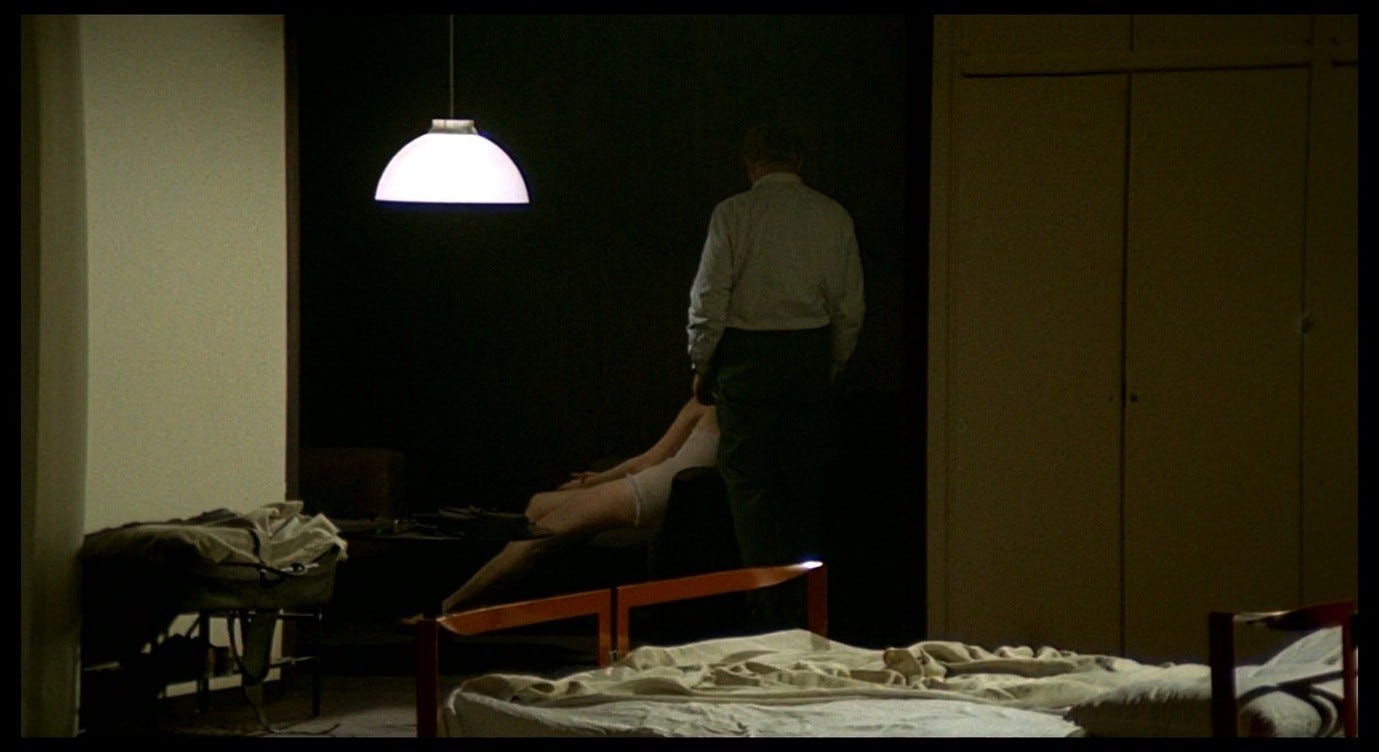 In earlier posts, I have talked about ‘my Red Desert,’ my preferred version of the film which is committed to ‘taking Giuliana’s side’ and asking the audience to identify with her. The hotel-room scene, as I experience it, is like something from a horror film, and specifically a horror film that sympathises with its protagonist. But in this post, I also want to explore a darker layer of this sequence, which is brought into focus by Antonioni’s admissions of abuse, by some of his other comments about this and other films, and by the ways in which critics have responded to the hotel-room scene.