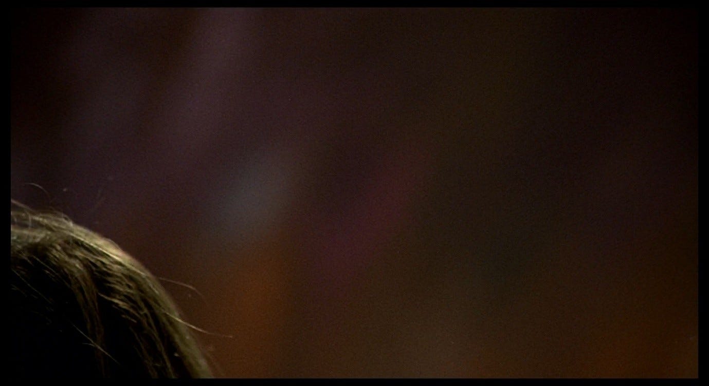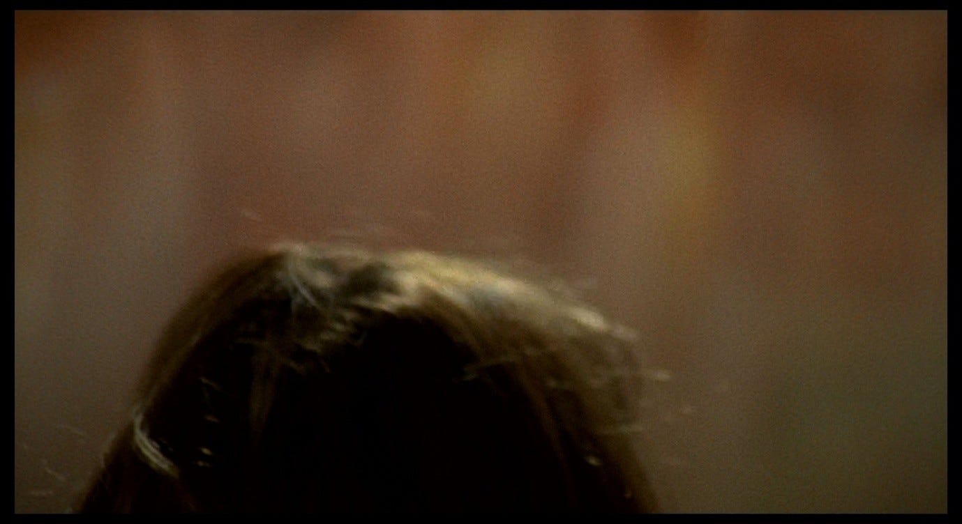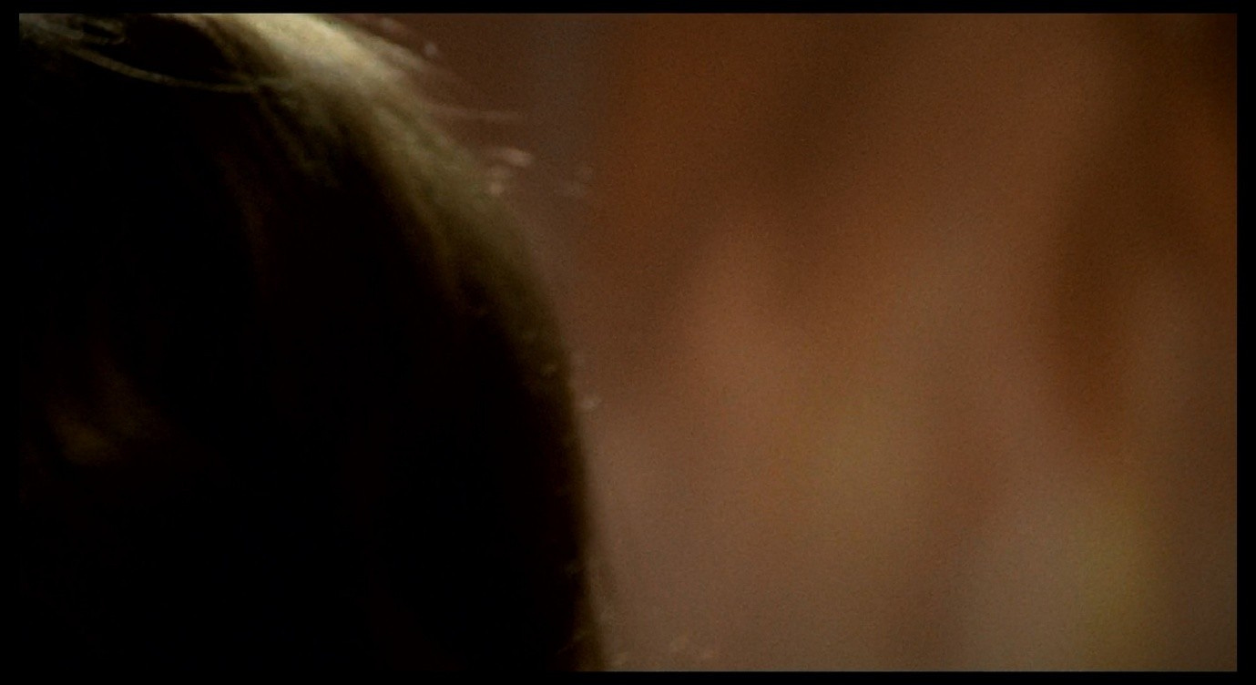 At the same time, Giuliana lifts her head to look at the wall, where the out-of-focus stain continues to spread. Now there seem to be a mix of pinks and yellows in this stain, and as the camera tilts upwards we see (as in the earlier image of the stain on the ceiling) an ominous purple-black mass spreading out indefinitely into the upper part of the frame. More than ever, it looks like a bruise or a wound.