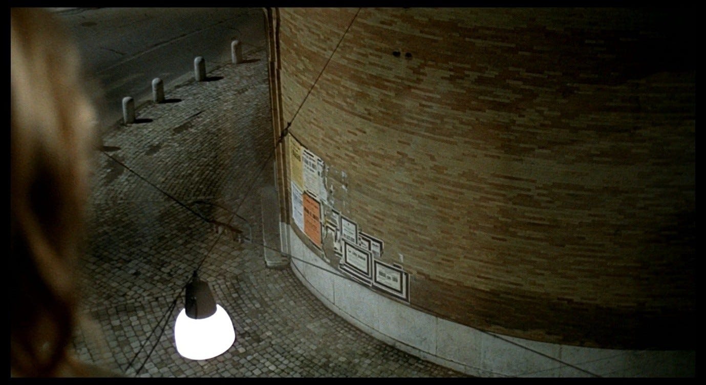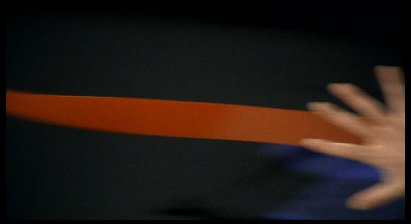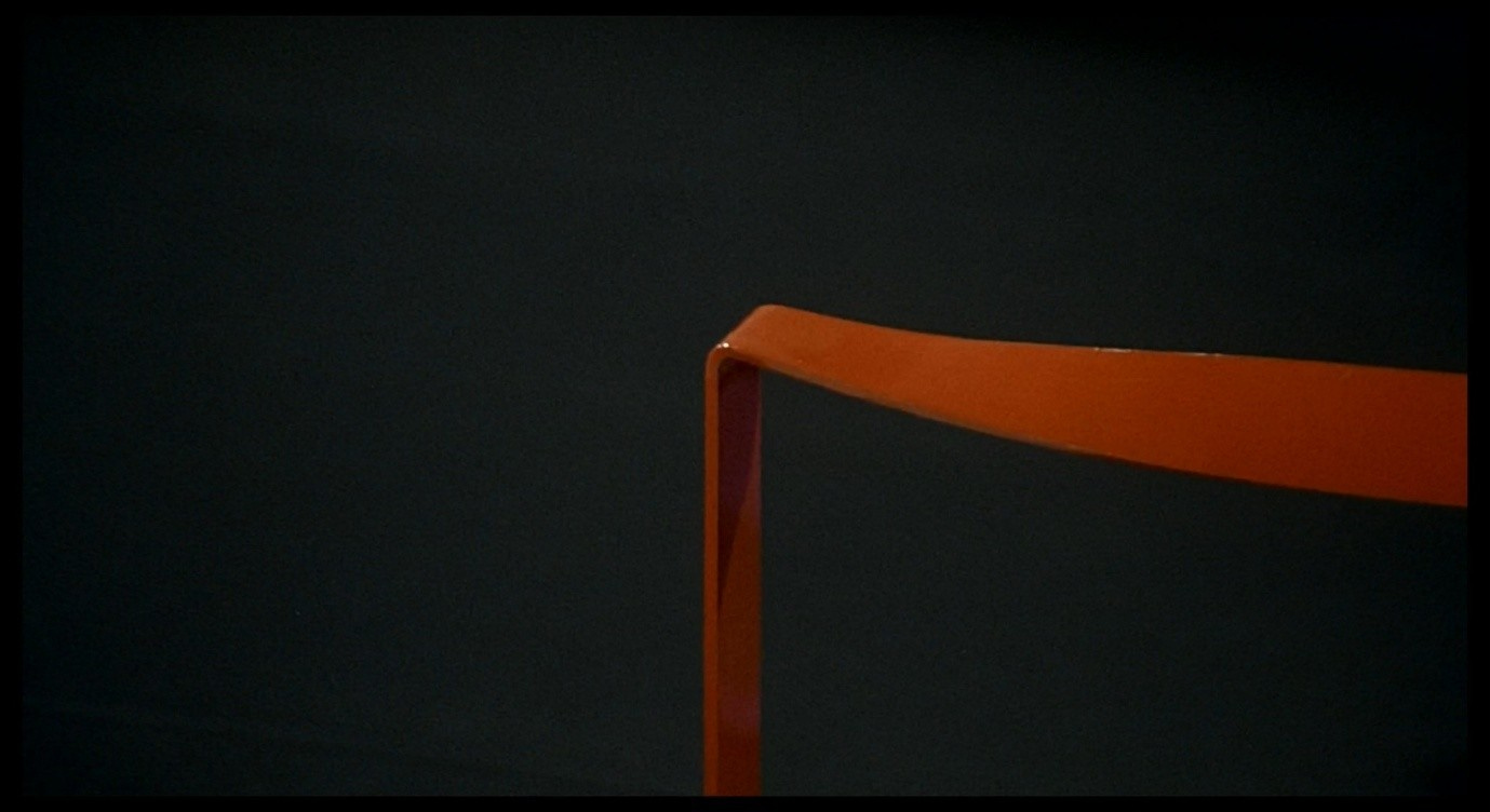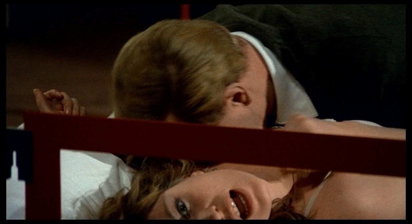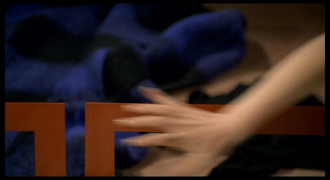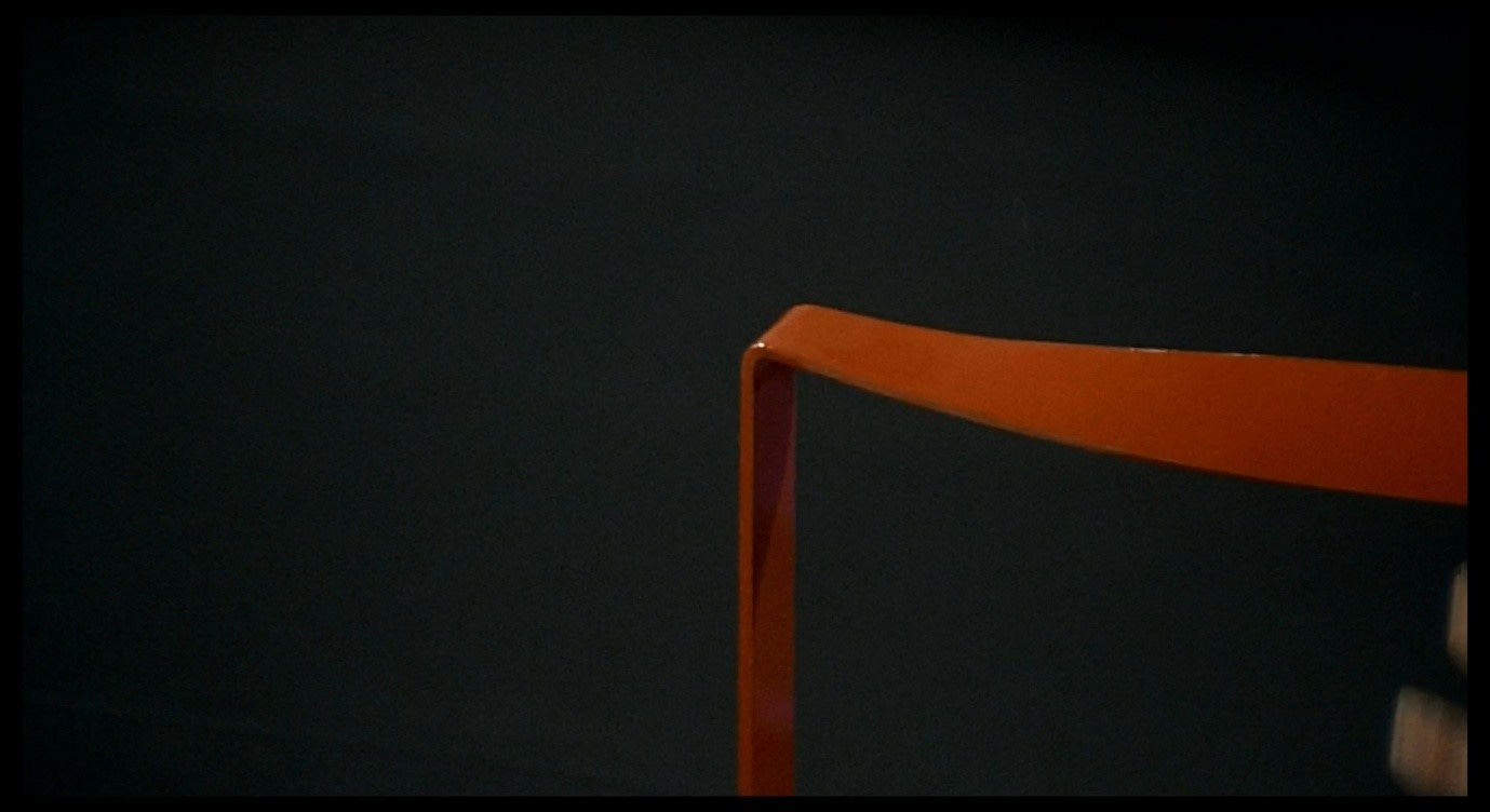 Giuliana escapes from the frame, disappearing to the left, only for the next shot to capture her hand entering from the right, extending horizontally along the red bar of the bed-frame. This continuity error creates a nightmarish effect, like leaving a room by one door only to find oneself entering it by another. Earlier in the scene, the red bar marked the boundary that Corrado had to traverse in order to reach Giuliana. Now, Giuliana herself is identified with this red line and seems to dissolve into it. The camera pans rapidly to the left as her arm shoots along the bar; the panning movement stops at the edge of the bed-frame where the red line turns downwards.