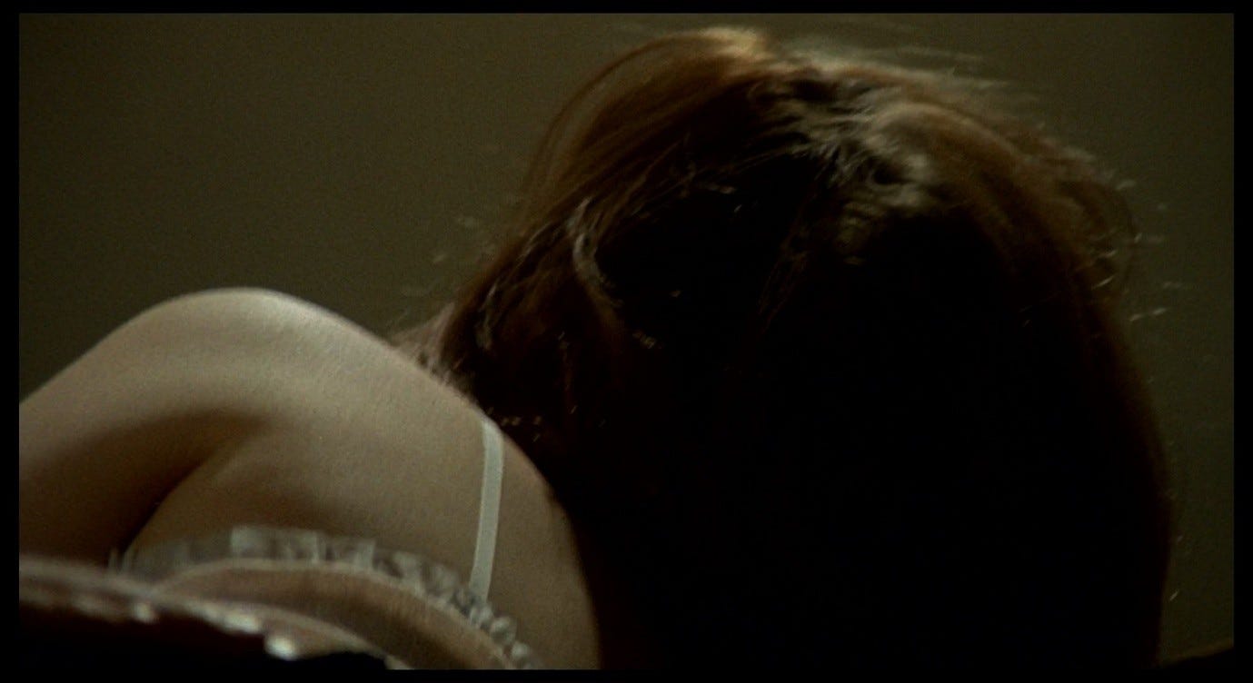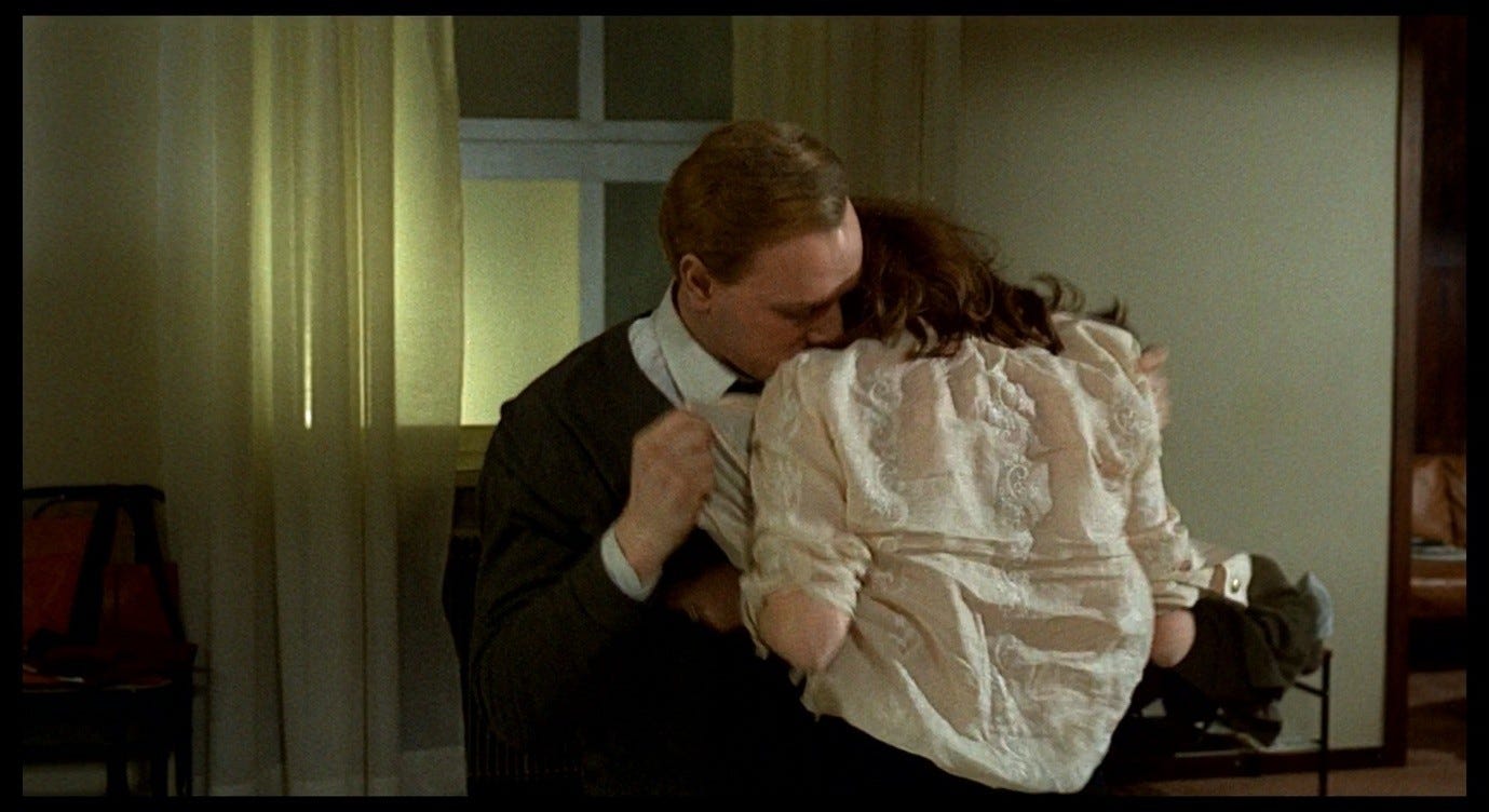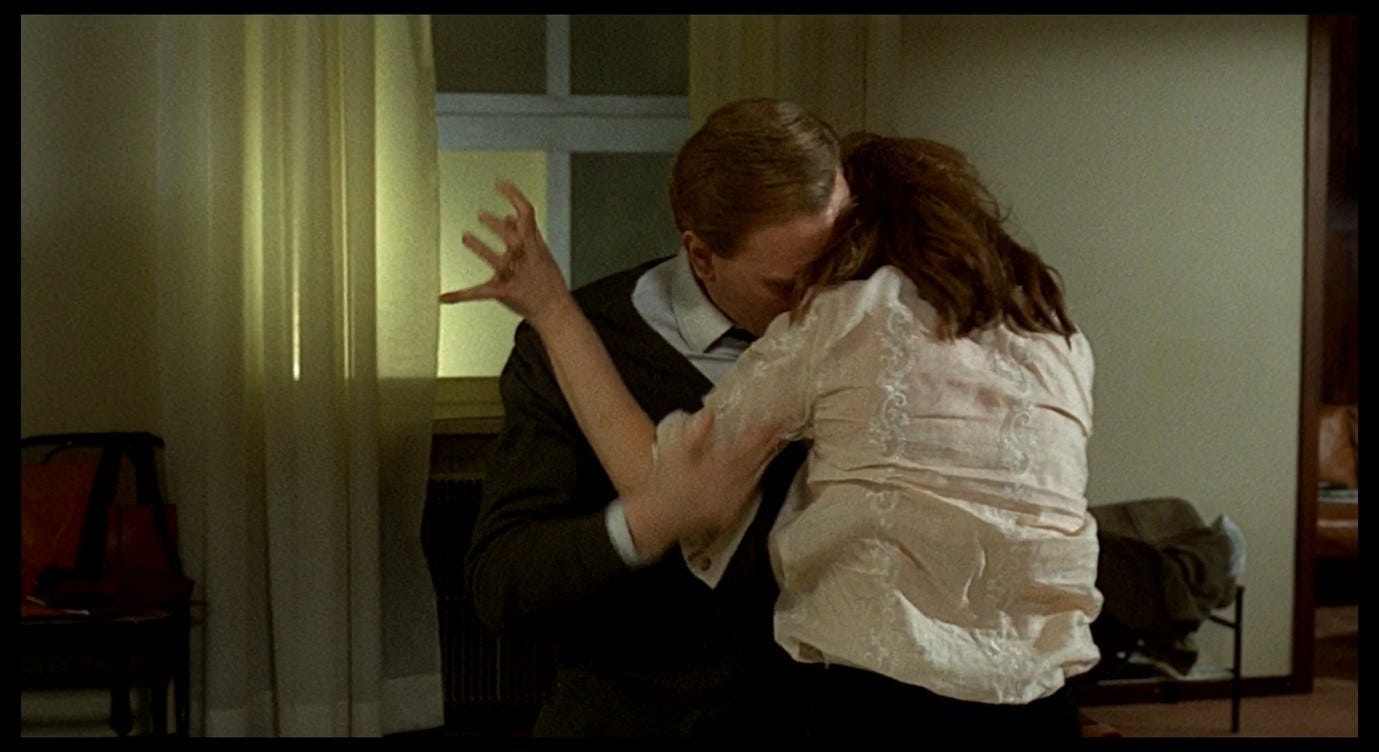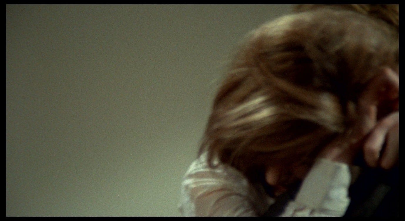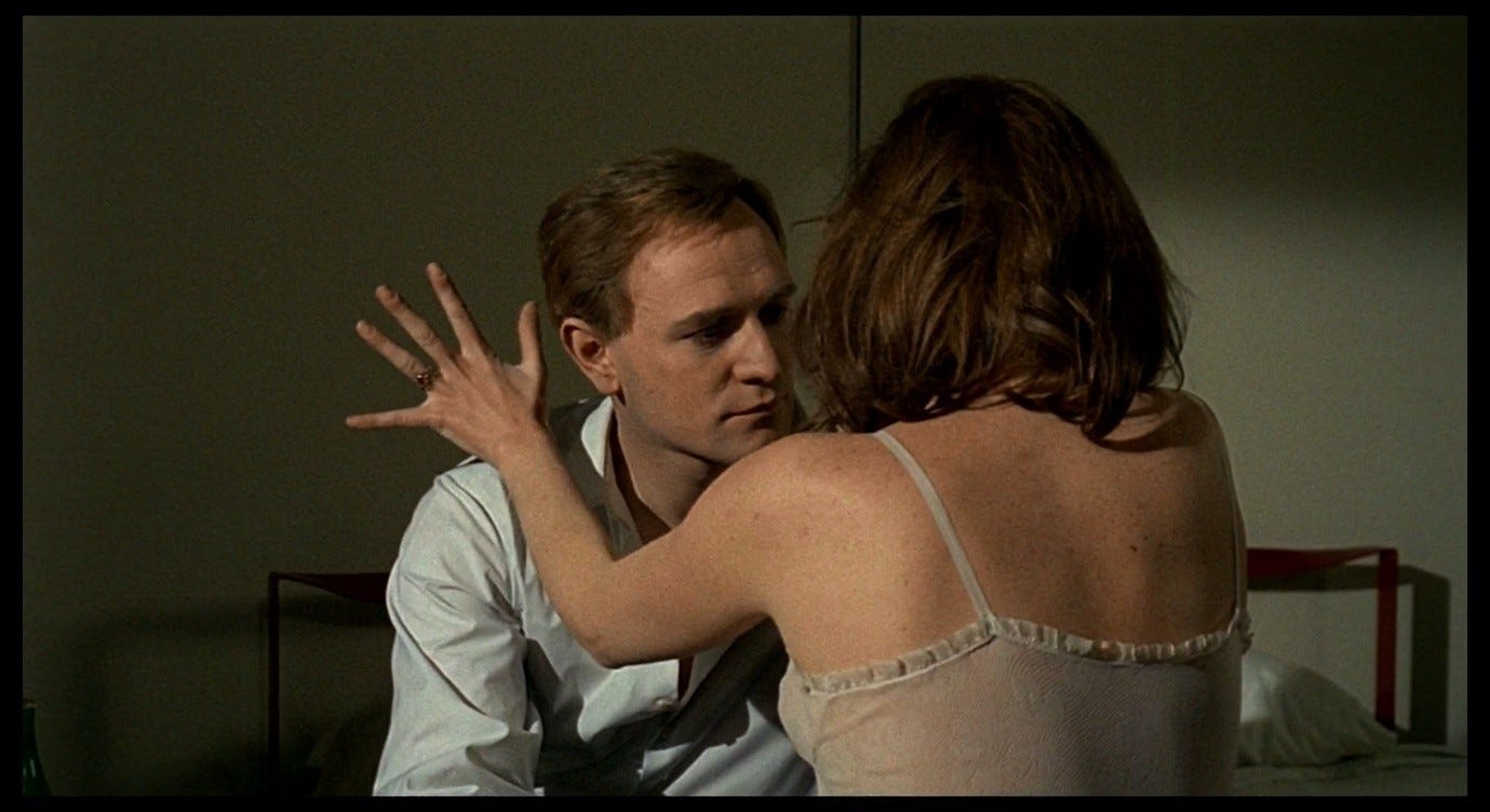 The Double Life of Véronique presents a more complex version of this trope, and one that bears a closer resemblance to the sex scene in Red Desert. Alexandre, the puppeteer, courts Véronique in ways that he intends to be romantic, but that ultimately come across as sinister. This pursuit culminates with the two having sex in Alexandre’s hotel room, in a context where Véronique does not initiate or (I think) want a sexual encounter. Indeed, like Giuliana, she is profoundly upset: she has just discovered an image of her other self – Weronika, her Polish alter-ego – in a set of holiday photos. Seeing this image, Véronique realises that her recent, inexplicable feeling of loss must have been a response to this alter-ego’s death. That sense of loss flared up in her, earlier in the film, while she was making love to her previous boyfriend. She sent him away in order to be able to process this feeling alone. Now, in the hotel room with Alexandre, she fully realises the nature and cause of her grief, while he (without getting consent) obliviously has sex with her.