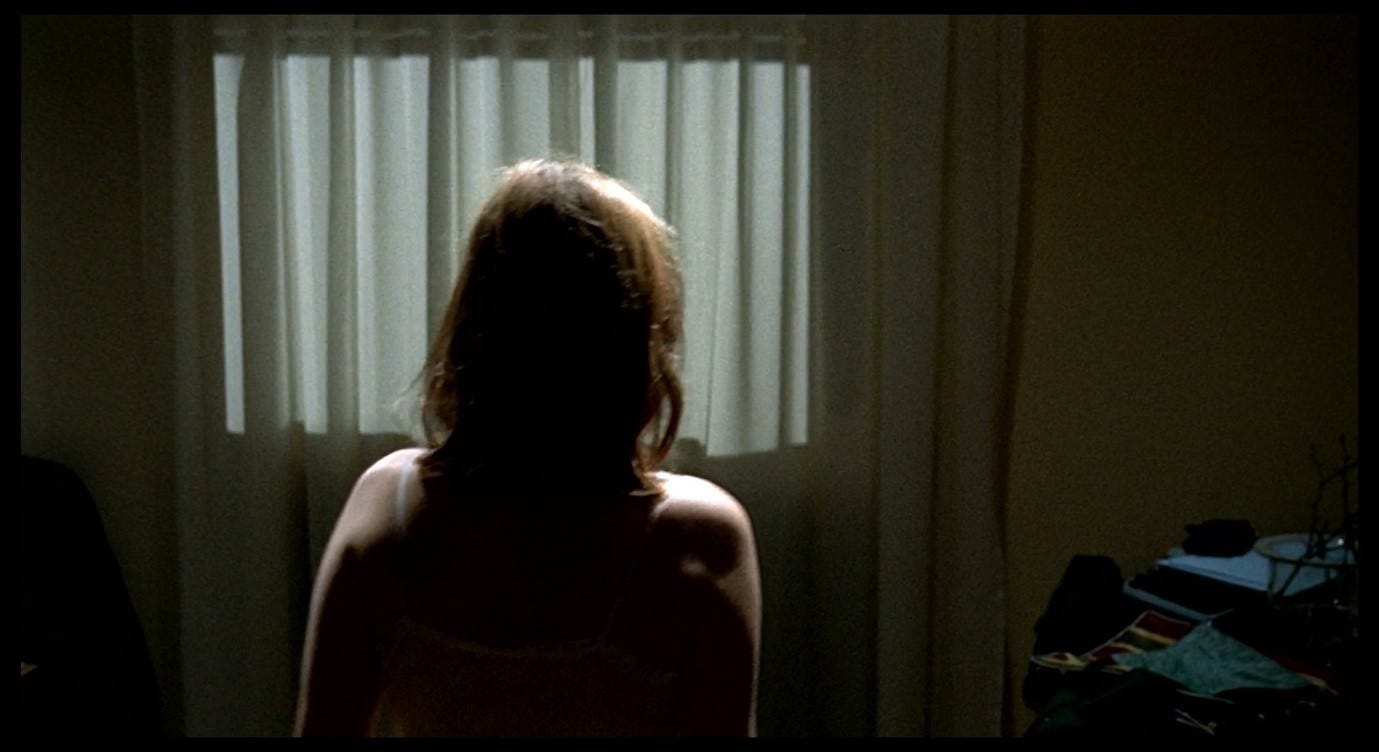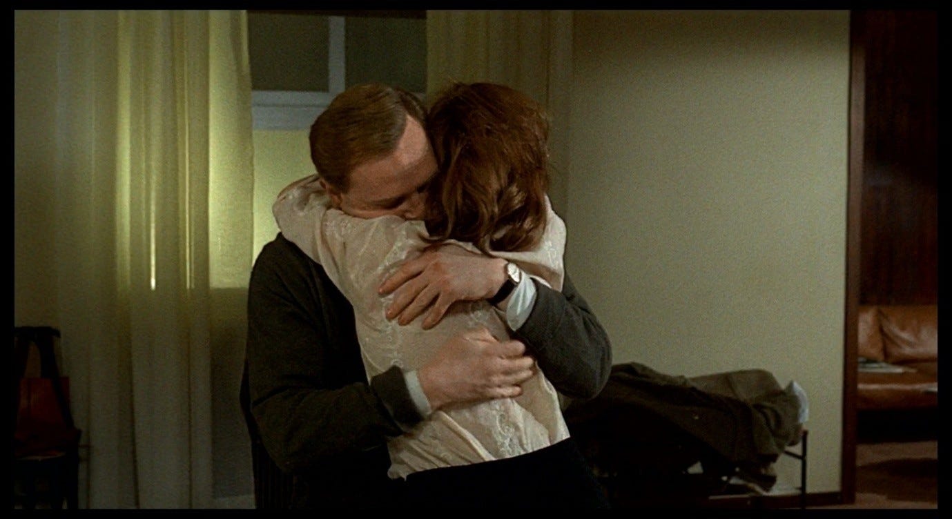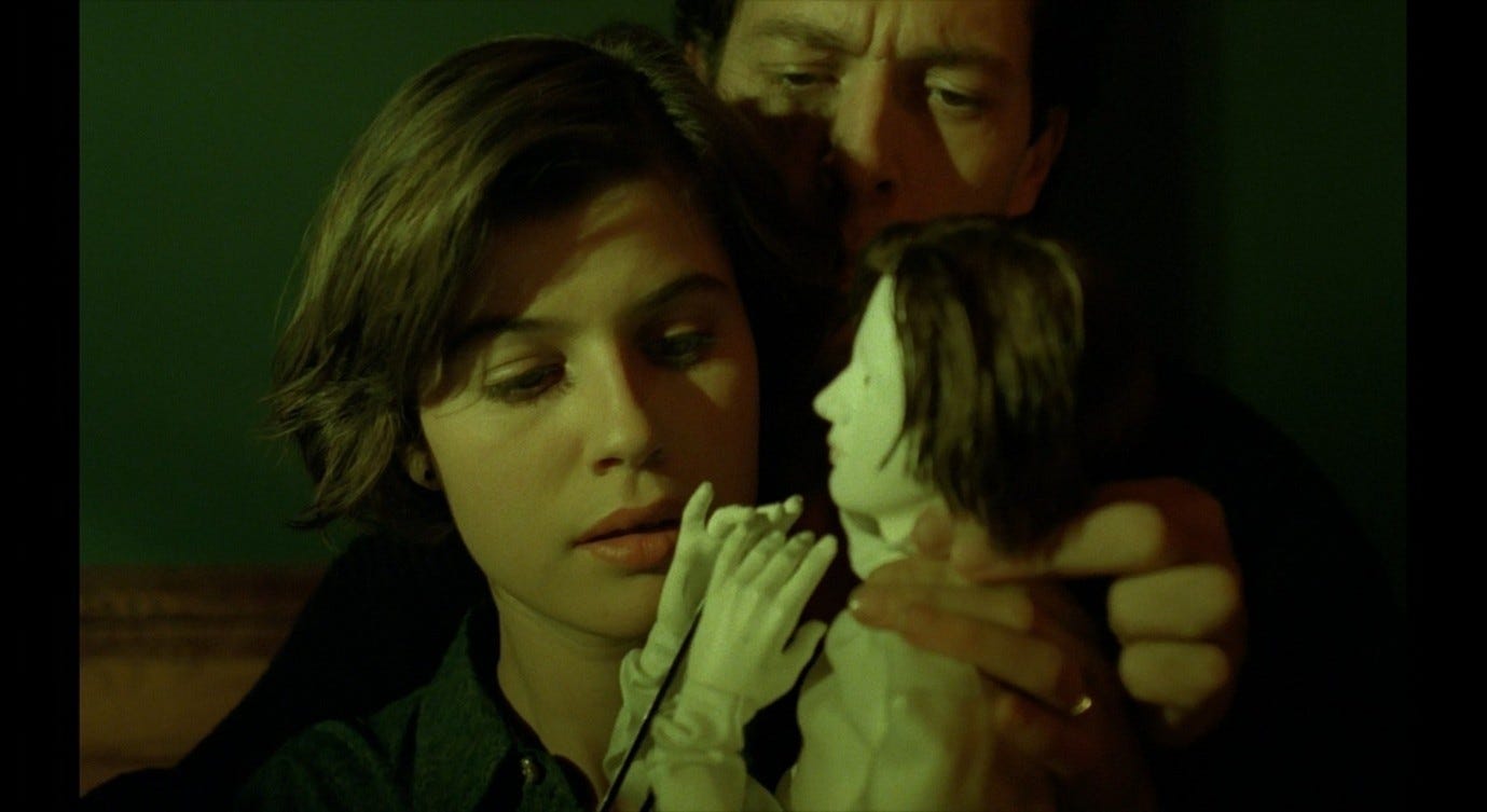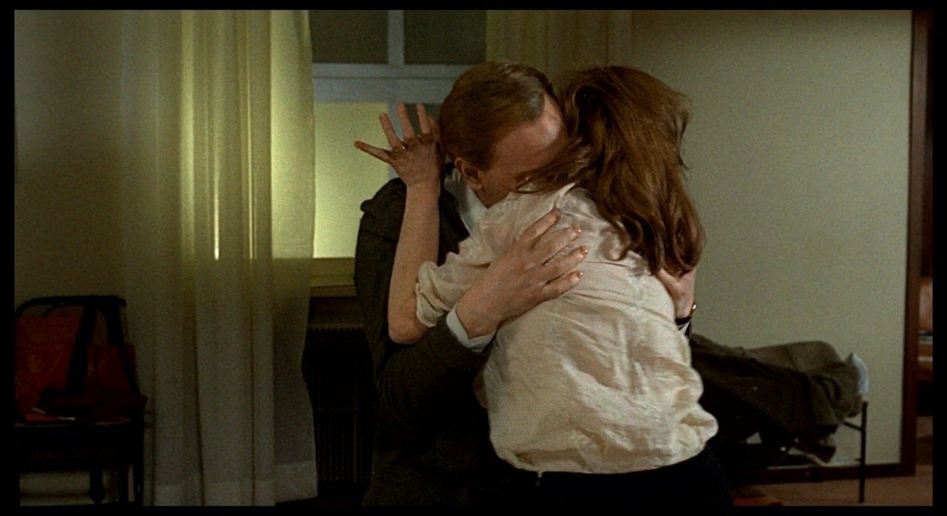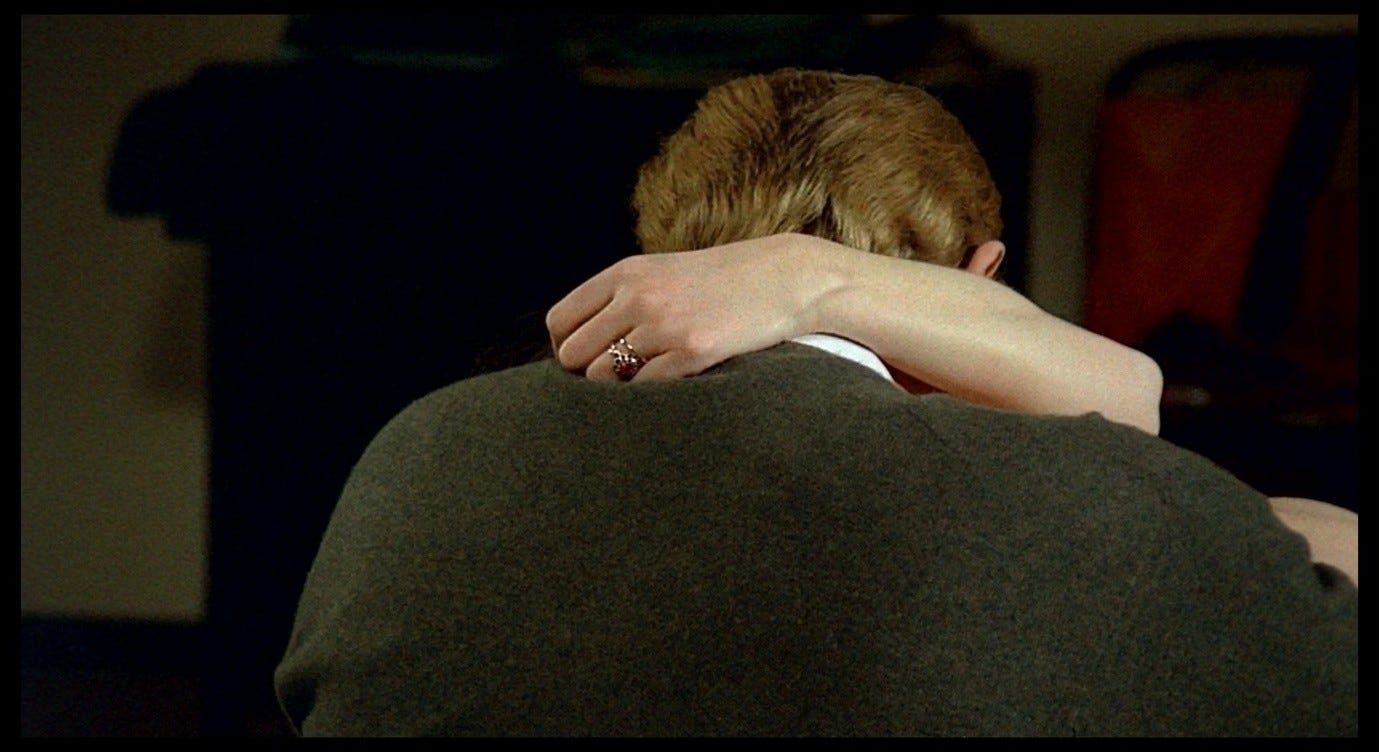 The Double Life of Véronique presents a more complex version of this trope, and one that bears a closer resemblance to the sex scene in Red Desert. Alexandre, the puppeteer, courts Véronique in ways that he intends to be romantic, but that ultimately come across as sinister. This pursuit culminates with the two having sex in Alexandre’s hotel room, in a context where Véronique does not initiate or (I think) want a sexual encounter. Indeed, like Giuliana, she is profoundly upset: she has just discovered an image of her other self – Weronika, her Polish alter-ego – in a set of holiday photos. Seeing this image, Véronique realises that her recent, inexplicable feeling of loss must have been a response to this alter-ego’s death. That sense of loss flared up in her, earlier in the film, while she was making love to her previous boyfriend. She sent him away in order to be able to process this feeling alone. Now, in the hotel room with Alexandre, she fully realises the nature and cause of her grief, while he (without getting consent) obliviously has sex with her.