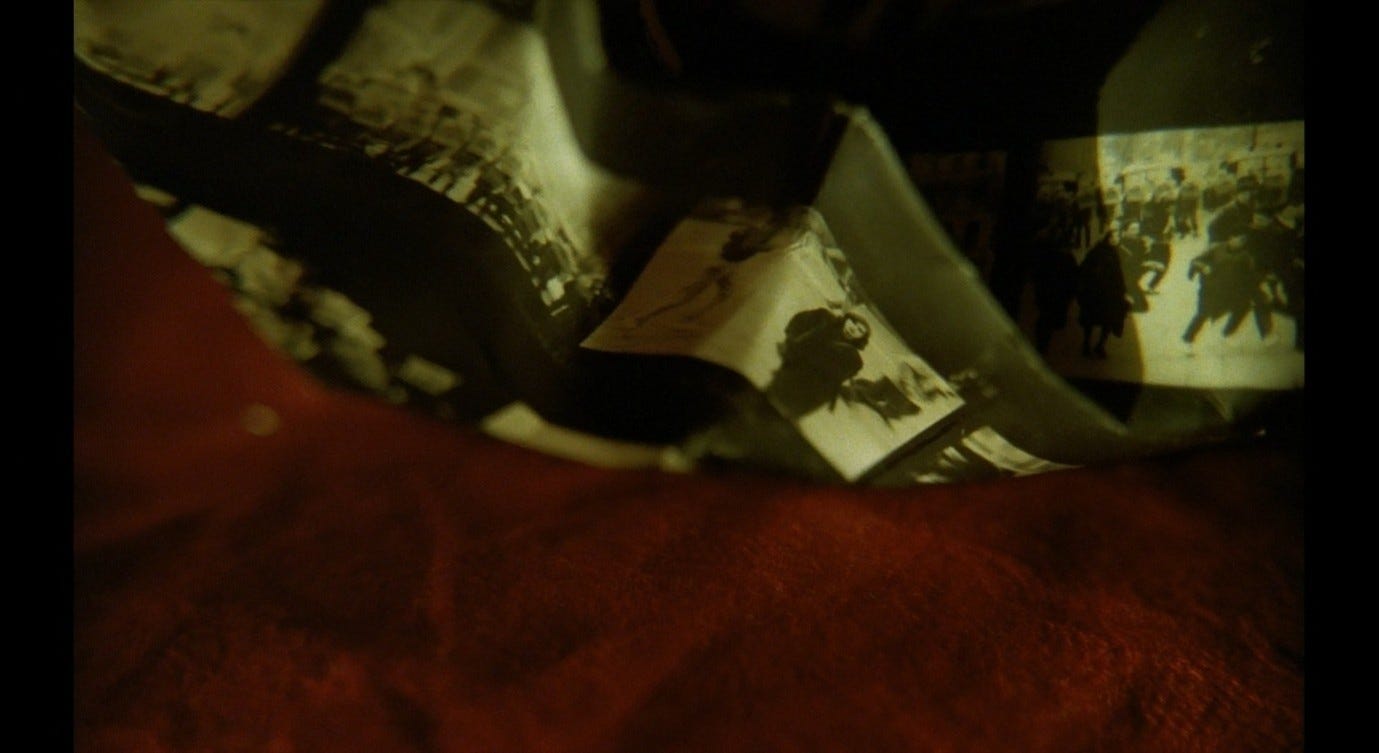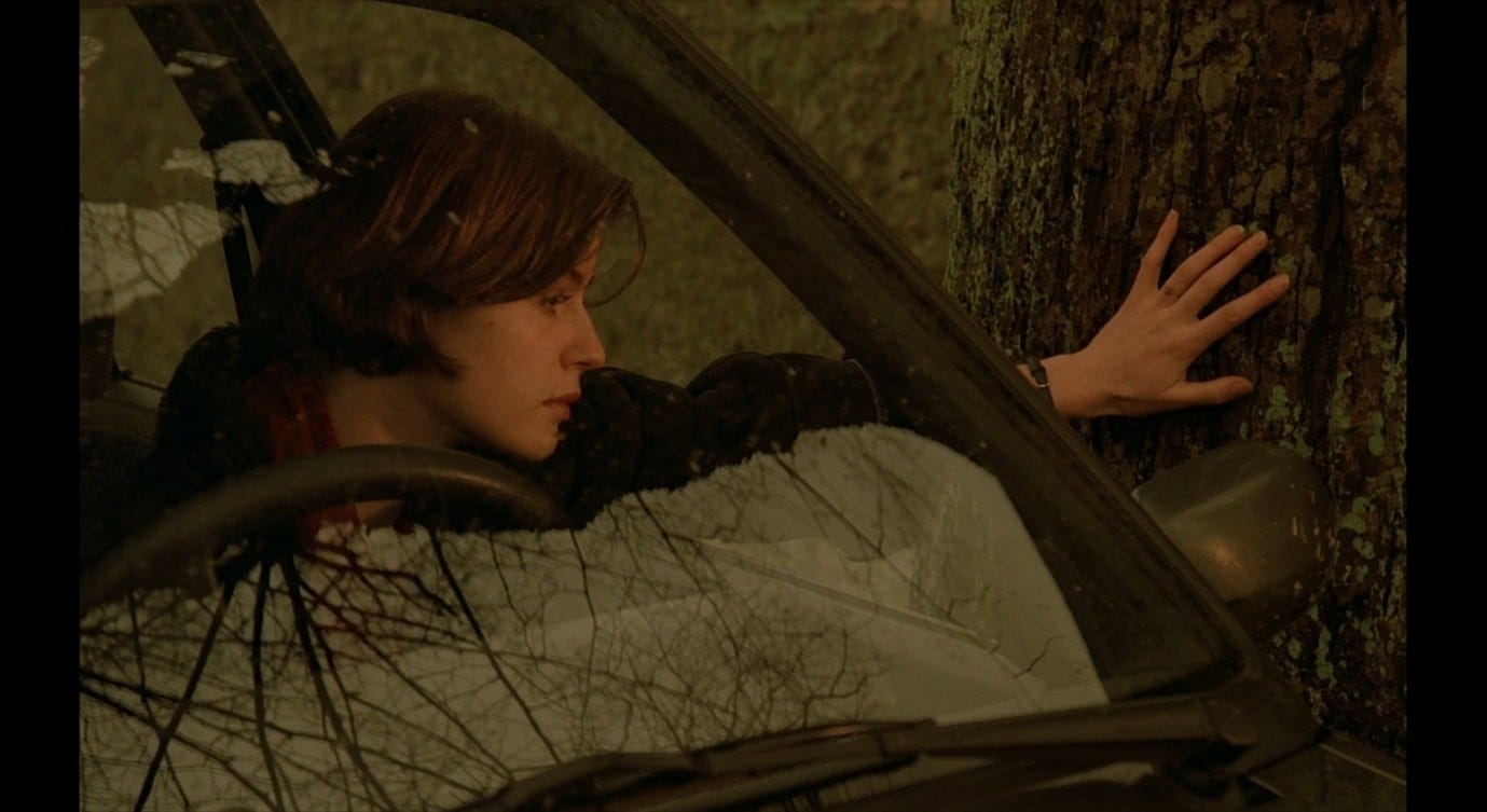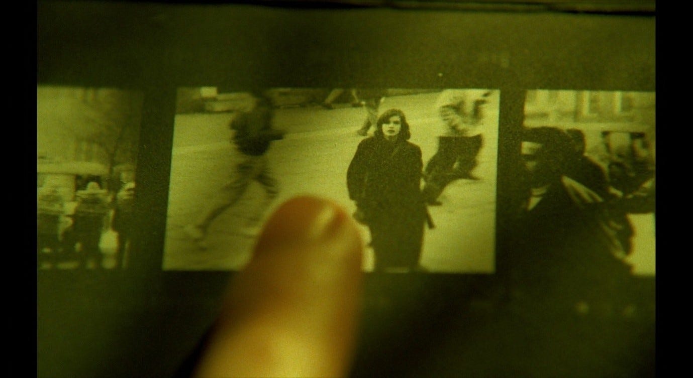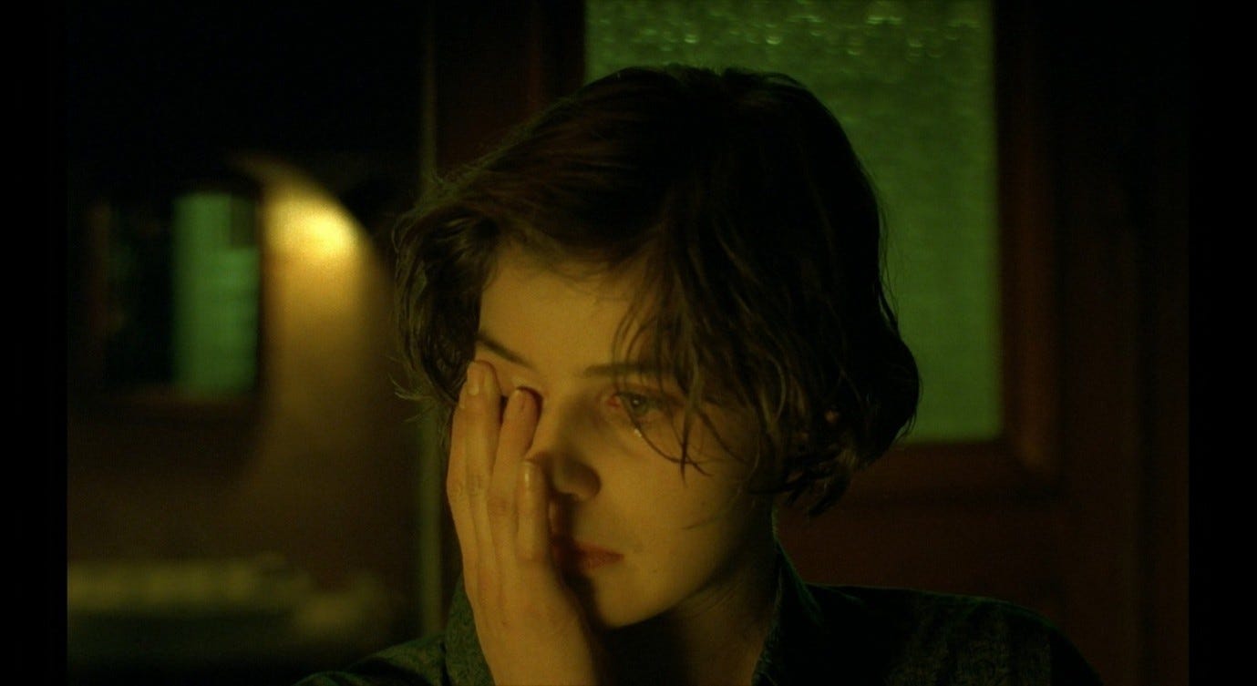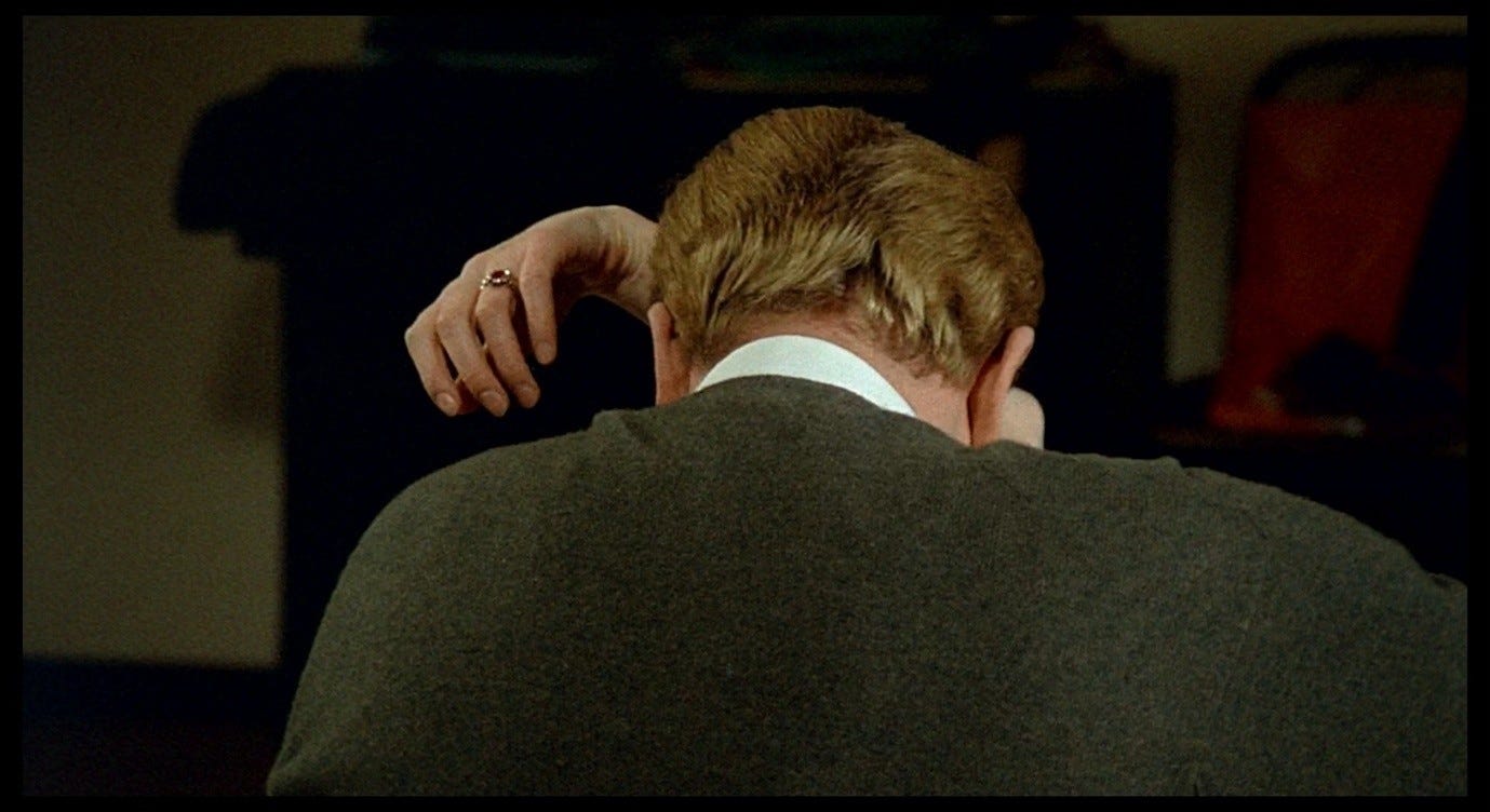 The Double Life of Véronique presents a more complex version of this trope, and one that bears a closer resemblance to the sex scene in Red Desert. Alexandre, the puppeteer, courts Véronique in ways that he intends to be romantic, but that ultimately come across as sinister. This pursuit culminates with the two having sex in Alexandre’s hotel room, in a context where Véronique does not initiate or (I think) want a sexual encounter. Indeed, like Giuliana, she is profoundly upset: she has just discovered an image of her other self – Weronika, her Polish alter-ego – in a set of holiday photos. Seeing this image, Véronique realises that her recent, inexplicable feeling of loss must have been a response to this alter-ego’s death. That sense of loss flared up in her, earlier in the film, while she was making love to her previous boyfriend. She sent him away in order to be able to process this feeling alone. Now, in the hotel room with Alexandre, she fully realises the nature and cause of her grief, while he (without getting consent) obliviously has sex with her.
