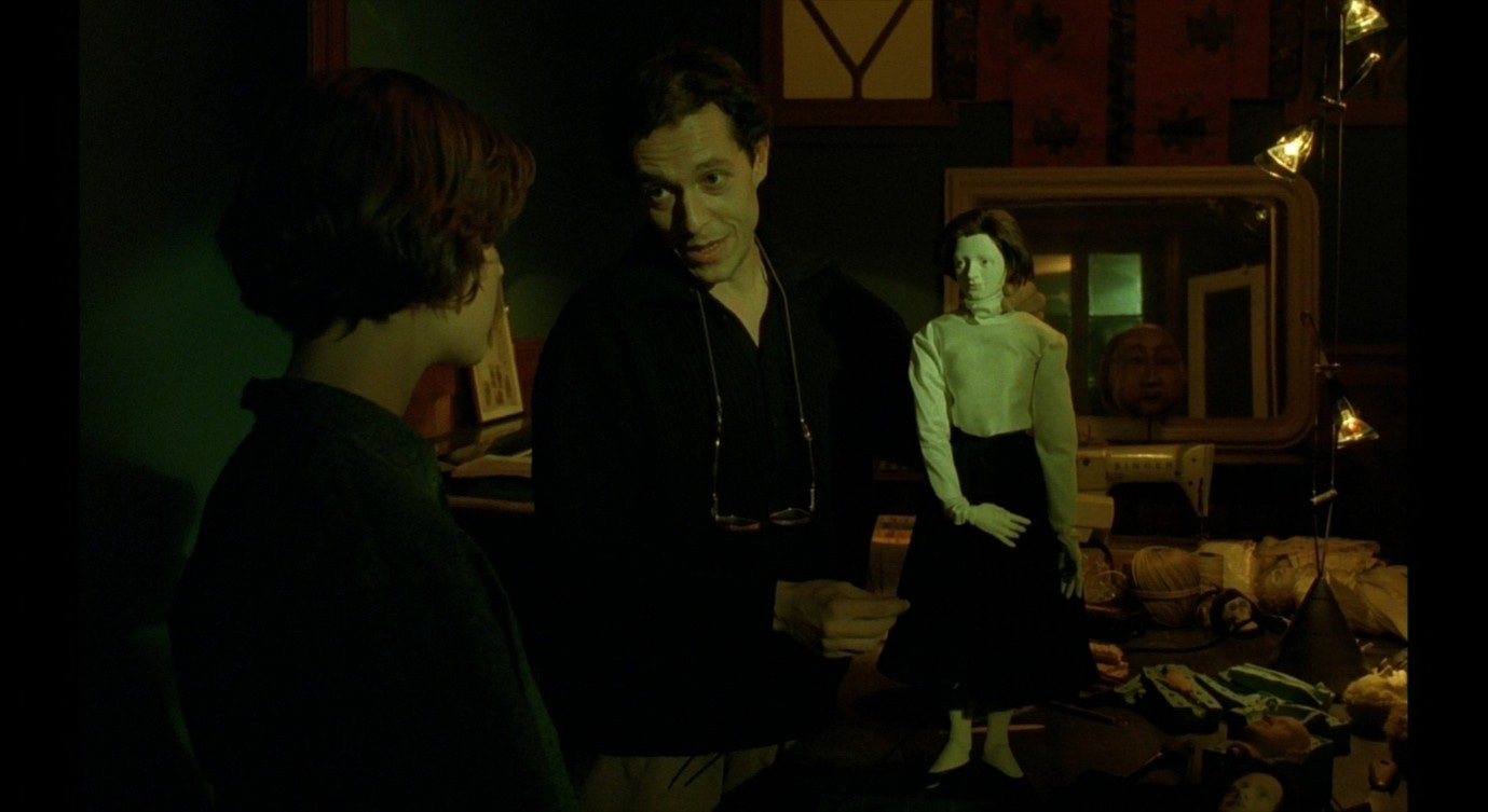 Kieślowski allows for a certain amount of ambiguity about Alexandre’s intentions, or about whether this relationship will be fulfilling for Véronique. At times, the film might seem to suggest that Alexandre has been sent by the universe to make up for the death of Weronika, and that when these two have sex this marks Véronique’s acceptance of loss and her progression to a new, truly fulfilling relationship with another ‘other’. Various supernatural signs and coincidences seem to lead Véronique to Alexandre, as though the spirit of her alter-ego were encouraging her to pursue this relationship. However, upon seeing the holiday photo from Poland, I think Véronique realises that those signs – insofar as they were supernatural – were not intended to couple her with Alexandre or to mark him as her soul-mate. Rather, he is the instrument through which the existence of the alter-ego is revealed, as he is the one who points out Weronika in one of the photos. Just as his value to her is purely instrumental, so Véronique is only important to him as a sex-object and a source of material to feed his work. When she learns that he began communicating with her as a kind of experiment, to test out a story he was planning to write, she temporarily shuns him. At the end of the film, when he reveals his creepy Weronika/Véronique-inspired twin-puppets, she realises that her instincts were correct, and that he is still just using her. The story he intends to write about her has the same title as the film we are watching, exacerbating the sense that Véronique is trapped in an exploitative construct.