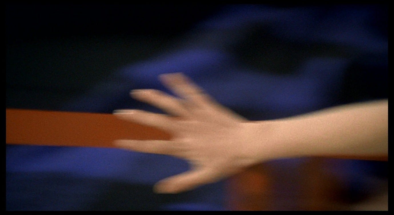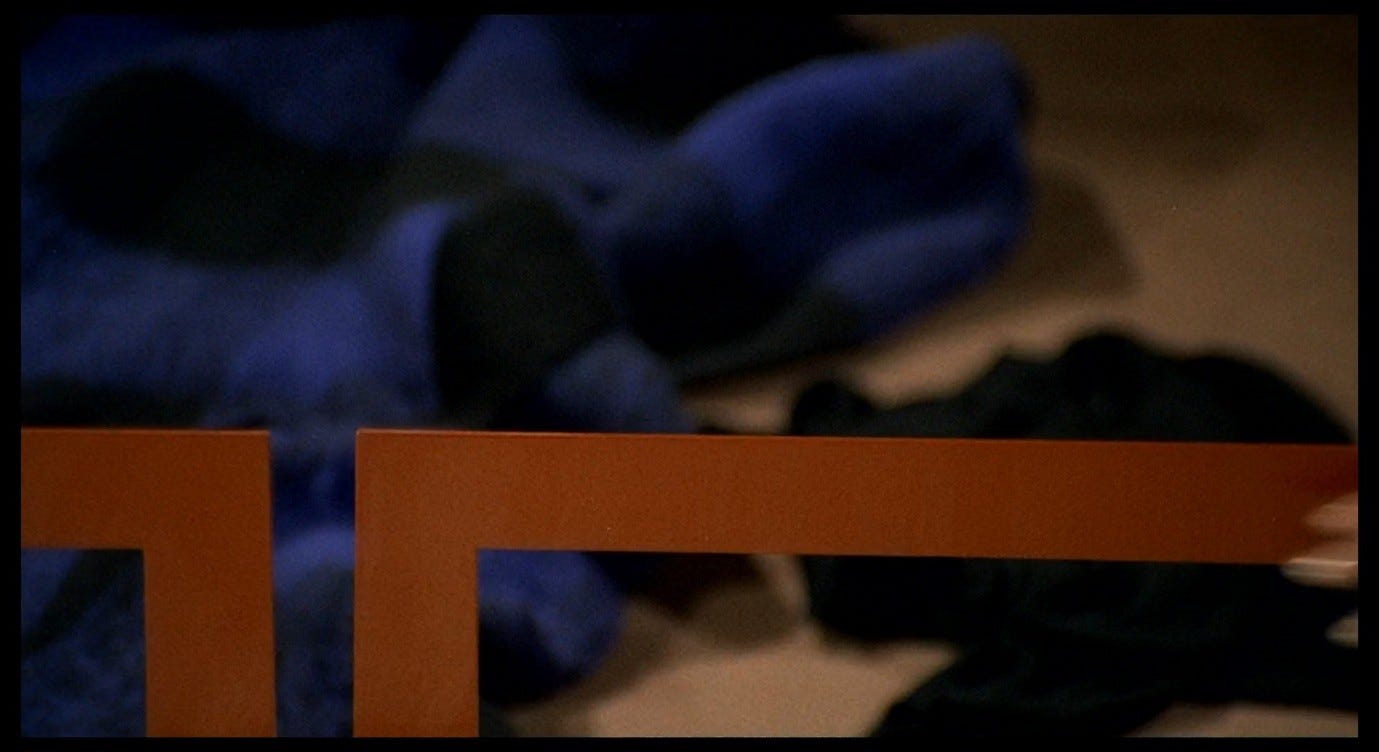 In the bed-frame shot, we also begin with a person, or a part of one: having been ‘reduced’ to her legs by Corrado’s gaze earlier, now Giuliana is seen only as a hand lunging for safety. We glimpse her fingers, vanishing from the bottom-right corner of the frame as the camera pans, and as in the blue-line shot we seem to replace the person with an object, or with a shape.