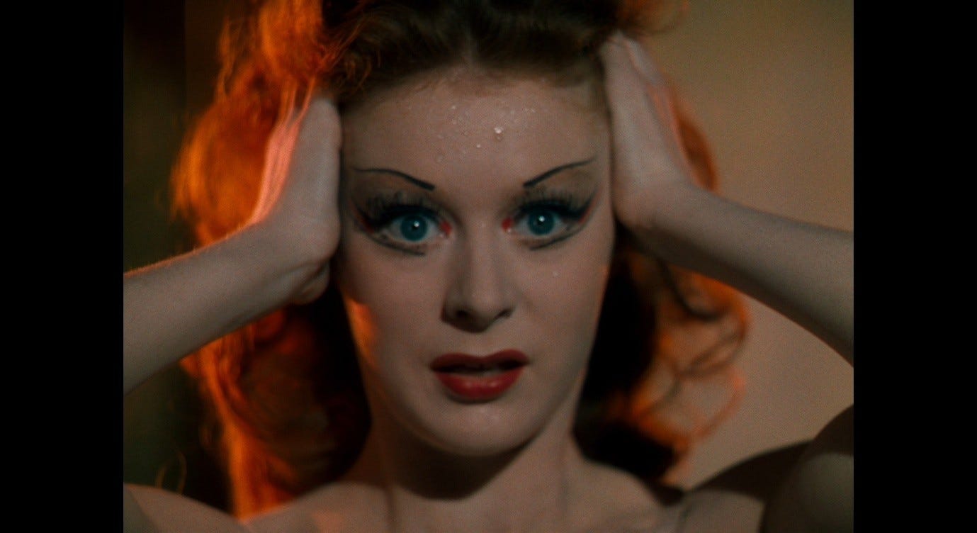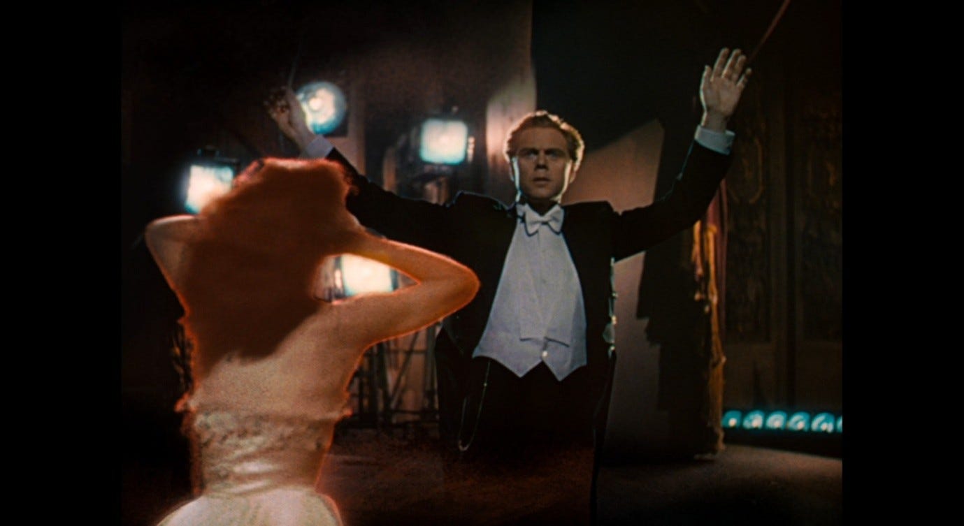 Giuliana’s gesture recalls a pivotal moment in The Red Shoes. During the Red Shoes ballet, Vicky faces the Shoemaker and clutches her red hair in terror. As she looks at him and the spotlight turns on and off, he transforms into Lermontov and then Julian, the two men vying for her allegiance.