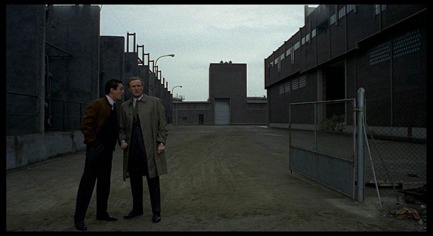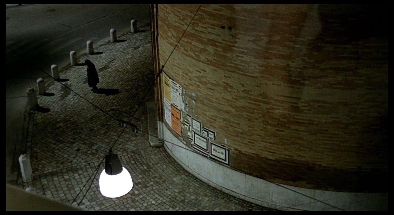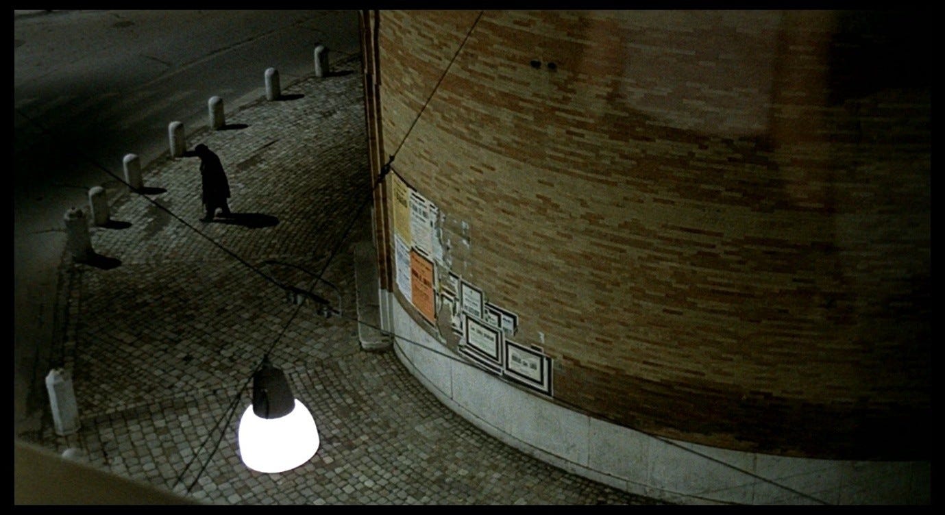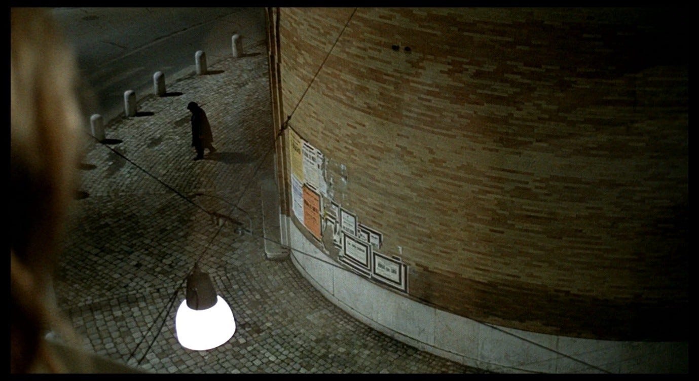 Giuliana’s hand-gesture in Red Desert makes me think of The Red Shoes, partly because of the other allusions I identified in Parts 12 and 22, but also because that same combination of a rejection and a plea for help seems to be in play here. Giuliana puts her hands out against the ‘wall’ that is Corrado, wanting that wall to be there for her, supporting her, but also wanting to stop it from closing in on her. Earlier, in Mario’s apartment, we saw Giuliana move around the room and then address the space (on the sofa) she previously occupied, as she spoke about the ‘other woman’ in the clinic whose identity needed to be explained to her (by Giuliana). It was supposedly her mode of ‘loving’ that caused that identity crisis, that split in her self, and now in the hotel room her mode of loving and Corrado’s are in conflict. The doctors had warned her that she was loving in the wrong way, that she needed to love one single, discrete thing at a time. Vicky, in The Red Shoes, could not sustain an attachment to both Lermontov and Julian, could not (so she was told) be an artist and have a personal life, and needed to choose between them. Corrado too is imposing a specific kind of ‘love’ on Giuliana, perhaps believing that the specificity of having sex with one man will cure her of her everything-at-once emotional crisis. But Giuliana rejects this proposition. It is not the kind of help she needs, and if anything it will exacerbate her crisis.