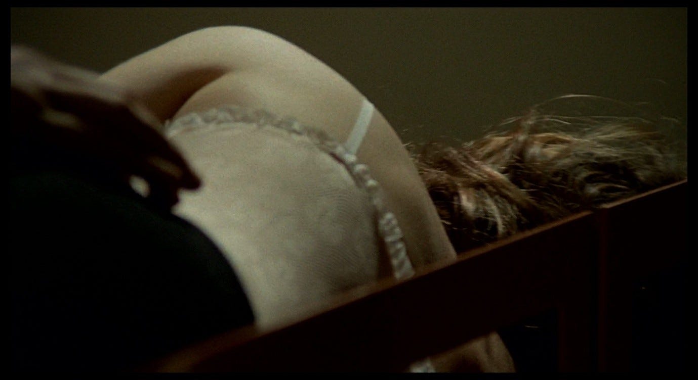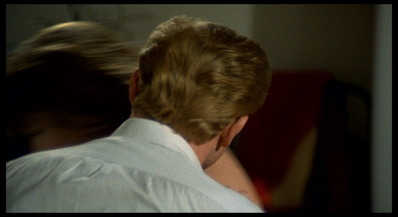 Then, in the reverse-shot (the same camera set-up as the one where he told her to calm down and asked what she was afraid of), we see Corrado seamlessly transition into erotic caresses, and he begins to remove her clothes.