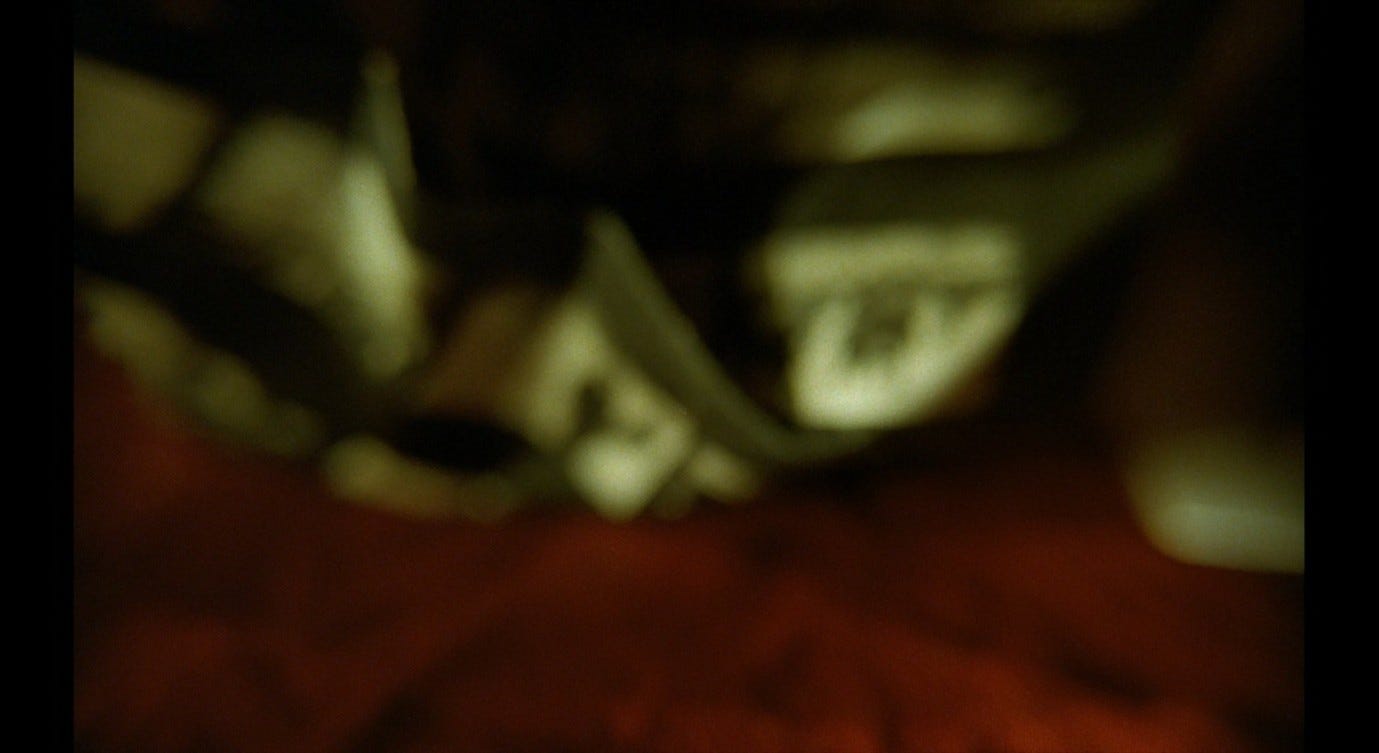 The colourful stains on the walls and ceiling, and the darkness that makes them disappear altogether, are (like the electronic noises) evidently responding to the characters’ interactions. They are symptoms of something in the condition of this interpersonal relationship, and that something is becoming more intense and all-consuming. Corrado continues to grope Giuliana, but the camera stays focused on her: she writhes backwards in what seems like a gesture of pain and resistance, and for one haunting moment she looks directly into the camera. We see Giuliana in a way that Corrado does not, and she sees us looking at her.