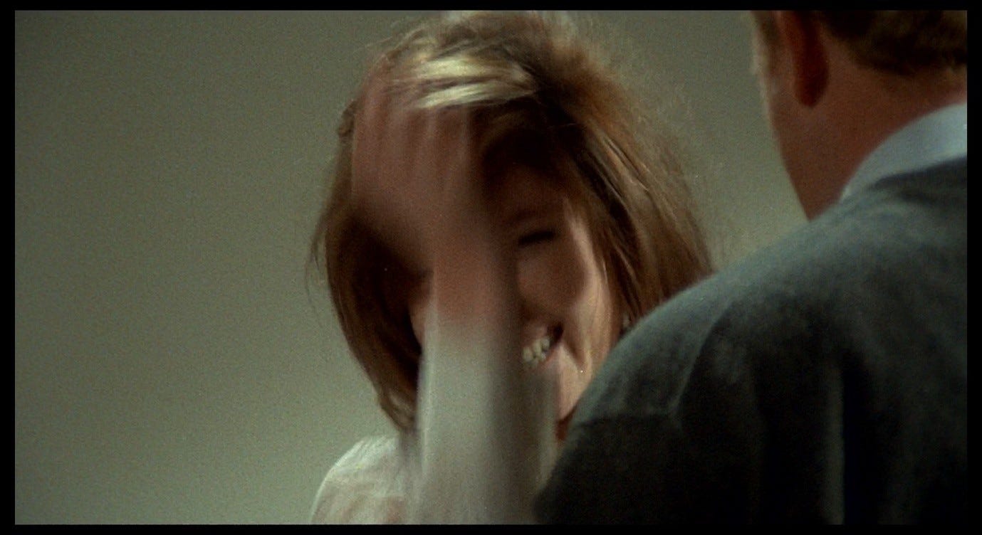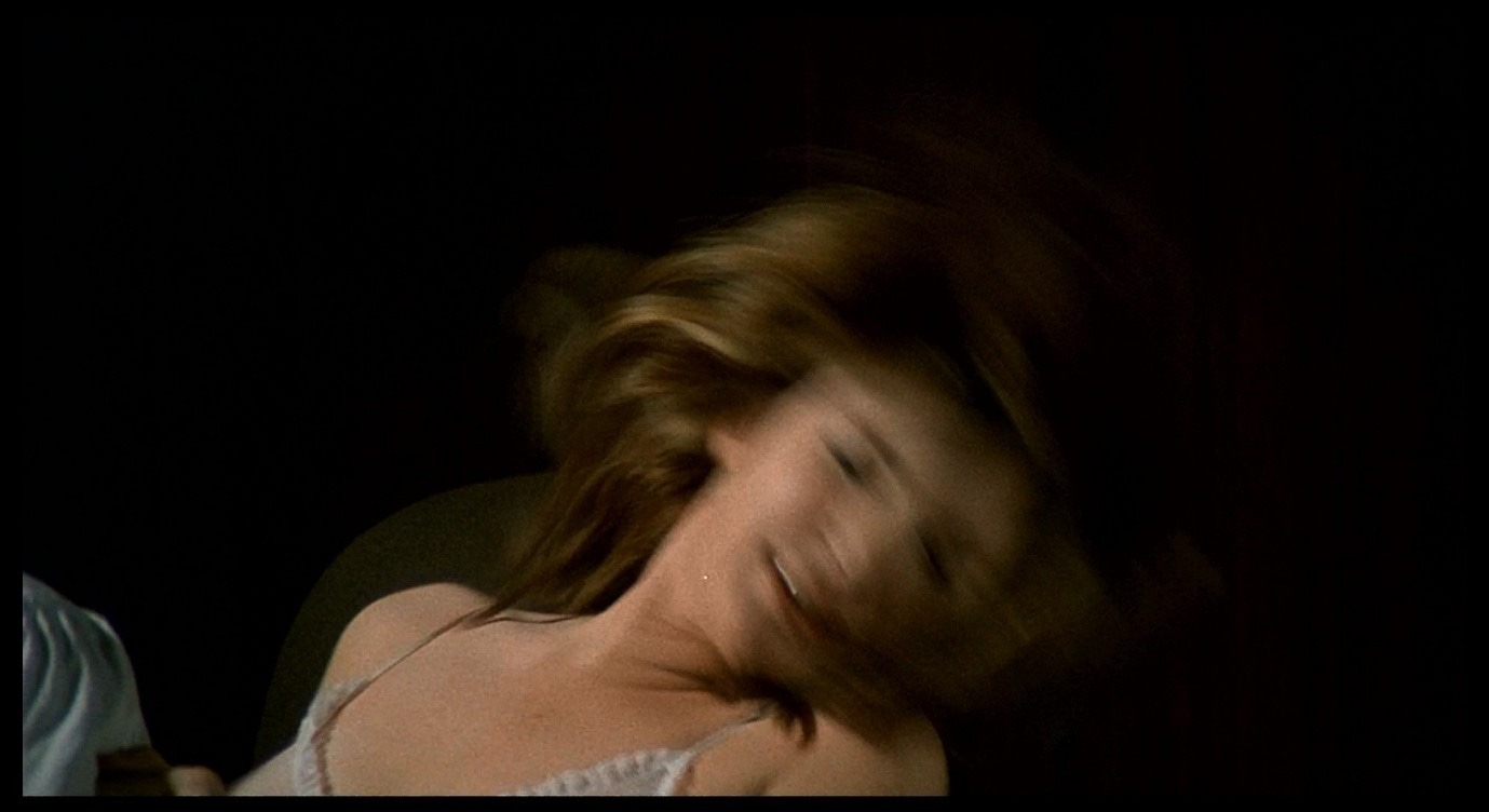 When Corrado forcibly lowers her onto the bed, she throws her head back and we see a brief flash of her bared teeth. We cut on this action to a closer view of her face (with Corrado’s obscured by the red bar) staring up at us, her mouth opening.