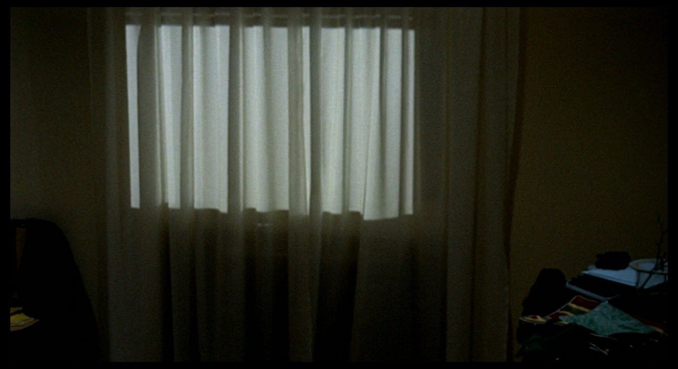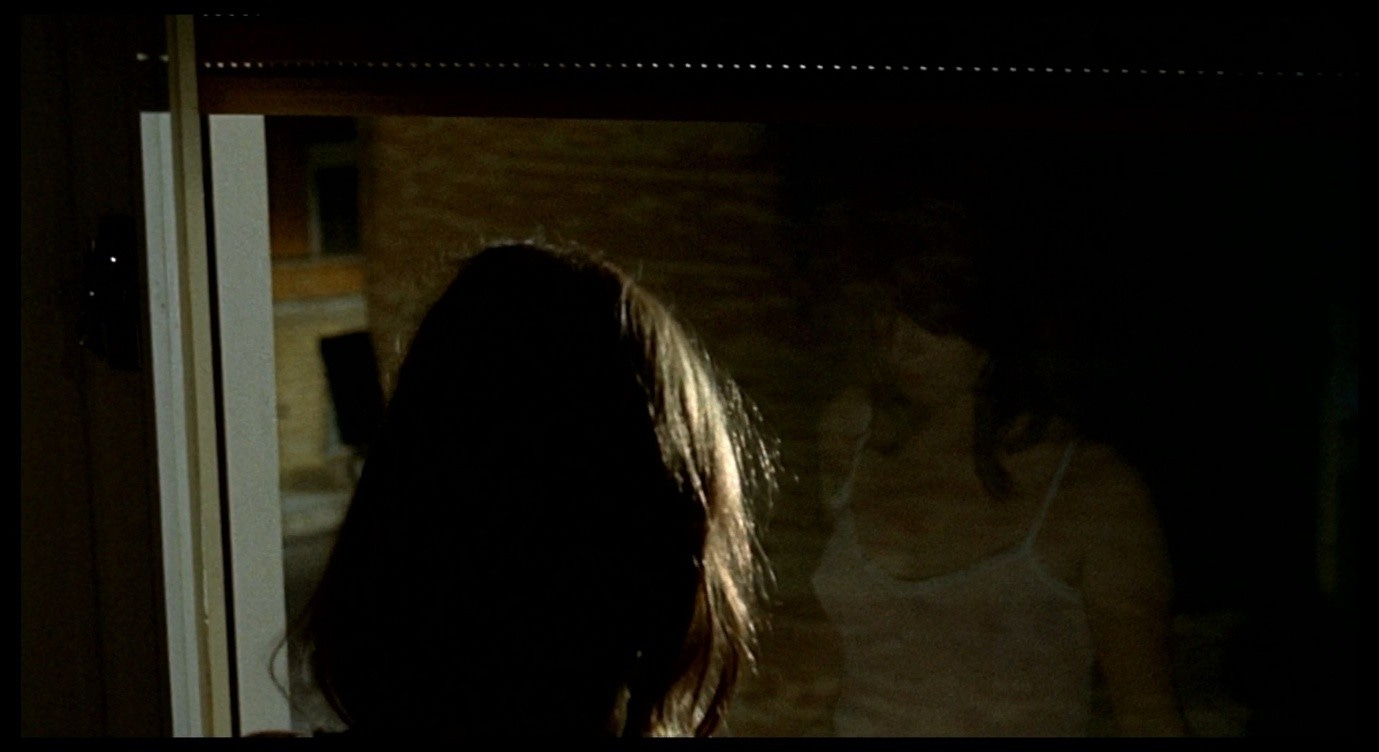 Giuliana walks out ahead of the camera and opens the curtains. The camera follows until it is positioned behind her and just above her head, looking out of the window. Then it tilts down, leaving Giuliana herself at the very edge of the frame. Following the tilt, her reflection is visible in the window.