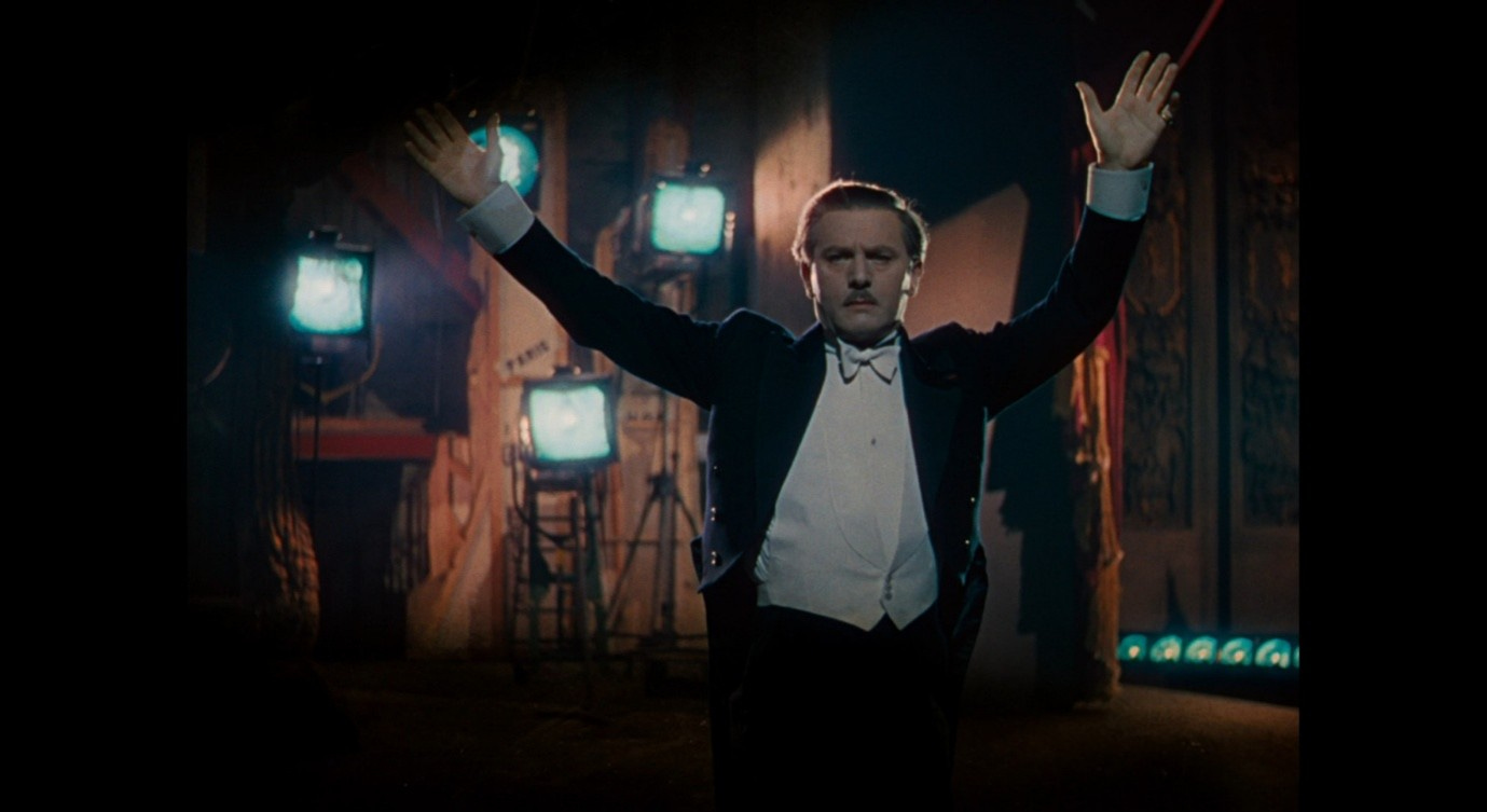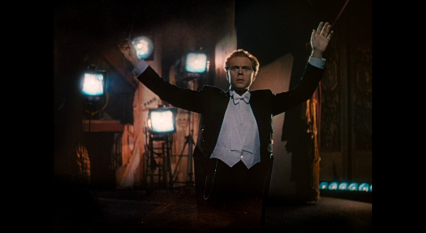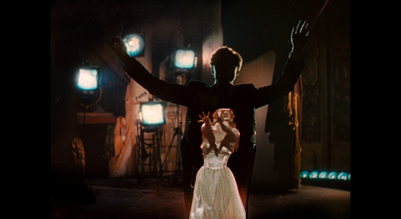 Wearing the red shoes, in the fiction of the ballet, is somehow related to the opposing demands of ‘art’ (Lermontov) and ‘life’ (Julian). Like the evil Shoemaker, both men seek to control Vicky, and their unwavering ultimatums are what will ultimately drive her to her death. Just as the red shoes deprive the girl in the story of her agency, so Vicky’s feet will respond to these men’s demands by running (as though controlled by an external force) into death. But at this moment in the ballet, Vicky runs towards the image of Julian, colliding with it (the light goes off, rendering the image an insubstantial black void), then turning around and extending her hands with the palms facing outwards.