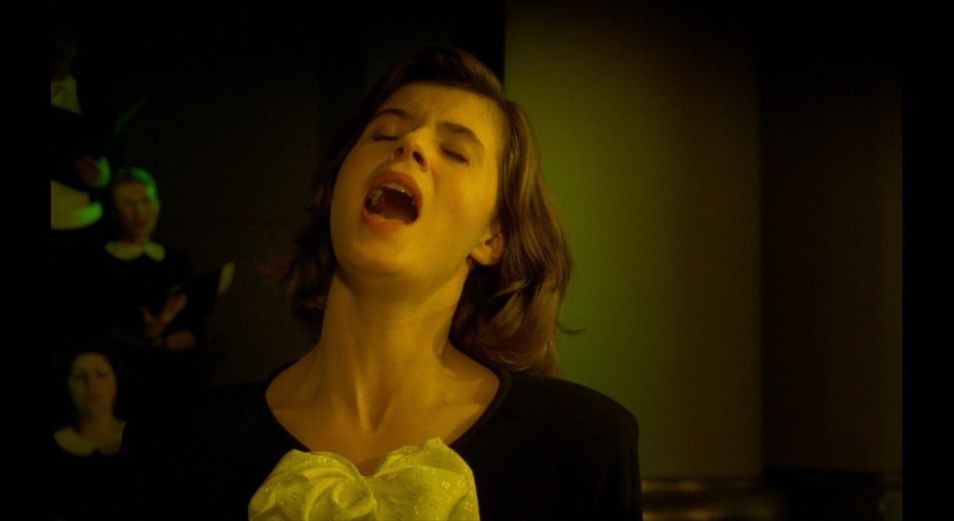 As in the other examples discussed here – and again, problematically – there is an emphasis on ‘discovered pleasure,’ and in this case we see Véronique have an orgasm. But her pleasure is highly ambiguous, as is the relationship she has begun with Alexandre. For one thing, Véronique’s attention is absorbed by the picture of her ‘other self’ during this sex scene, like Mavi looking into the mirror in Identification of a Woman. There is a link between Véronique’s orgasm (the petite mort) and the ecstatic, ultimately fatal pleasure Weronika took in singing - the moment pictured below is the one just before her on-stage death.