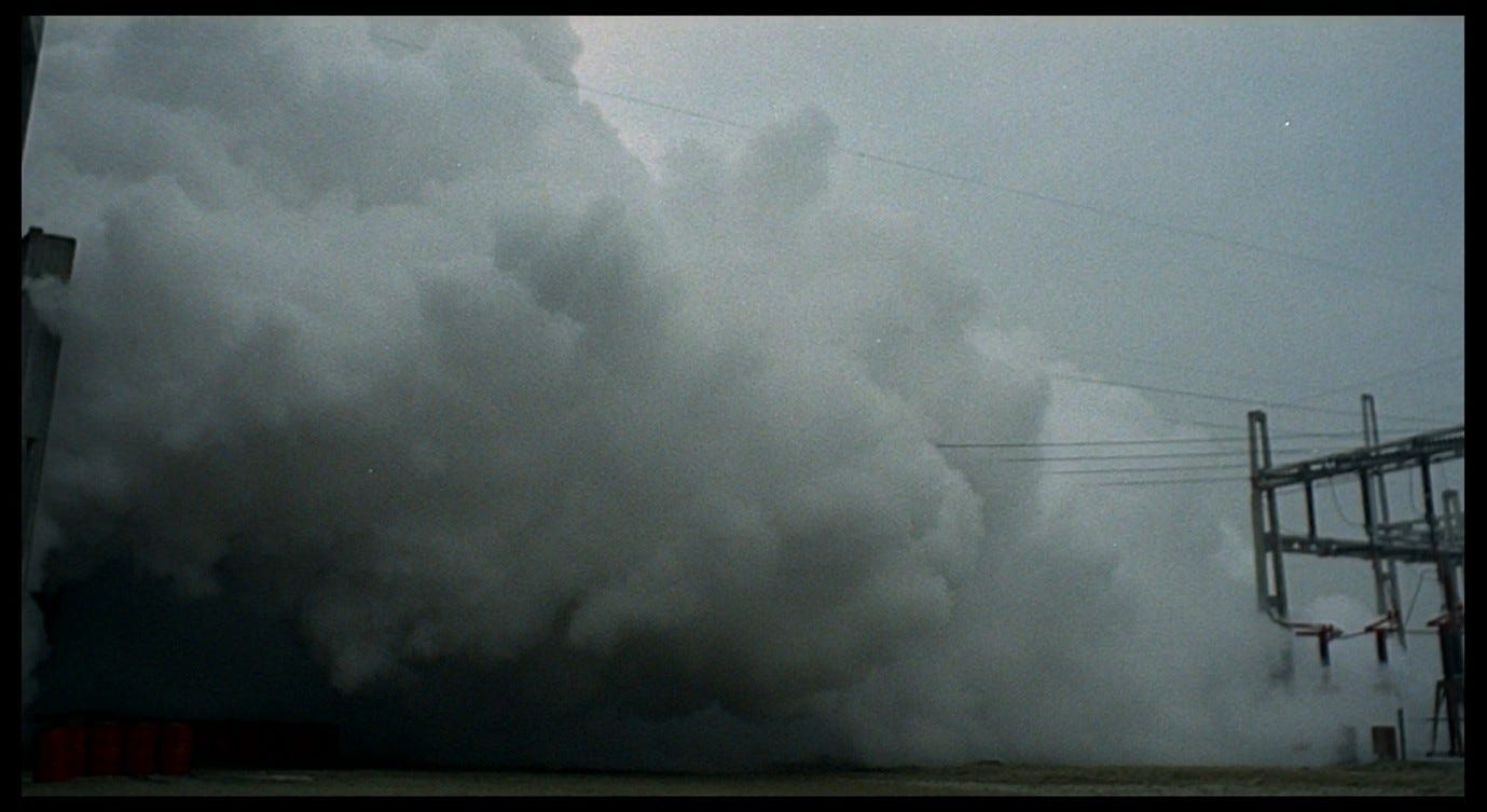 Or does the film pass a kind of judgement on Ugo’s words by drowning them out, dismissing them as somehow ‘hypocritical’ and favouring the directness and sincerity of the steam-cloud’s soundtrack-devouring ‘aaaaahhhhh’? In any case, which relationship is made ‘more real’ by the drowning out of dialogue? Ugo’s with Corrado, ours with Ugo and Corrado, theirs or ours with the factory complex, or ours with Giuliana? As in Part 8, I would lean towards the last of these: we feel unmoored and without guidance, plunged into something against our will, unable to define our relation to what we see and hear. We cut from this scene to Giuliana waking up from her nightmare, as though the steam-cloud were the nightmare, and her dream-self had been screaming, ‘The factories, the colours, the people, everything!’