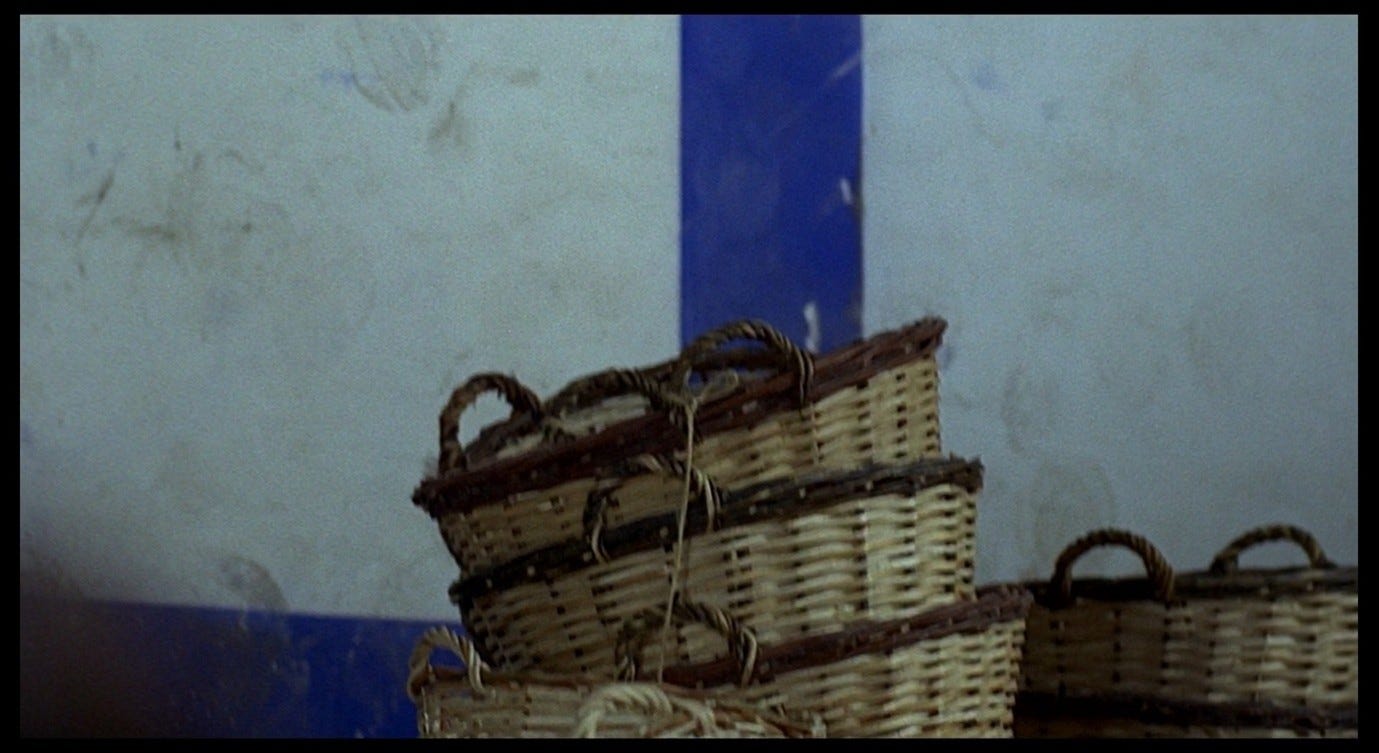 This is reminiscent of the shot in the warehouse (discussed in Part 29) when the camera looked at the ‘distressingly real’ recruit, then tilted upwards following the stack of baskets and the vertical trajectory of the blue line, eventually stopping when that line turned 90 degrees to the left. In that shot, we began with a human face, saw another face out of focus on the left of the frame, abandoned these men in favour of inanimate objects (the baskets), and finally left those behind in favour of a two-dimensional shape on a blank wall.