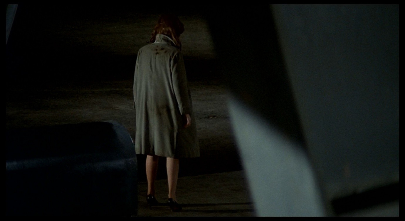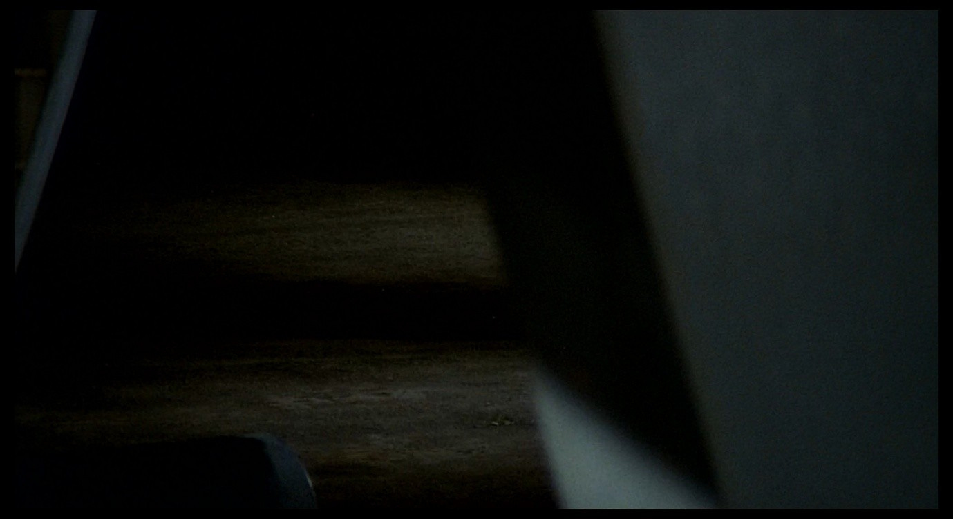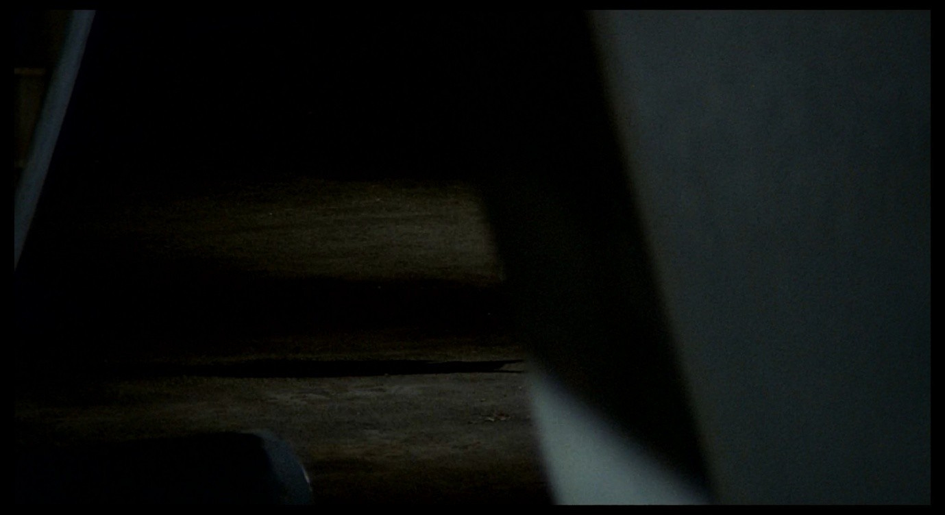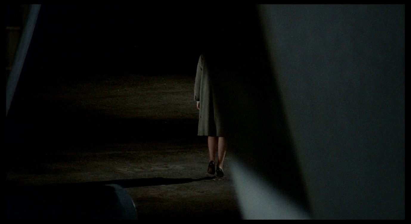 Like the downwards tilt at the start of the harbour sequence, this camera movement emphasises Giuliana’s smallness in relation to the structures around her, but in this case it also underlines the ‘framing’ effect. With the added diagonal in the top-left corner, Giuliana’s portion of the image becomes almost triangular, an ever-narrowing frame. Pools of light and shadow alternate along the ground. Giuliana walks slowly from light into shadow, her body disappearing behind the grey blur on the right. For a moment her shadow remains visible, but then it too is consumed by the shadow she has just walked into.