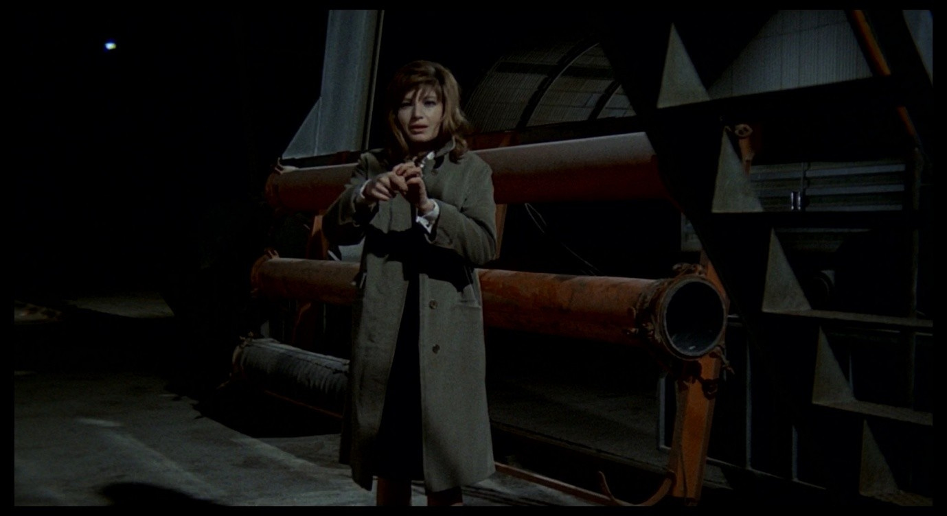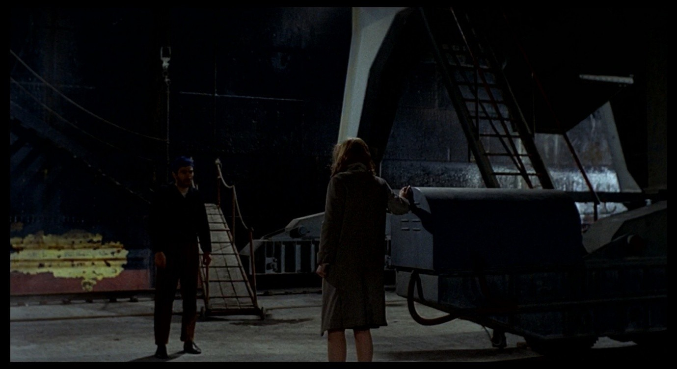 When Camus says that art points to a universal malaise d’un doigt précis, this makes me think of Antonioni’s famous comment that Mark Rothko’s paintings are ‘about nothing, with precision.’8 What Antonioni shows us so precisely is not a ‘path that all have entered upon,’ but the one by which Giuliana leaves the harbour. The camera is positioned behind the grey metal loading/unloading structure, which runs diagonally across the right half of the screen. As the camera tilts upwards, another part of the structure appears in the top-left corner.