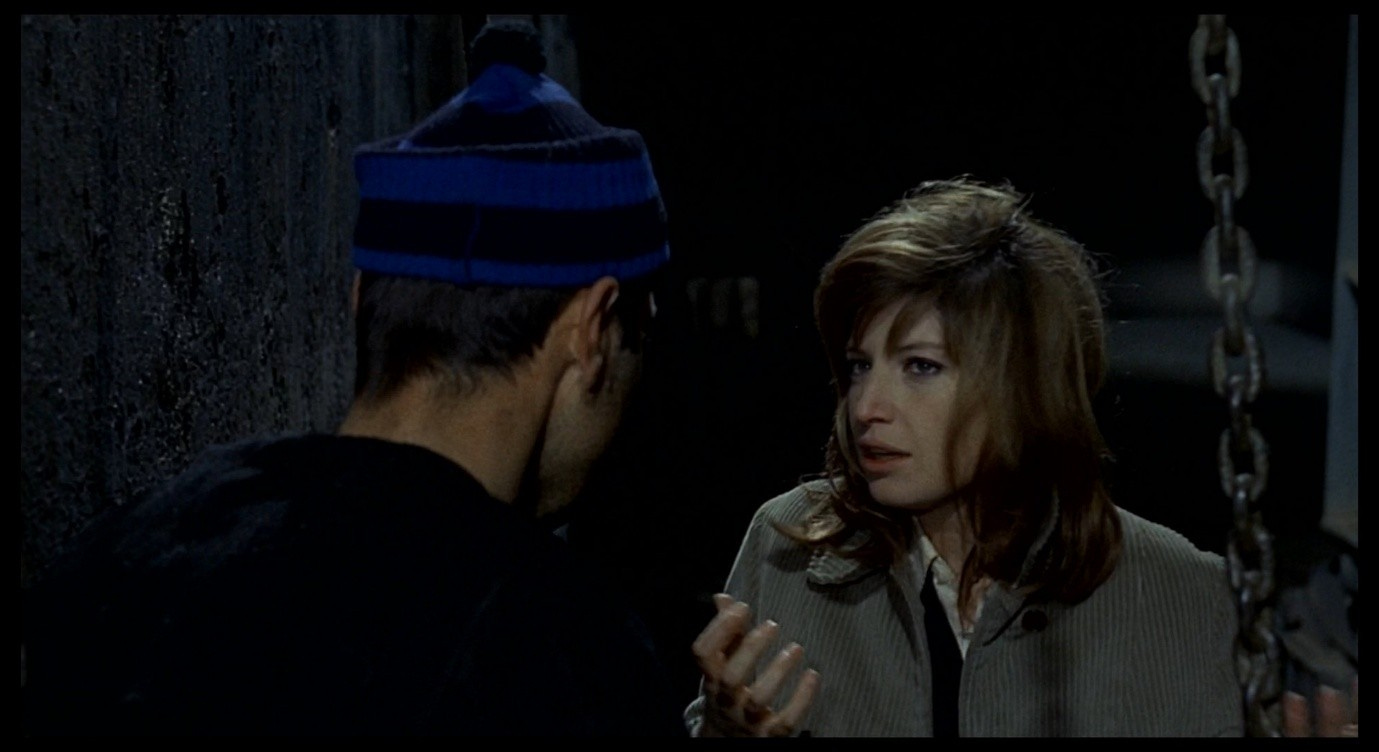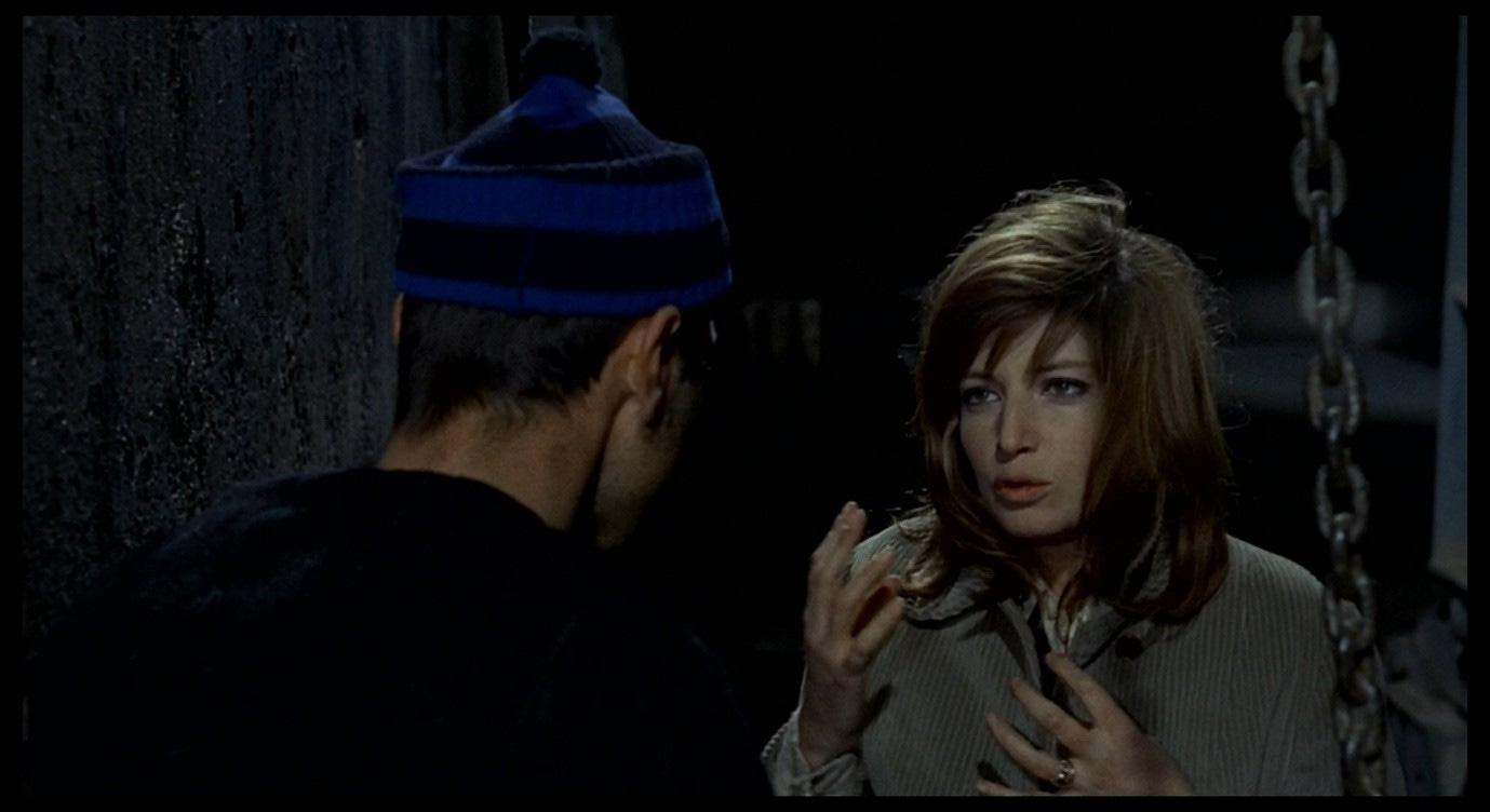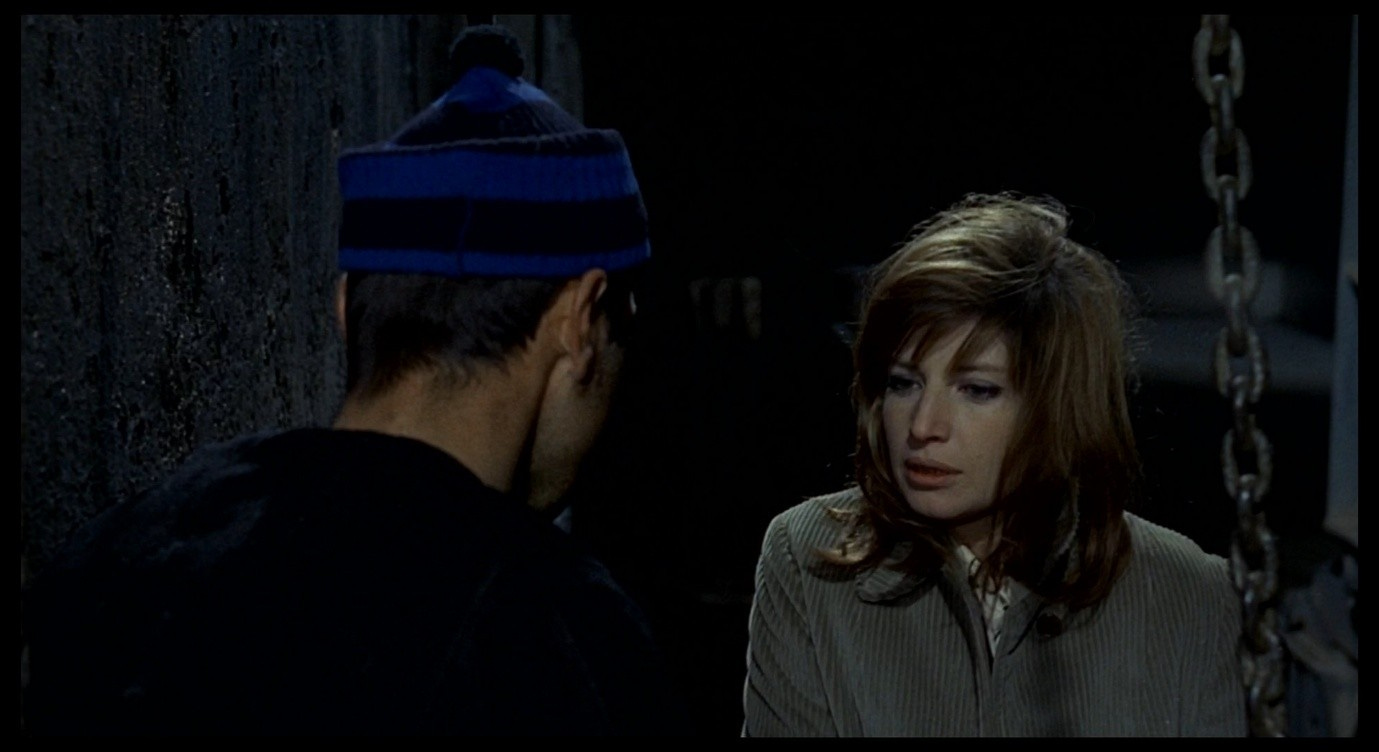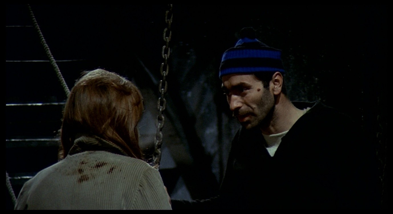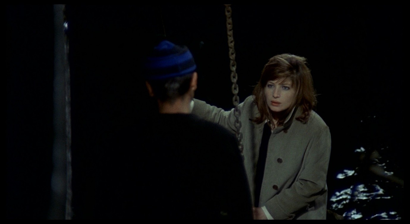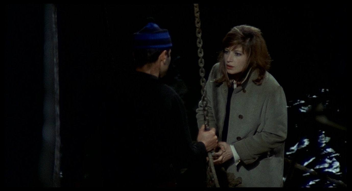 She has traversed an alien-seeming landscape that resounds with strange noises. Now we see her framed against the dark (almost black) blue of the ship and the dark (almost black) shimmering water below her. Visually, her ascent of the gangway is also a descent into oblivion; there is something poetic about this gesture. But there is nothing poetic about the sailor. This is not because he is working-class: the shadowy river-dwelling figures in Gente del Po, the invisible spazzini in N.U., Aldo in Il grido, and Corrado’s recruits in Red Desert are all, to varying degrees, portrayed as inhabiting the poetically alienated plane of reality that Giuliana is locked into here. Like Ugo, or like the factory-worker who gave Giuliana a sandwich, the sailor is just a man going about his daily tasks, and is not at all conducive to her project in this moment. Just as she wilted in the face of Ugo’s common-sense suggestions and protests, and just as she walked sheepishly away from the factory worker, so she will end up retreating from the Turkish sailor, back into the poetic darkness.