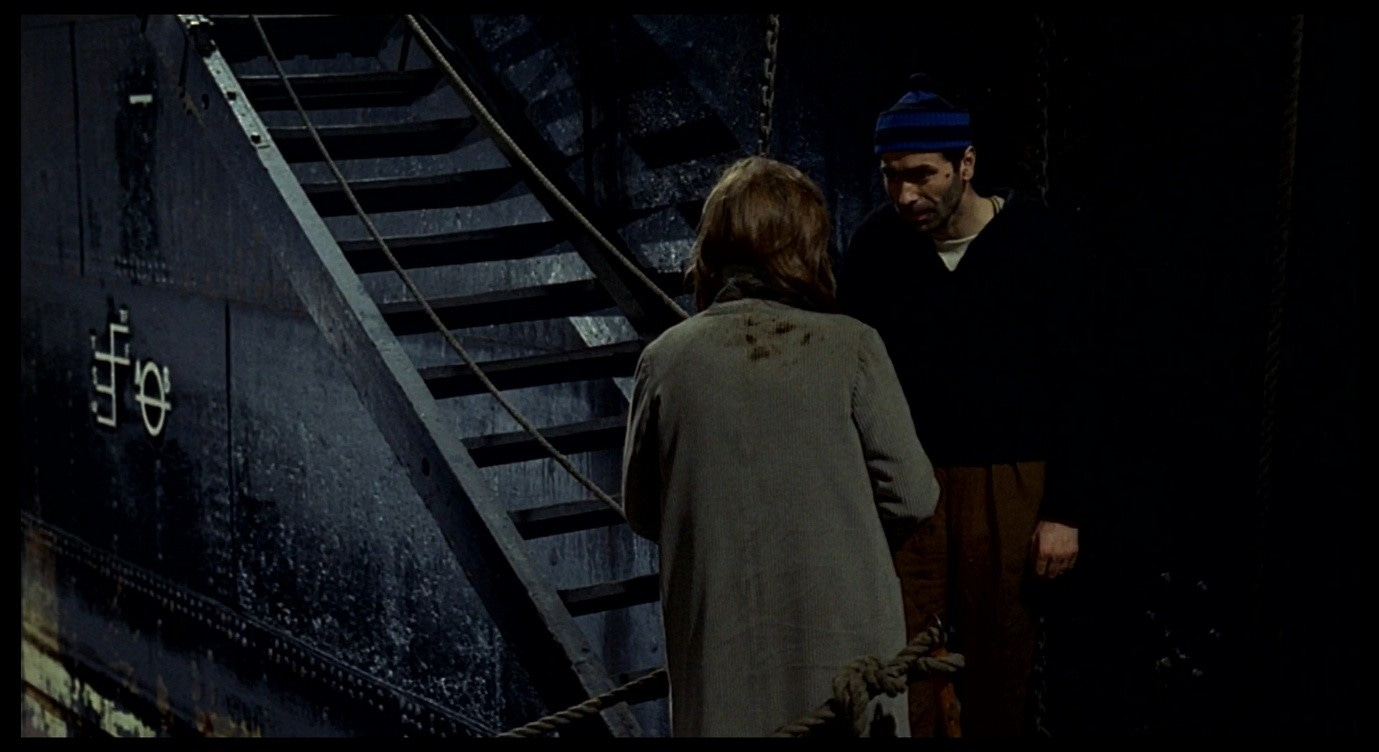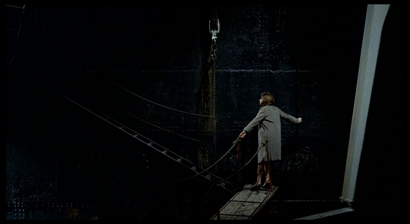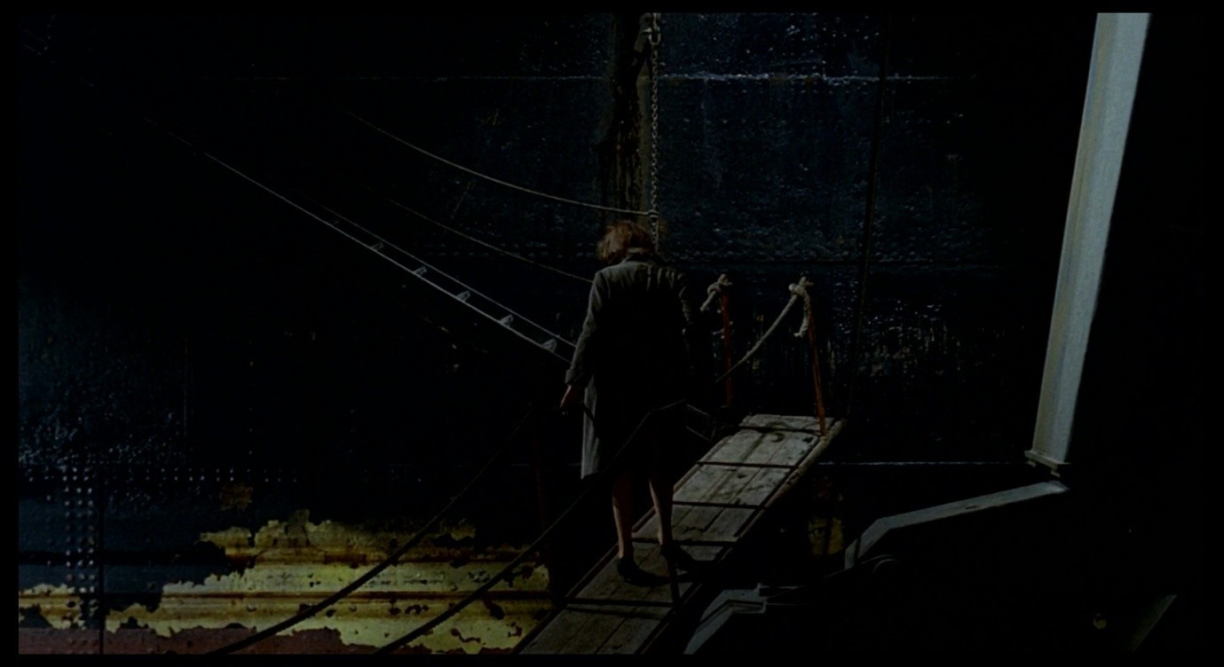 We see the sailor looking intently at Giuliana, trying to understand her, then we cut to a shot in which he is obscured behind the metal steps he has just descended, and she is isolated against the darkness on the right-hand side of the frame.