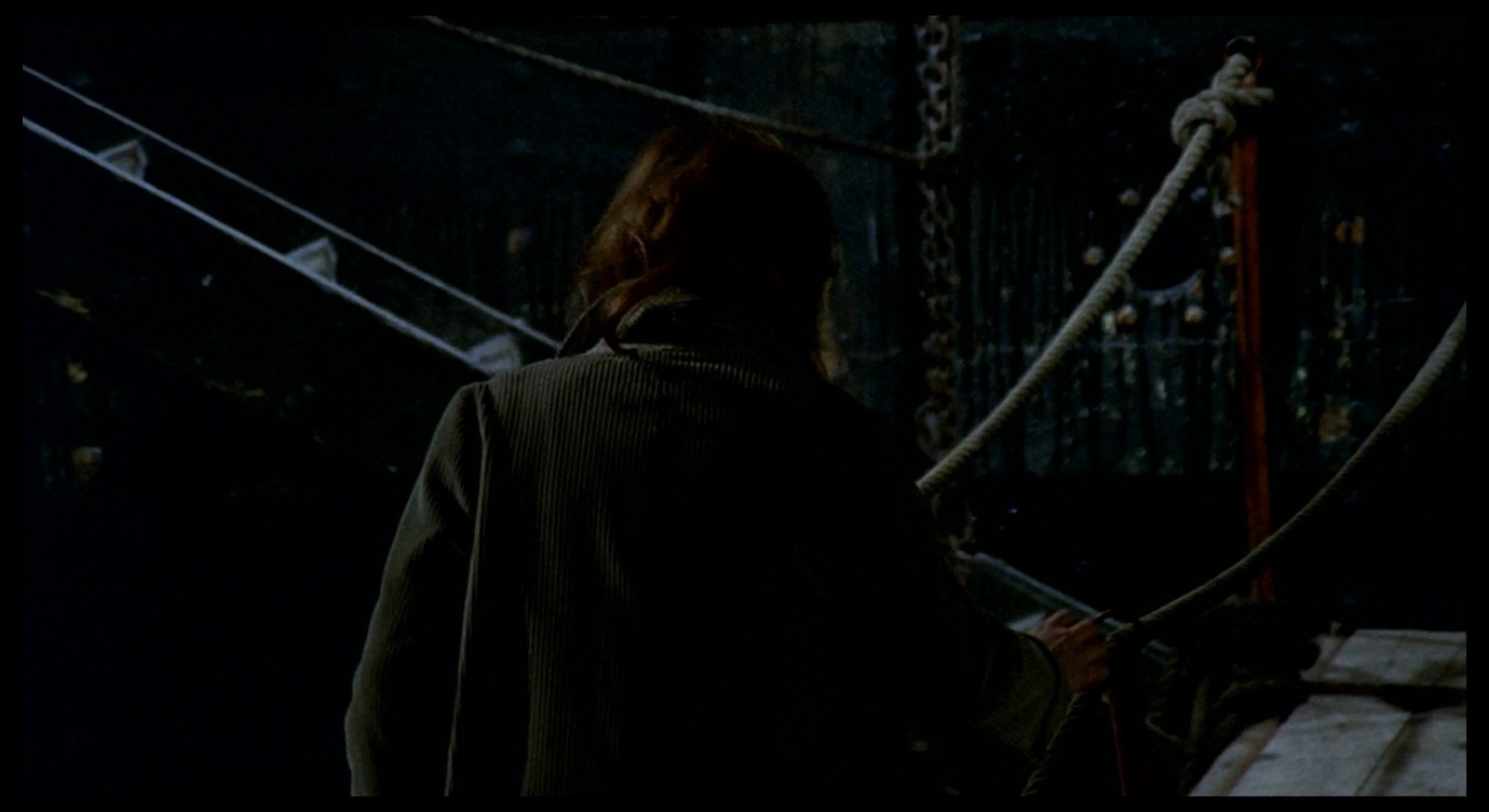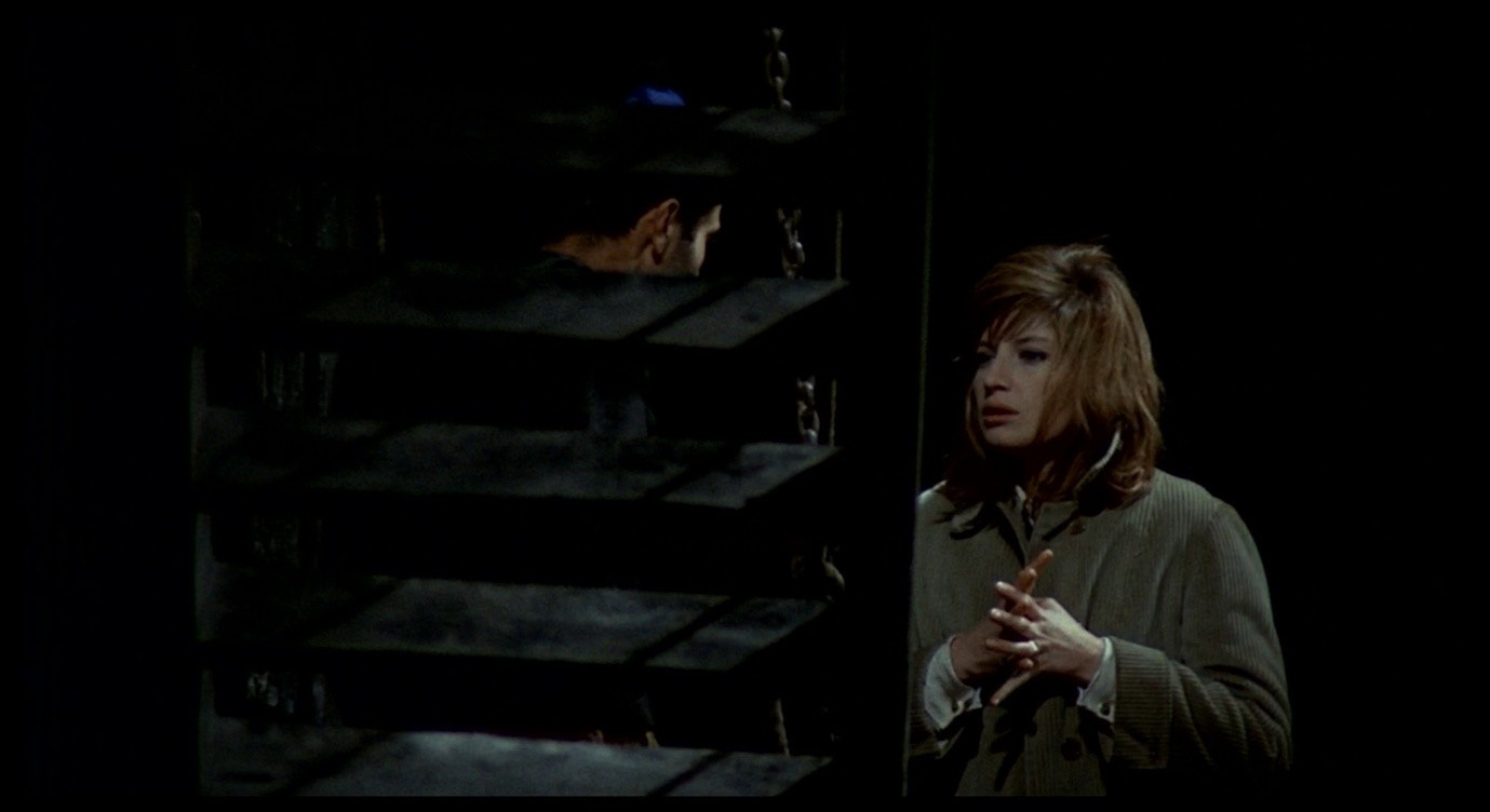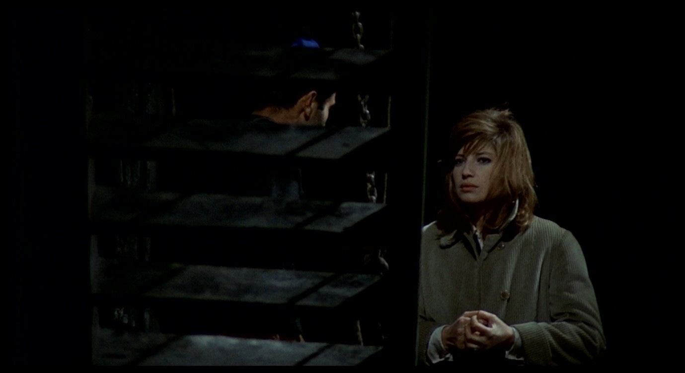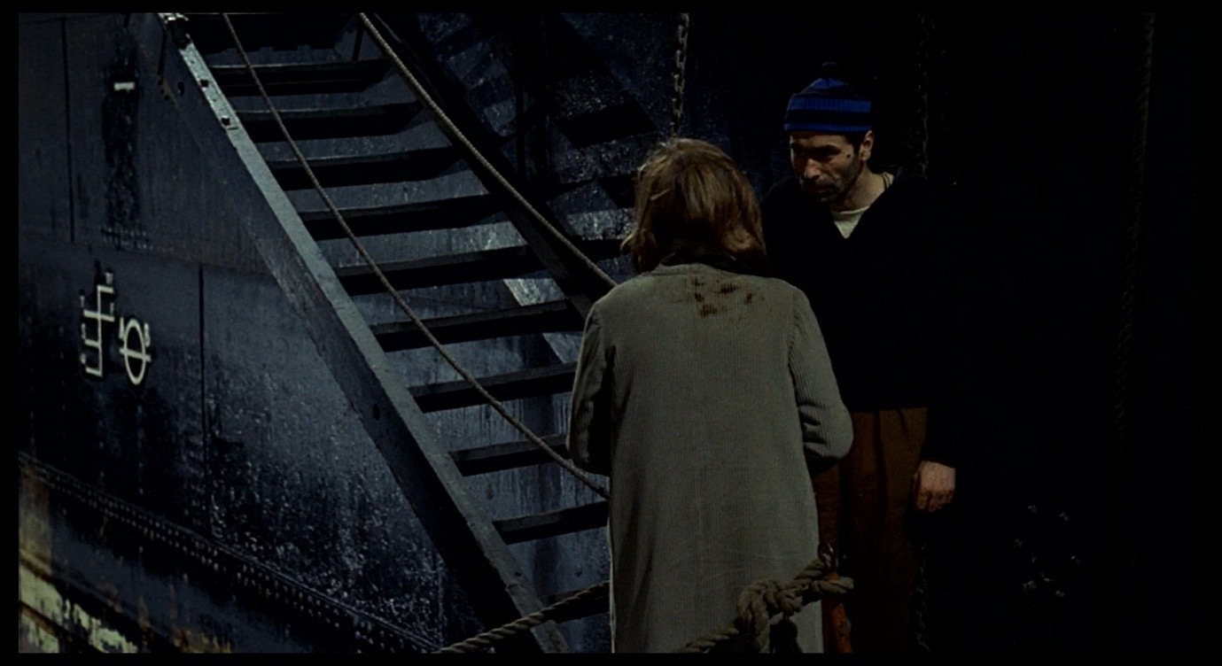 We see the sailor looking intently at Giuliana, trying to understand her, then we cut to a shot in which he is obscured behind the metal steps he has just descended, and she is isolated against the darkness on the right-hand side of the frame.