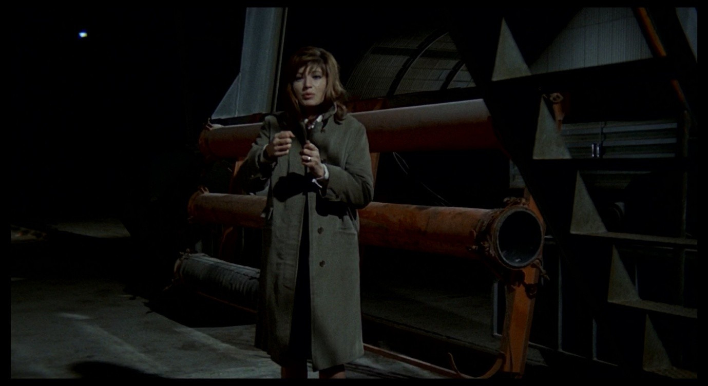 Giuliana flees from the danger of being understood, the sailor reciprocates by saying that he does not understand, and a distance opens up between them. In two successive shots, she walks past a large metal structure that blurrily dominates the foreground of the long-lens images.