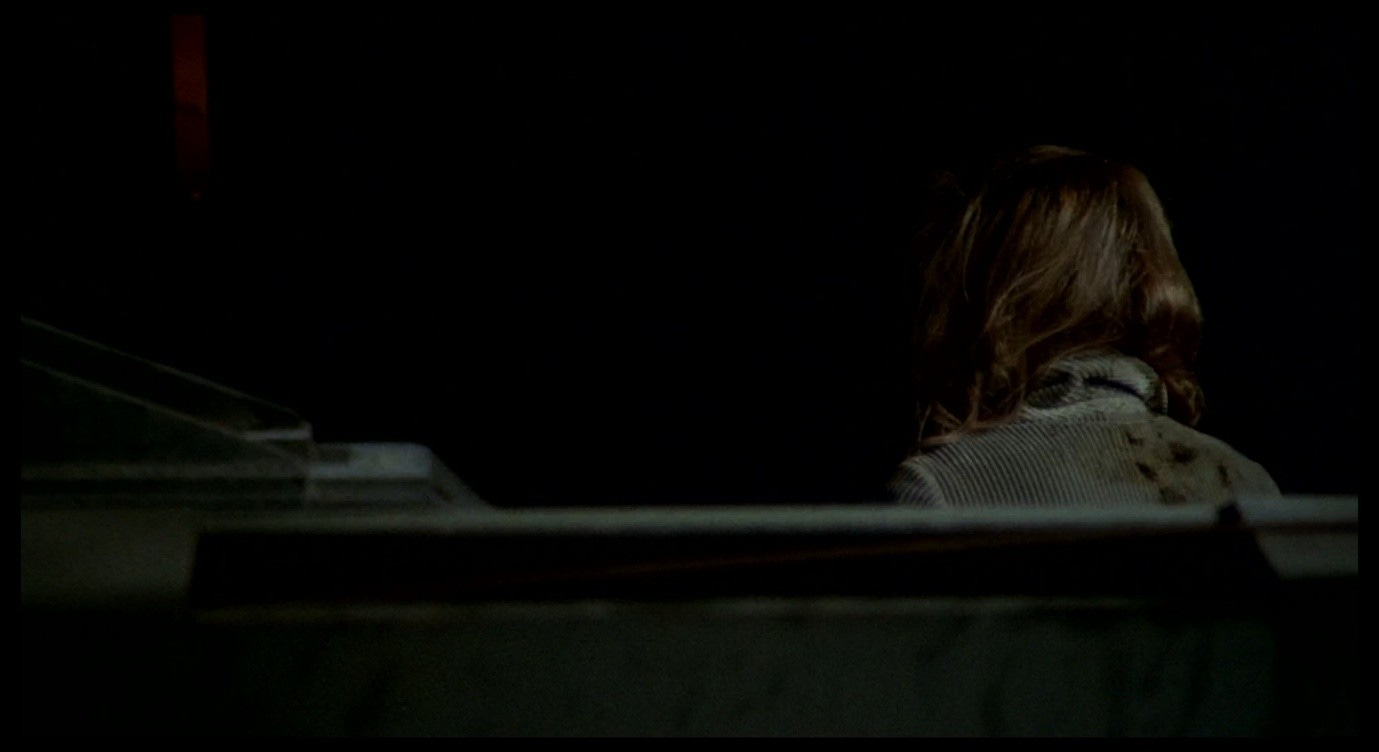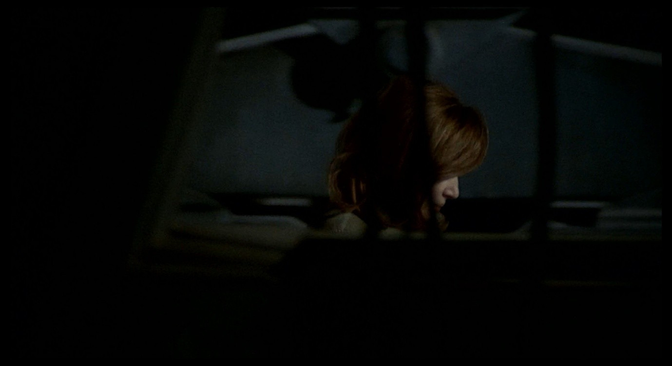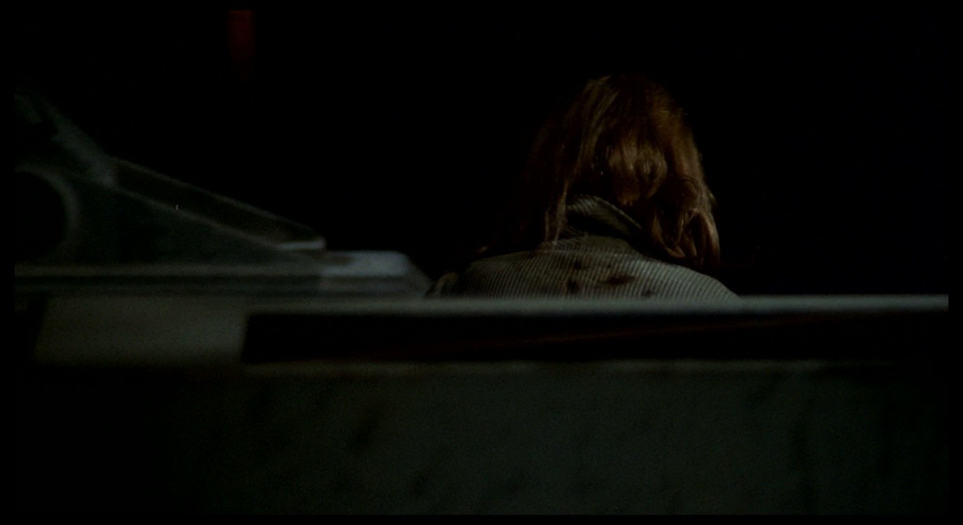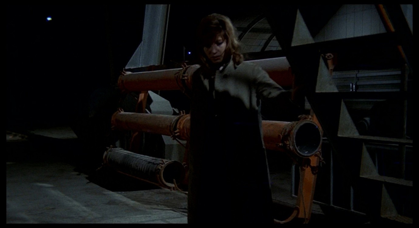 That fleeting sense of perspective, that potential for connecting with the world around her, is lost again – the world around her is visibly incapable of being connected with – and we return to a focus on Giuliana alone. Now we may notice the dark gap between the two sections of piping behind her, not visible in the wide shot. The sections have been brought close enough together to create that small shadowy chasm, without actually being joined up.