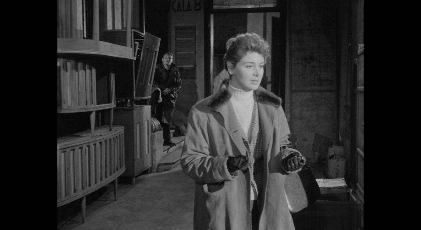 This revelation is captured by the transition from the scowling fruit-seller to the wide shot of the empty street. As Giuliana looks from the one to the other, both objects of her gaze seem to say, ‘What do you expect from us?’, and both present themselves in as chilling a light as possible, with an almost cruel dramatic relish. The fruit-seller refuses to connect. The street is just as tight-lipped and inscrutable. Neither will disclose information about what they contain, what they are doing, or where they are going. Like Clara in La signora senza camelie, Giuliana was drawn to this desert space in the hope of finding some kind of mutual understanding, but instead she finds herself staring into an abyss that stares back tauntingly at her.