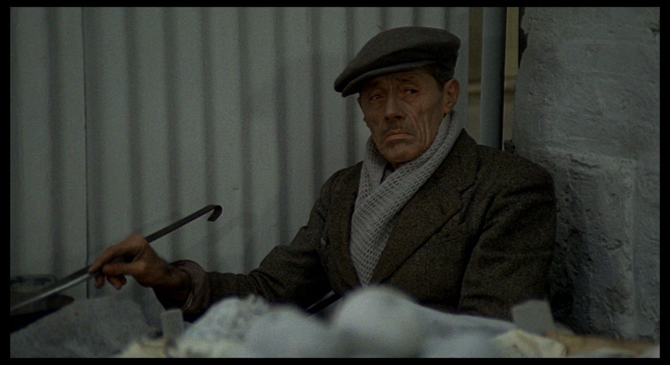 The fruit-seller was played by a non-professional actor named Tanino, recruited from a local rest home. In assistant director Flavio Niccolini’s diary about the making of Red Desert, there is a telling description of what happened when the fruit-cart scene had finished shooting: