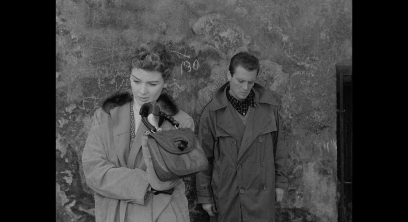 Carlo is painfully aware of the unspoken implication. If Clelia had stayed, she might have ended up marrying him or someone like him, and he could never have given her the middle-class lifestyle she now enjoys. As he says this, he and Clelia stand in front of a dilapidated wall like the one that fills the frame at the start of the Via Alighieri sequence in Red Desert. Carlo leans miserably against the wall; Clelia stands a few feet away from it, looking awkwardly away from Carlo. He is saying that he belongs in this place, against this insurmountable wall (the blockage at the end of the road), among the people who have covered it with graffiti. Clelia cannot admit this herself, but she cannot deny it either.