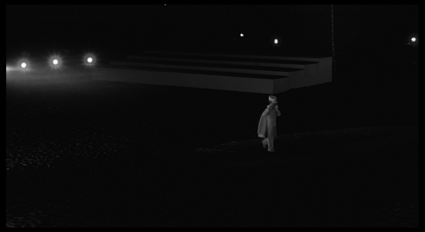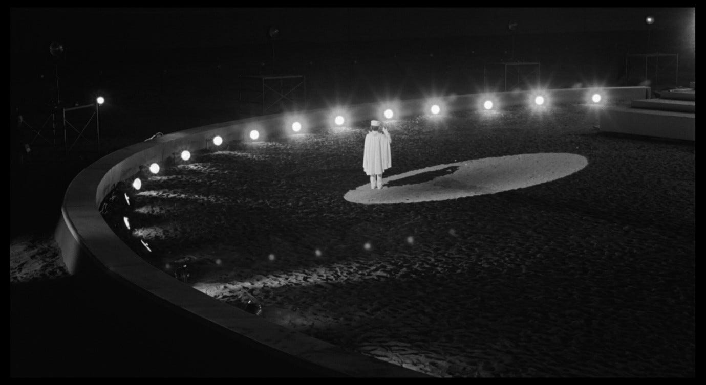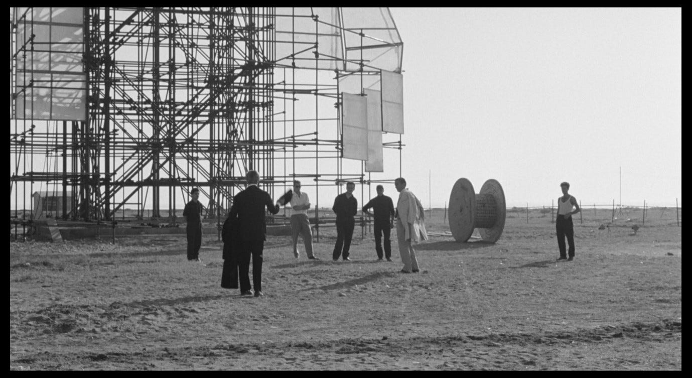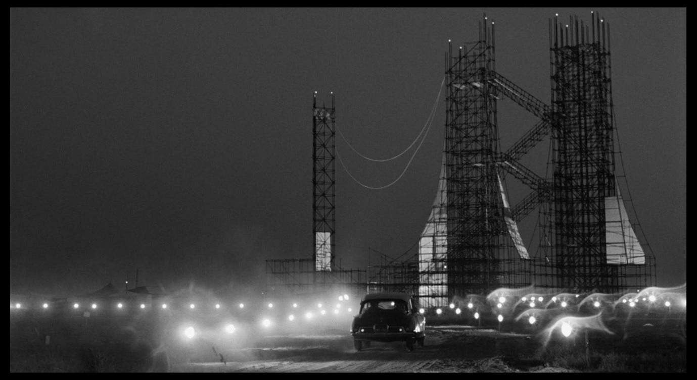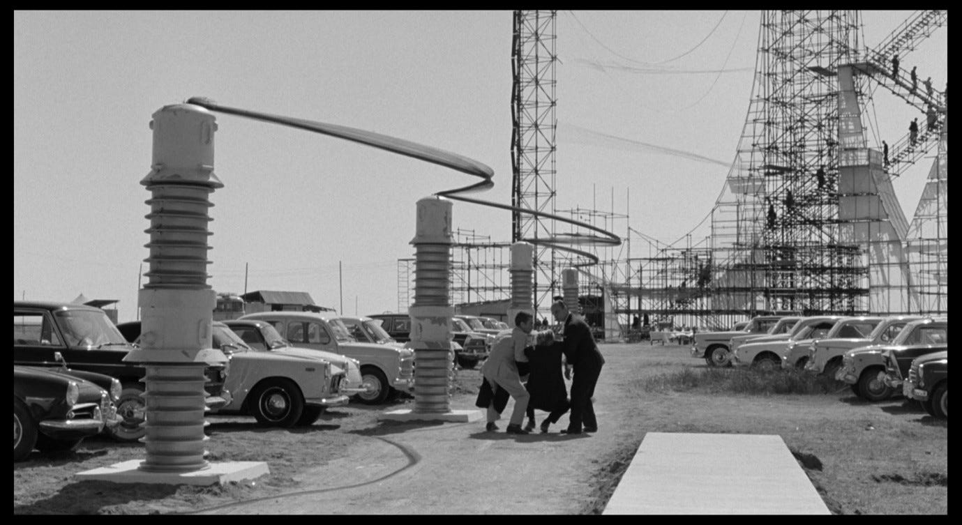 Guido Anselmi, the director around whose creative crisis 8½ revolves, is trying to make a science fiction film about the remnants of humanity escaping in a spaceship after a thermonuclear war. A huge set has been built to accommodate the spaceship: a night-time visit to this set shows it surrounded by blinding lights whose coronas look like other-worldly cauls, and on the soundtrack we hear (in John Stubbs’ words) ‘the quivering electronic music we associate with eerie moments in science fiction movies.’9