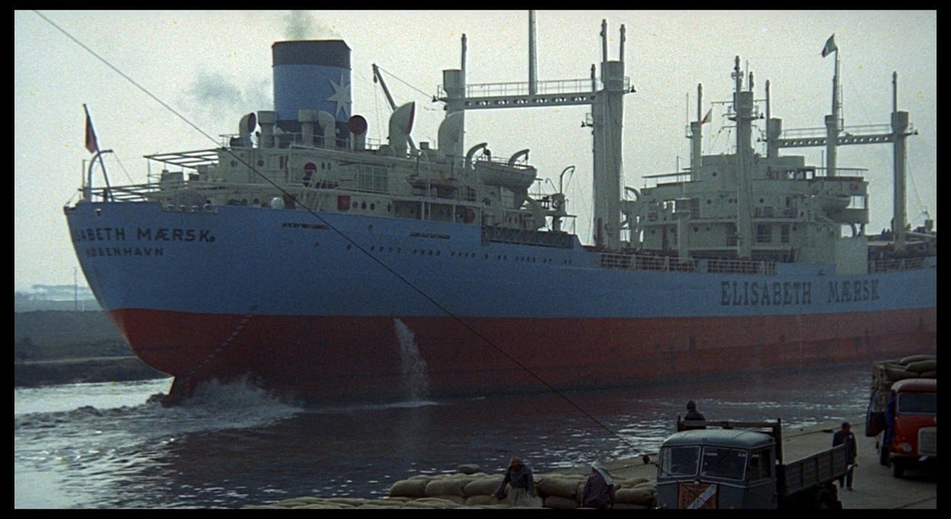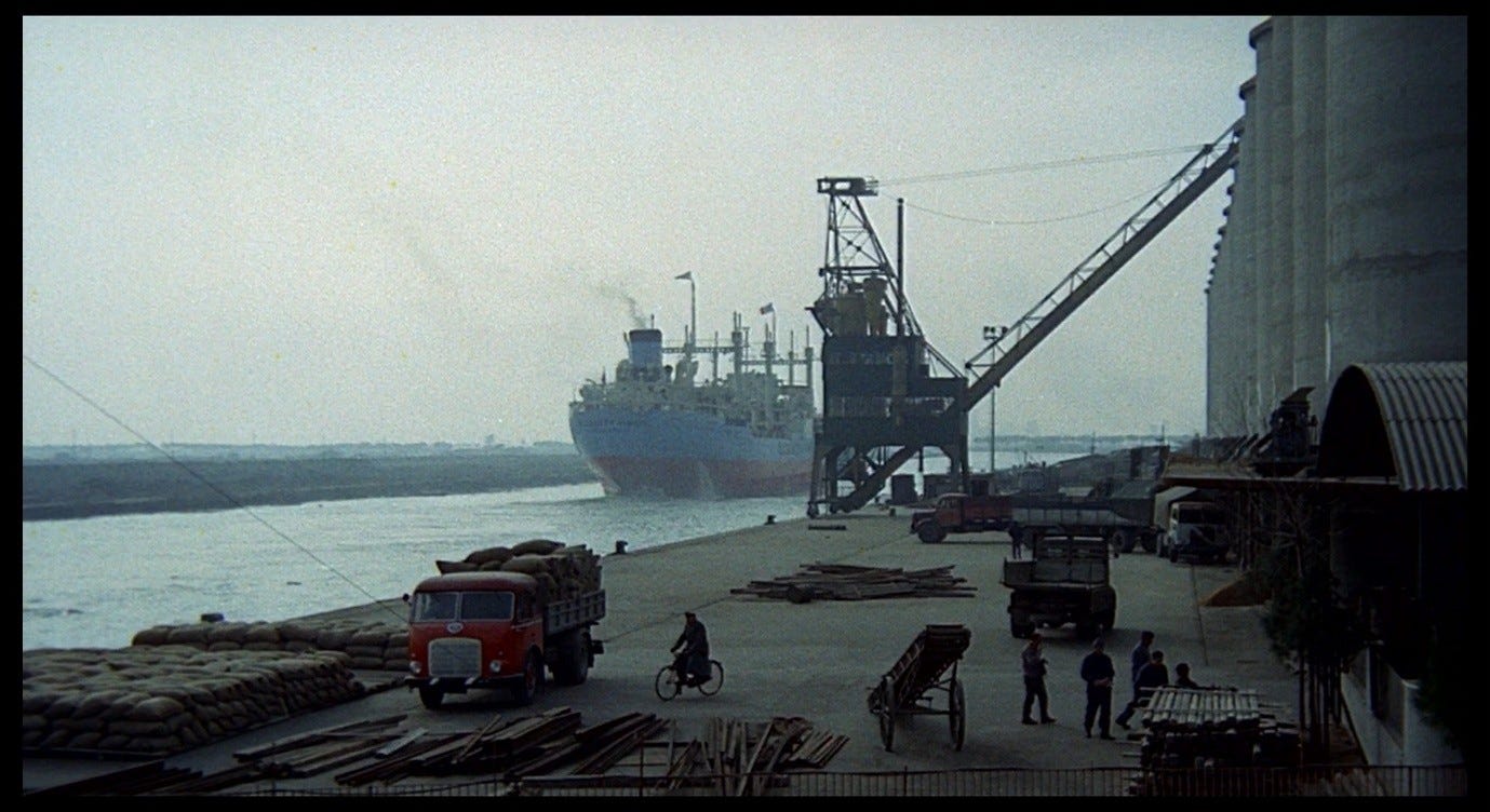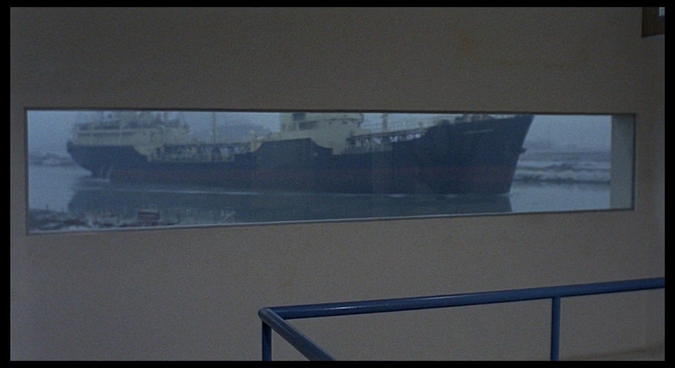 At this point in history, when there is no more mapping left to do in the world, a vessel has little choice but to trace a journey from one point to another, unless it operates within a fantasy about discovering new, uncharted territory ‘beyond this world.’ After we see the huge tanker outside Giuliana’s window, the next shot gives us a wider perspective of the Ravenna port, whose monochrome appearance reflects the industrial singleness of purpose as well.