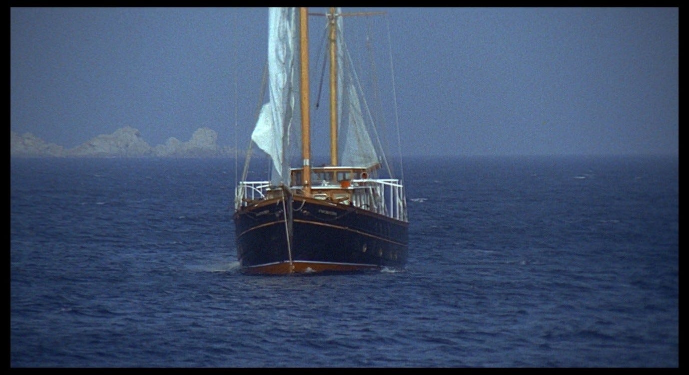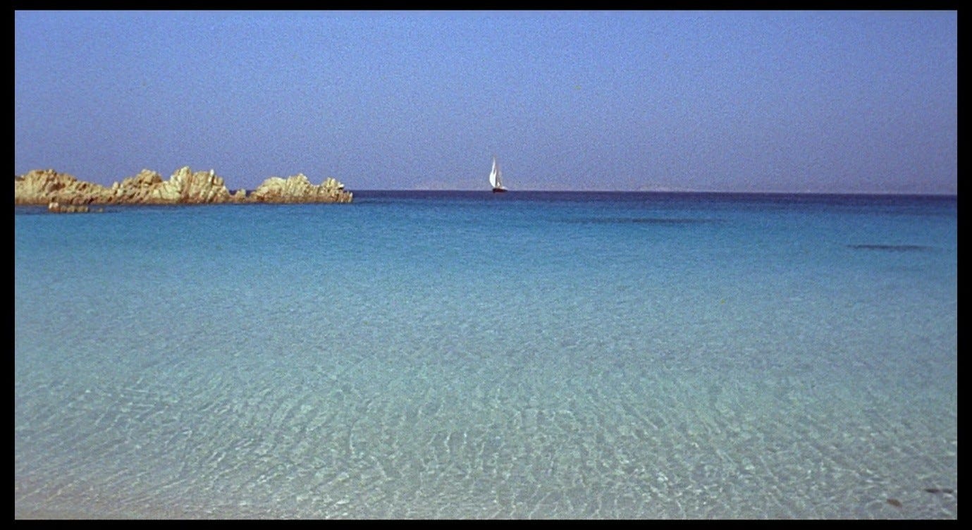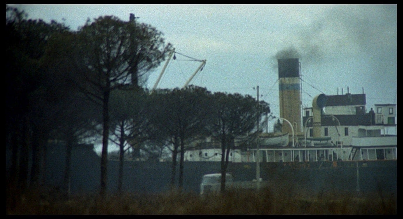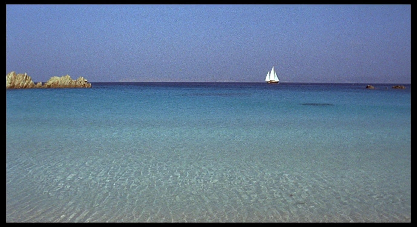 After the pink beach, the colours in this image – even Giuliana’s red hair – seem exceedingly drab, and when we cut to the reverse-shot of the docks, the huge tanker outside makes for a depressing contrast with the vero veliero that visited the fantasy cove.