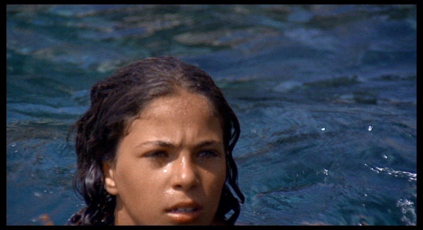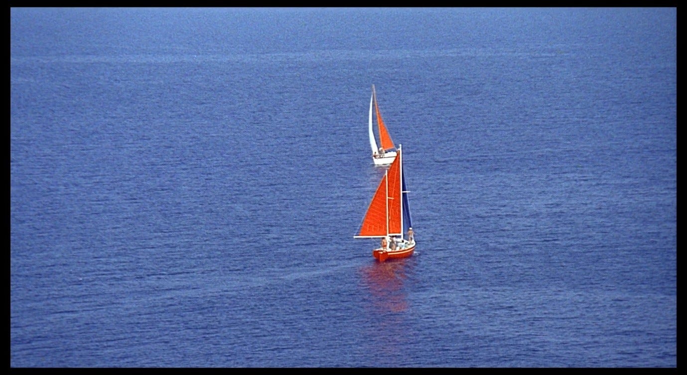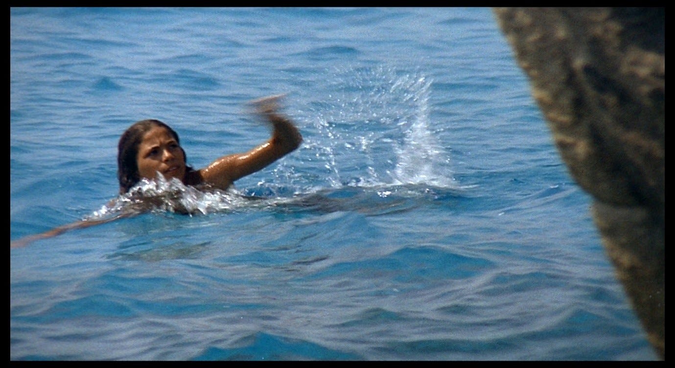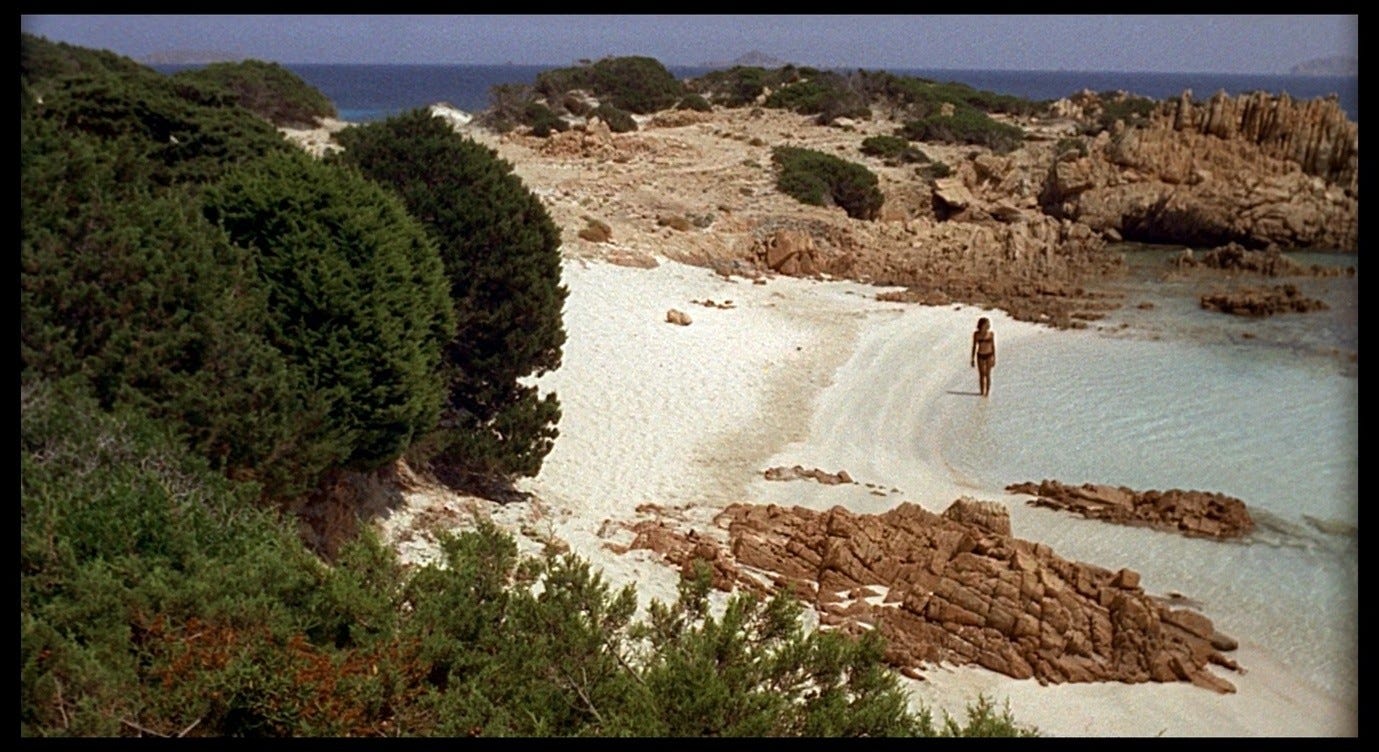 After the pink beach, the colours in this image – even Giuliana’s red hair – seem exceedingly drab, and when we cut to the reverse-shot of the docks, the huge tanker outside makes for a depressing contrast with the vero veliero that visited the fantasy cove.