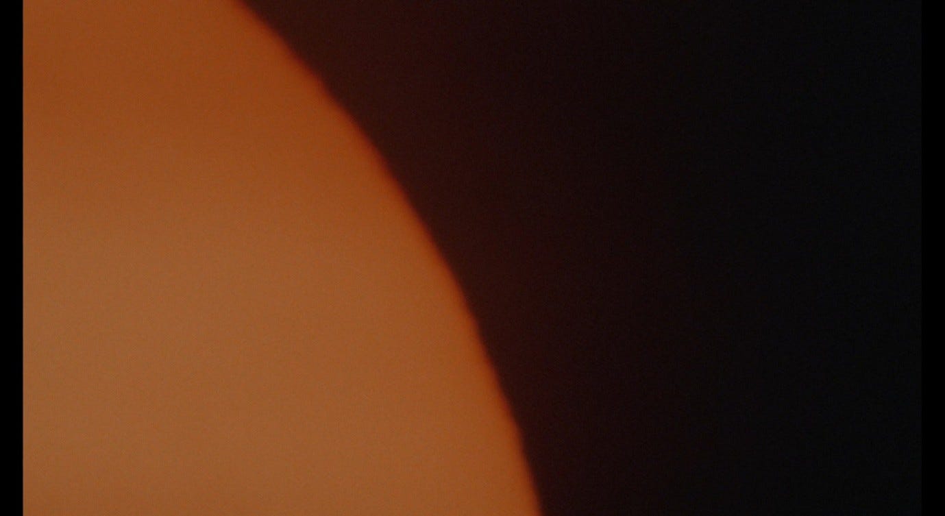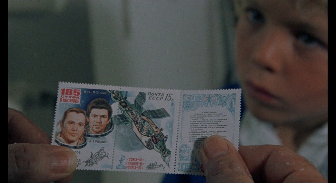 He shows his uncle a stamp commemorating the Russian astronauts who, in 1980, broke the record for the longest period of time spent in space (185 days). We hear the throbbing baseline and drumbeat of Japan’s ‘Sons of Pioneers’ on the soundtrack as Niccolò looks at a telescopic image of the sun. The fiery orange mass fills the left-hand part of the screen and emits a wavering reddish haze into the blackness on the right.
