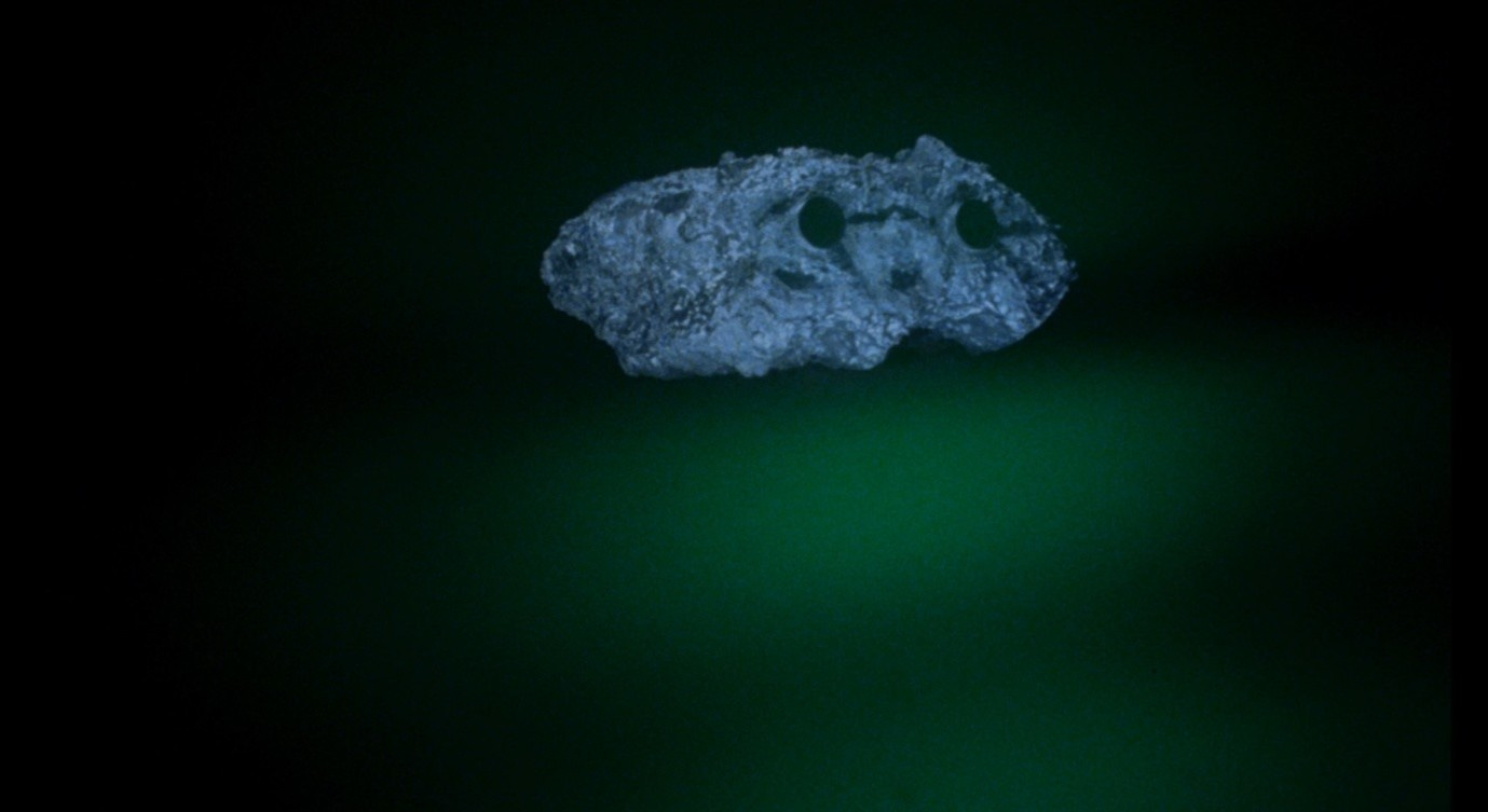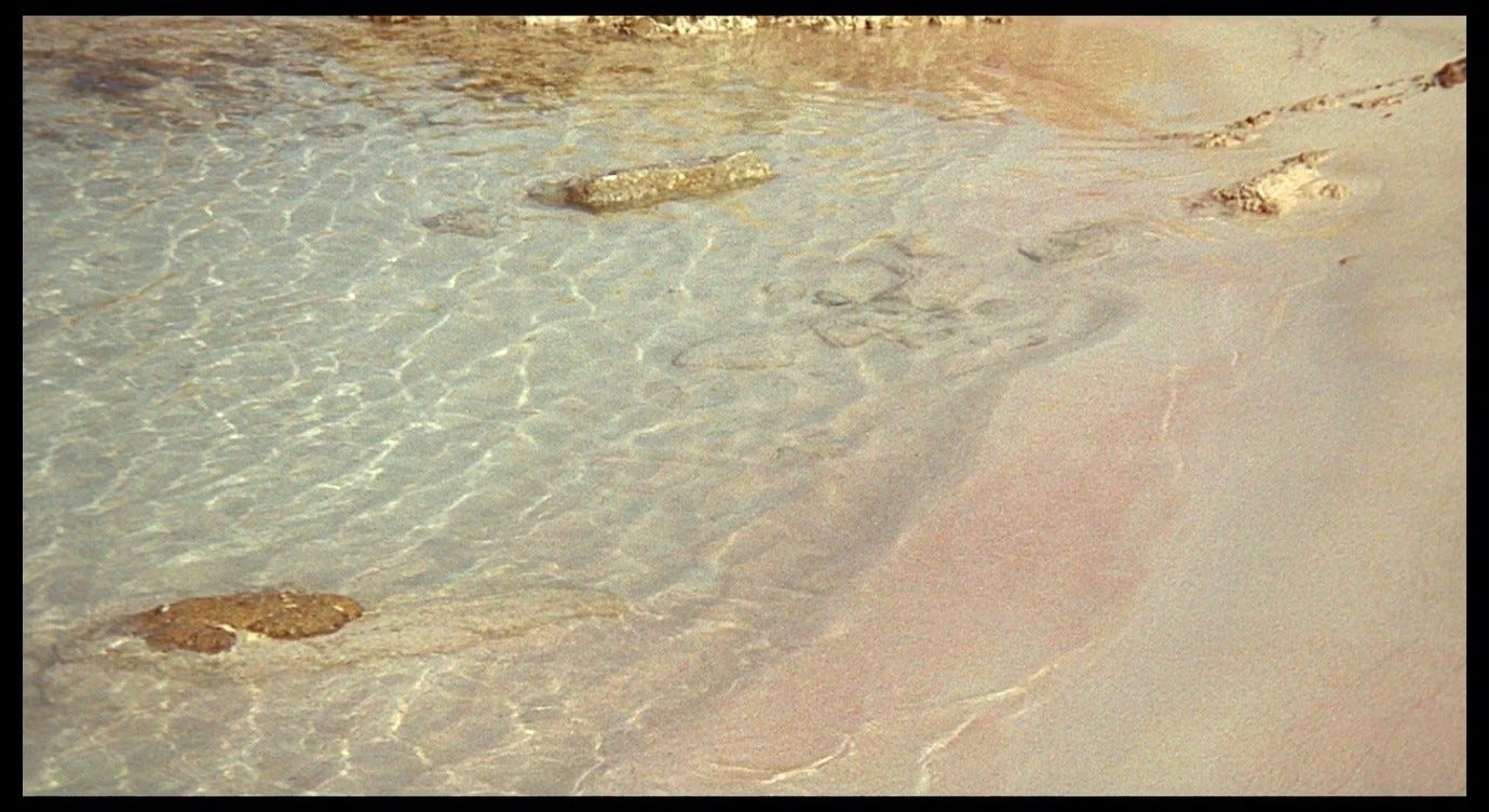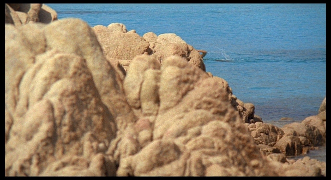 After one final, slightly haunting image of a rock that looks like a skull (peering out at us from the shadows), the image blurs out altogether as the camera pans over sea and rocks, dissolving everything into a continuous haze that transitions meaninglessly between blue and pink.