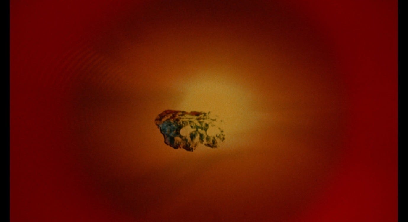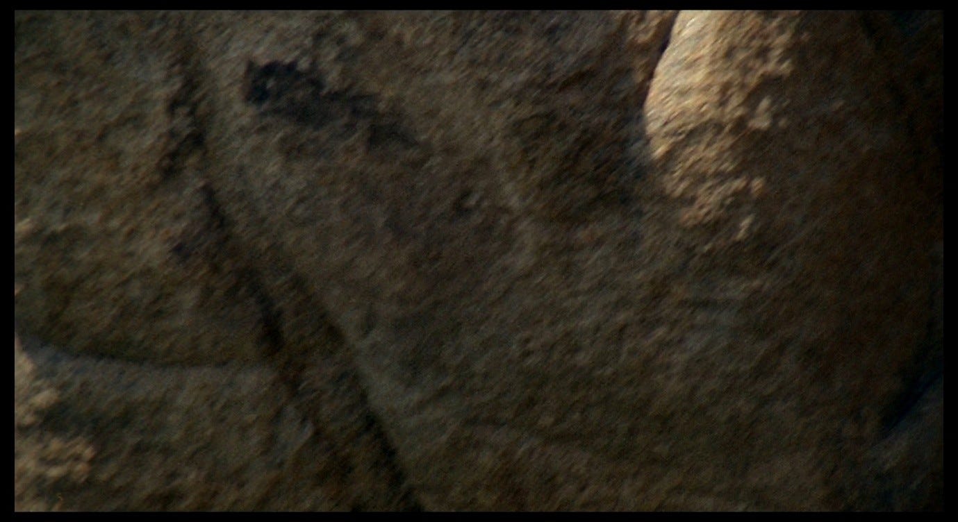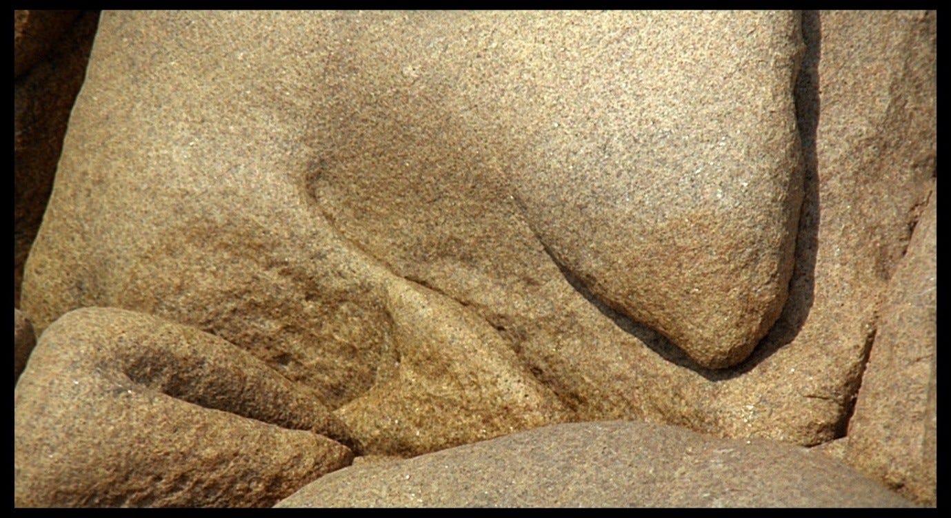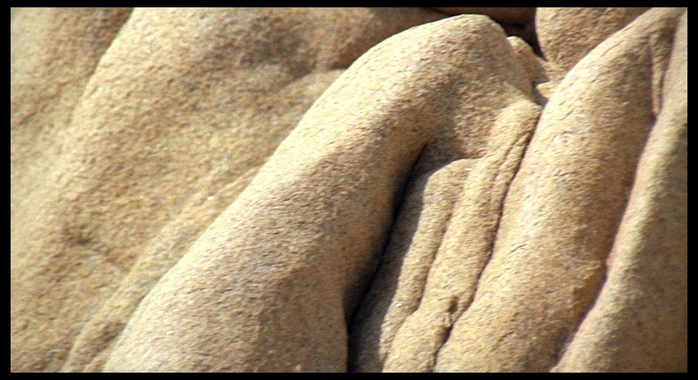 After one final, slightly haunting image of a rock that looks like a skull (peering out at us from the shadows), the image blurs out altogether as the camera pans over sea and rocks, dissolving everything into a continuous haze that transitions meaninglessly between blue and pink.