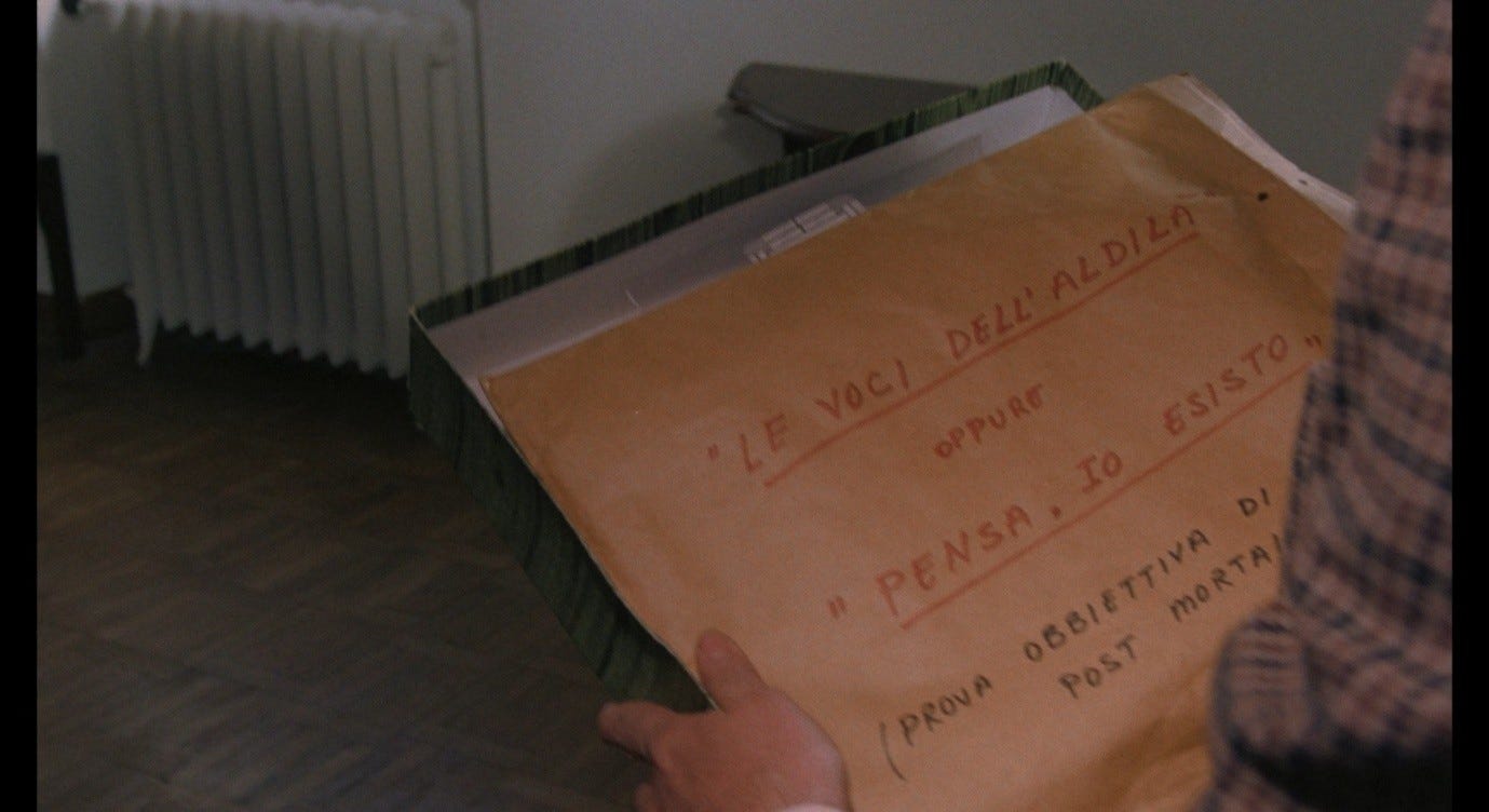 Suppose we do discover the ragione operating within the sun, within the world, and within human relationships? What happens after that? We might remember the unsolicited film-script Niccolò received, Voices from the Beyond; or, Think, I Exist (objective proof of life after death). A letter accompanying the script said the director would have total creative control, and provided a list of people who had communicated with ‘the unknown [ignoto],’ including Carlo di Palma, the cinematographer on Red Desert and Identification of a Woman.