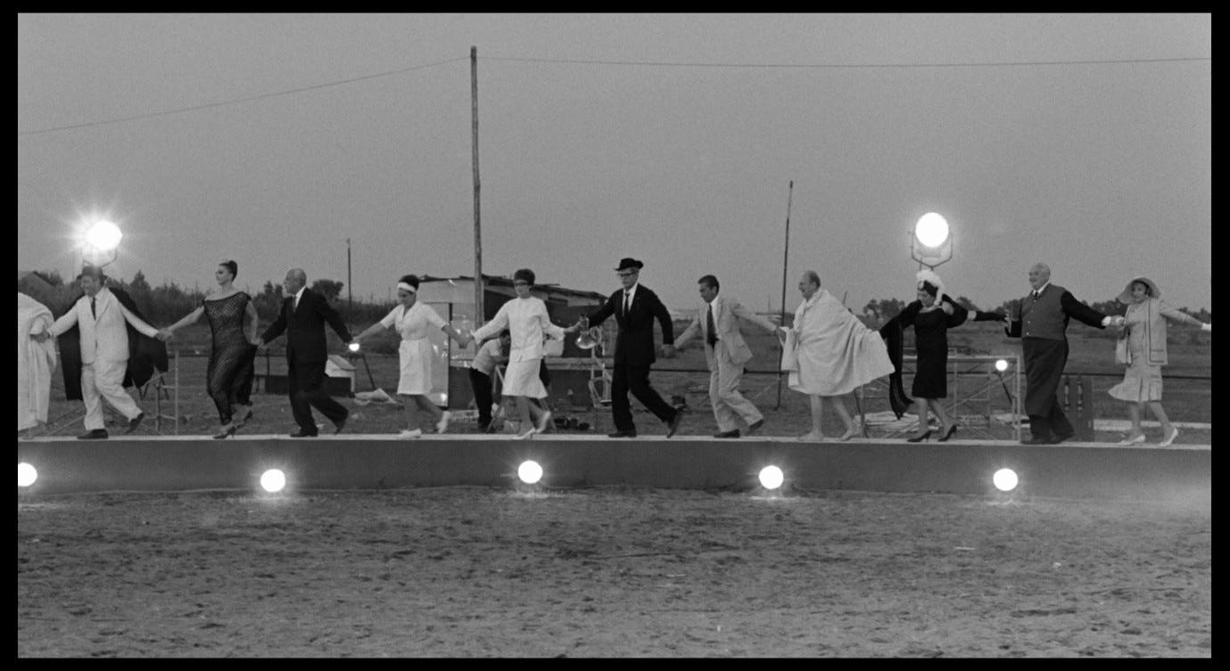This in turn triggers the redemptive ending of the film, in which all Guido’s loved ones magically appear, descending from the tower rather than ascending into it, as though they were disembarking from the spaceship. They dance, with Guido, hand-in-hand around a circus ring, until darkness falls and we are left with only a little boy playing a flute in a gradually fading spotlight.
