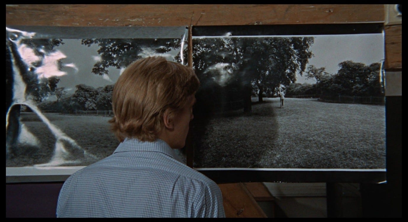 In Red Desert, we seem to be seeing the repeated surf-images from the perspective of the young girl: she sees the wave, then immediately replays it in her mind from a closer angle, like the photographer in Blow-Up trying to comprehend the moment he has photographed by blowing it up and replaying it. Something about the image changes in the blow-up/replay process. The photographer is desperate to strip away the fantasy of the peaceful park and expose the violent truth underneath, but for him (as for X in Marienbad) it is impossible to ‘touch’ the reality he keeps trying to zoom in on without making it disintegrate.