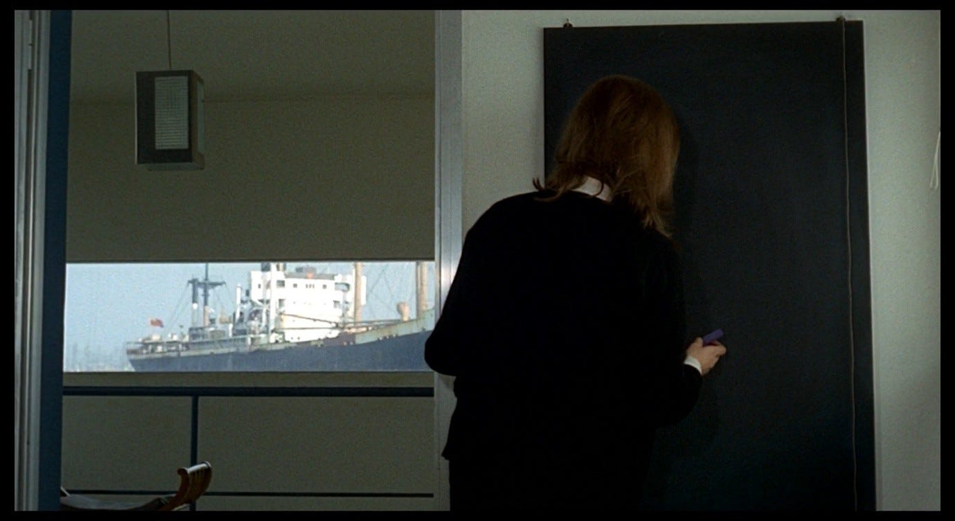 The windows of her apartment are featured prominently in this sequence, especially one wide, narrow window through which a ship can always be seen passing.