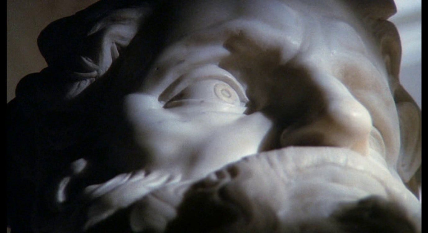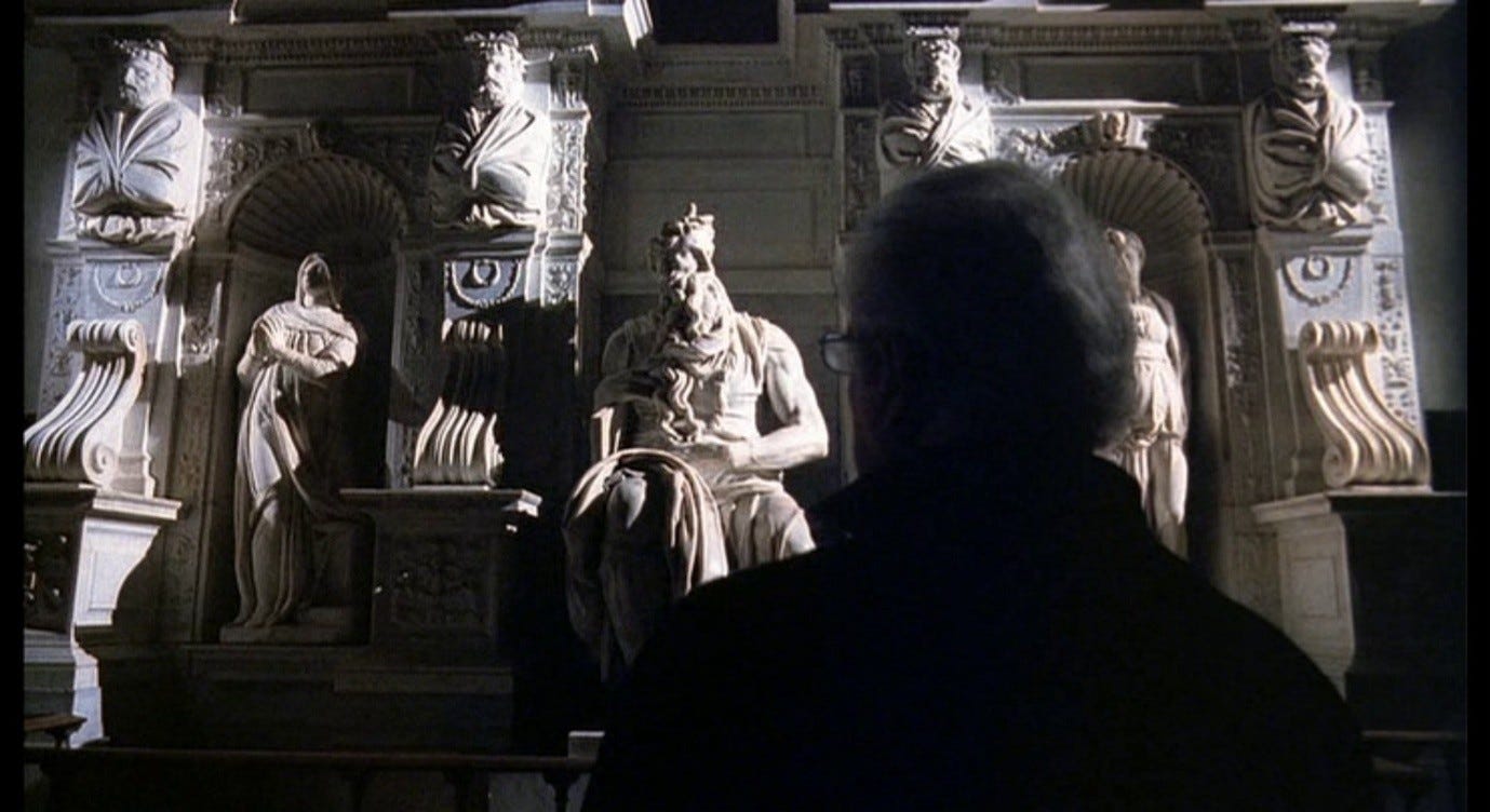 Antonioni’s hand touches the sculpted stone, but hesitantly, only daring to make contact with the edges of Moses’ cloak, the hand hovering in slow motion over the folds.