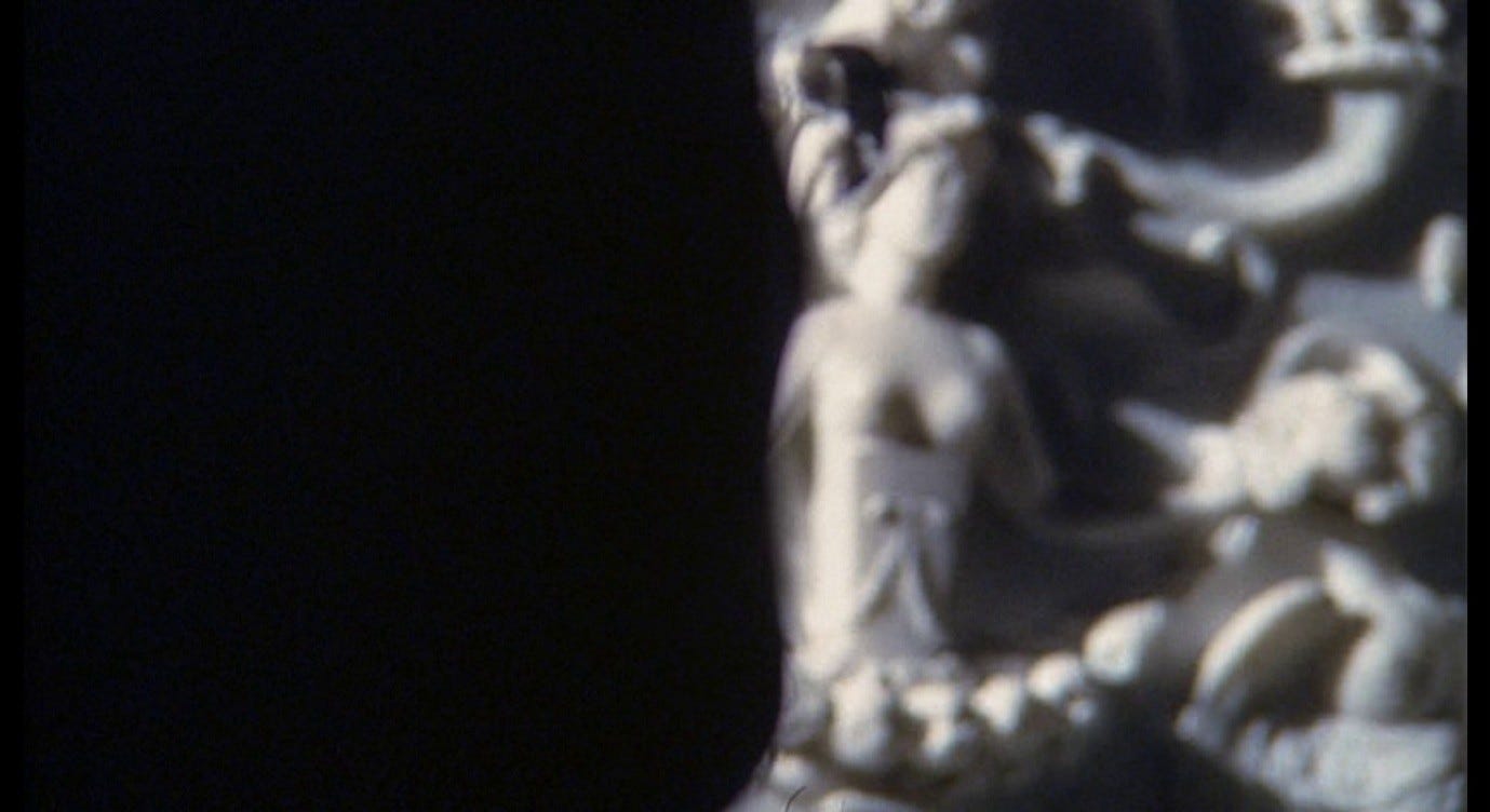 I think there is another – again, more pessimistic – connotation to these over-the-shoulder images. While the film does seem to invite us to look through Antonioni’s eyes, the clarification that it in fact invites us to look through his glasses stresses the difference between these two acts of looking-through. Glasses are meant to bring the object of the wearer’s gaze into focus, but for all the focus-puller’s efforts, what we see through these glasses is always obscure. At the beginning of one shot, the view through the glasses seems distorted but not out of focus, while the sculpture itself is out of focus; then the focus shifts and the sculpture becomes clear, while the view through the glasses becomes blurred rather than stretched. Then the focus shifts again, and for a split-second we seem to see something clearly through the glasses – but this is soon replaced by darkness as Antonioni’s gaunt silhouetted face dominates the frame.